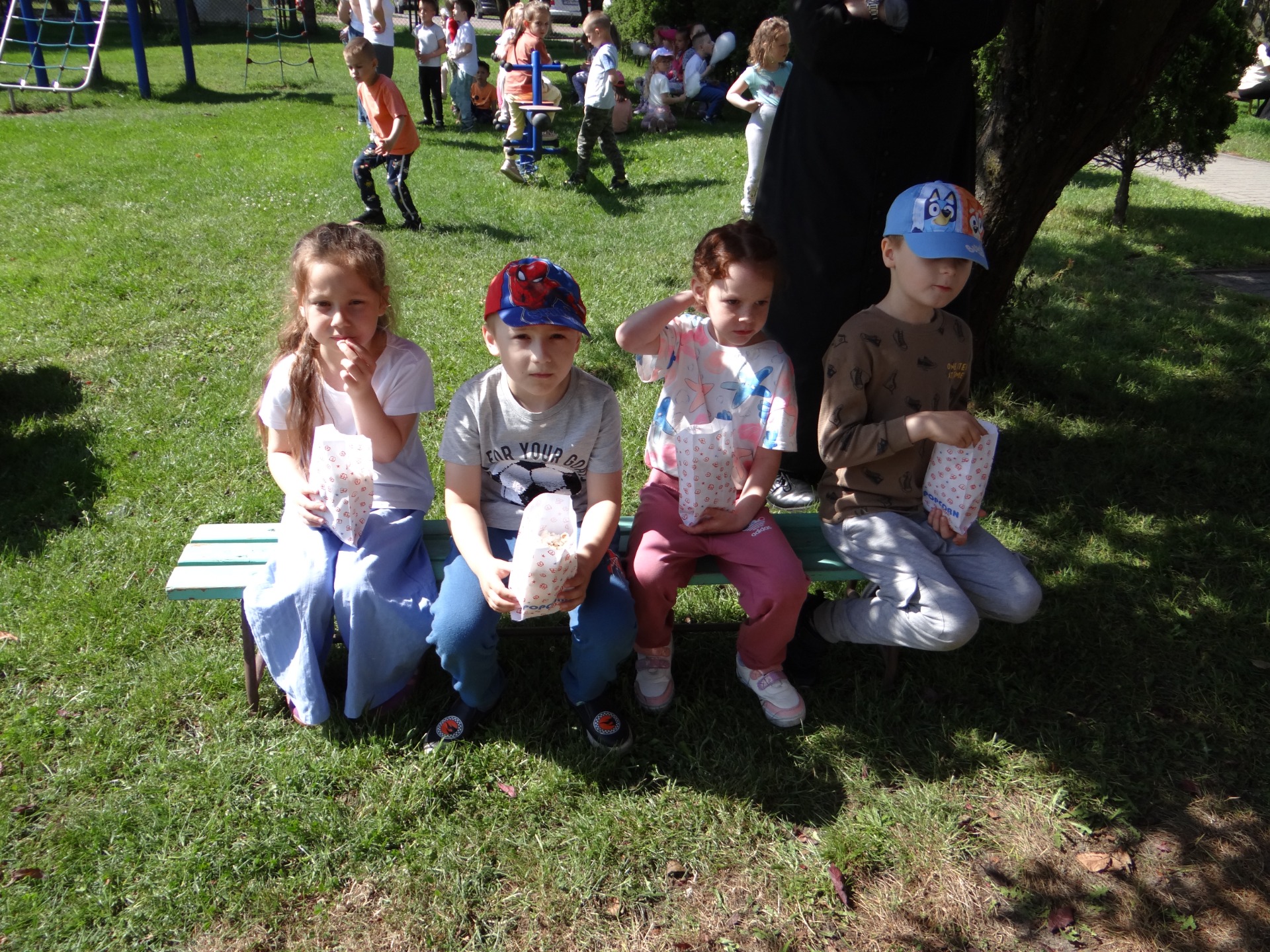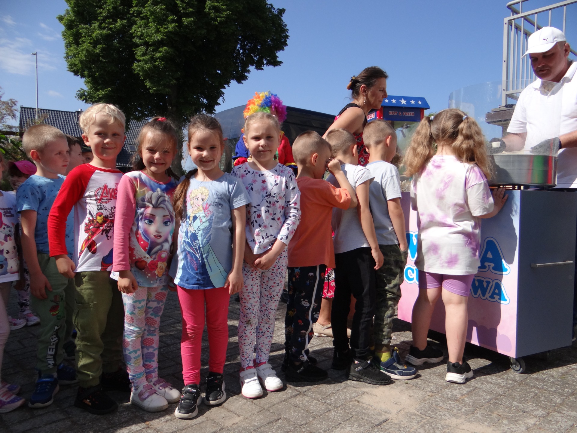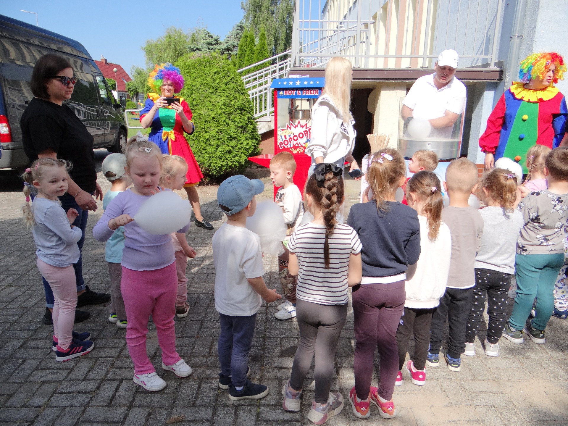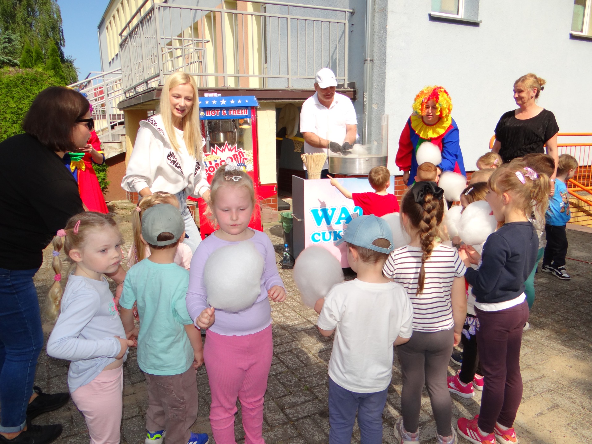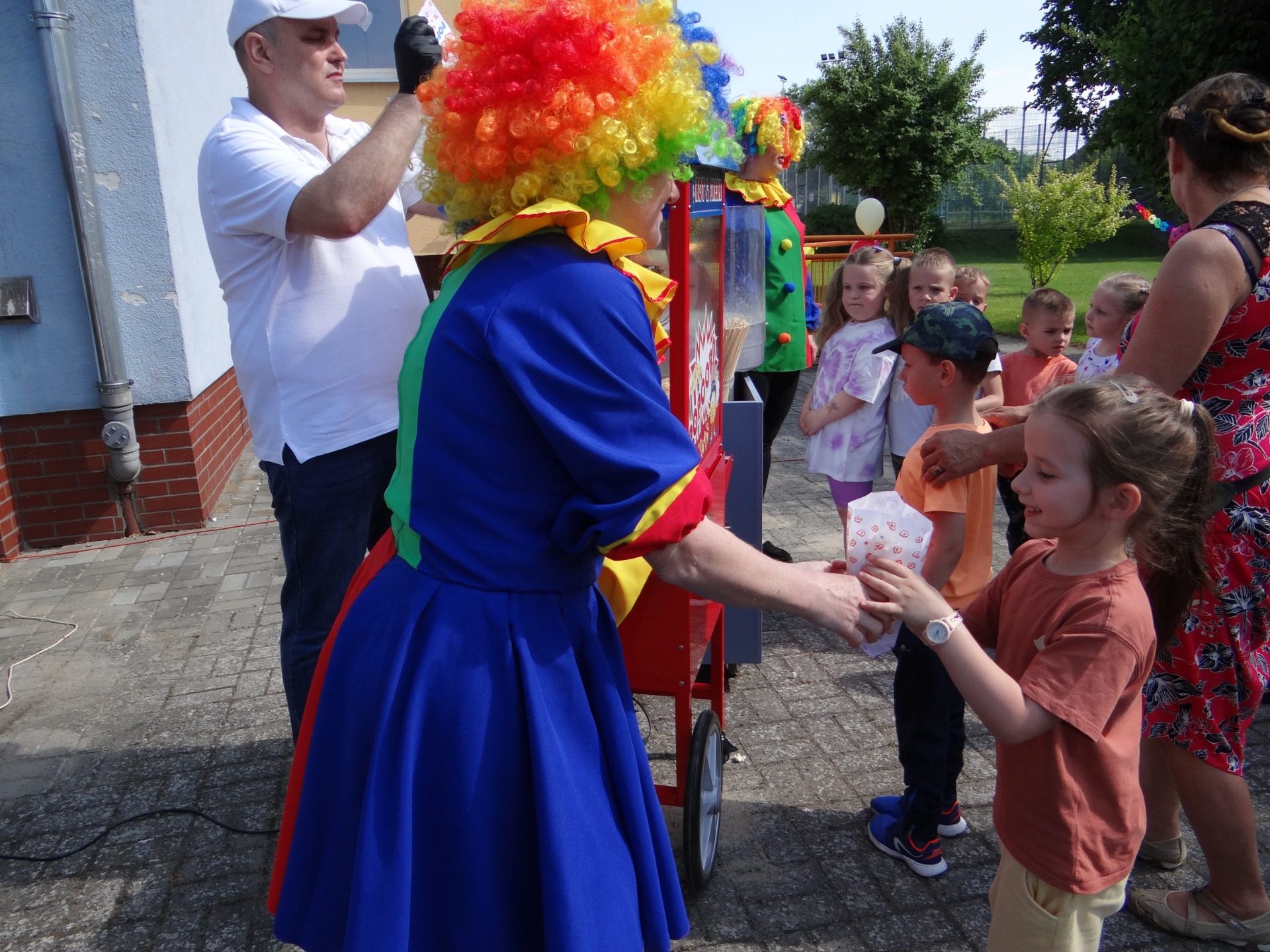 Na dzieci czekało wiele atrakcji: wata cukrowa, popcorn, lody oraz kolorowe bańki mydlane, które unosiły się w powietrzu, wywołując zachwyt i radość. Niespodzianką dla przedszkolaków była wizyta kominiarza – Pana Leszka Mazura, który przybył z workiem pełnym cukierków dla dzieci, wywołując wielkie poruszenie i uśmiechy na twarzach najmłodszych.