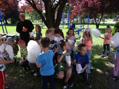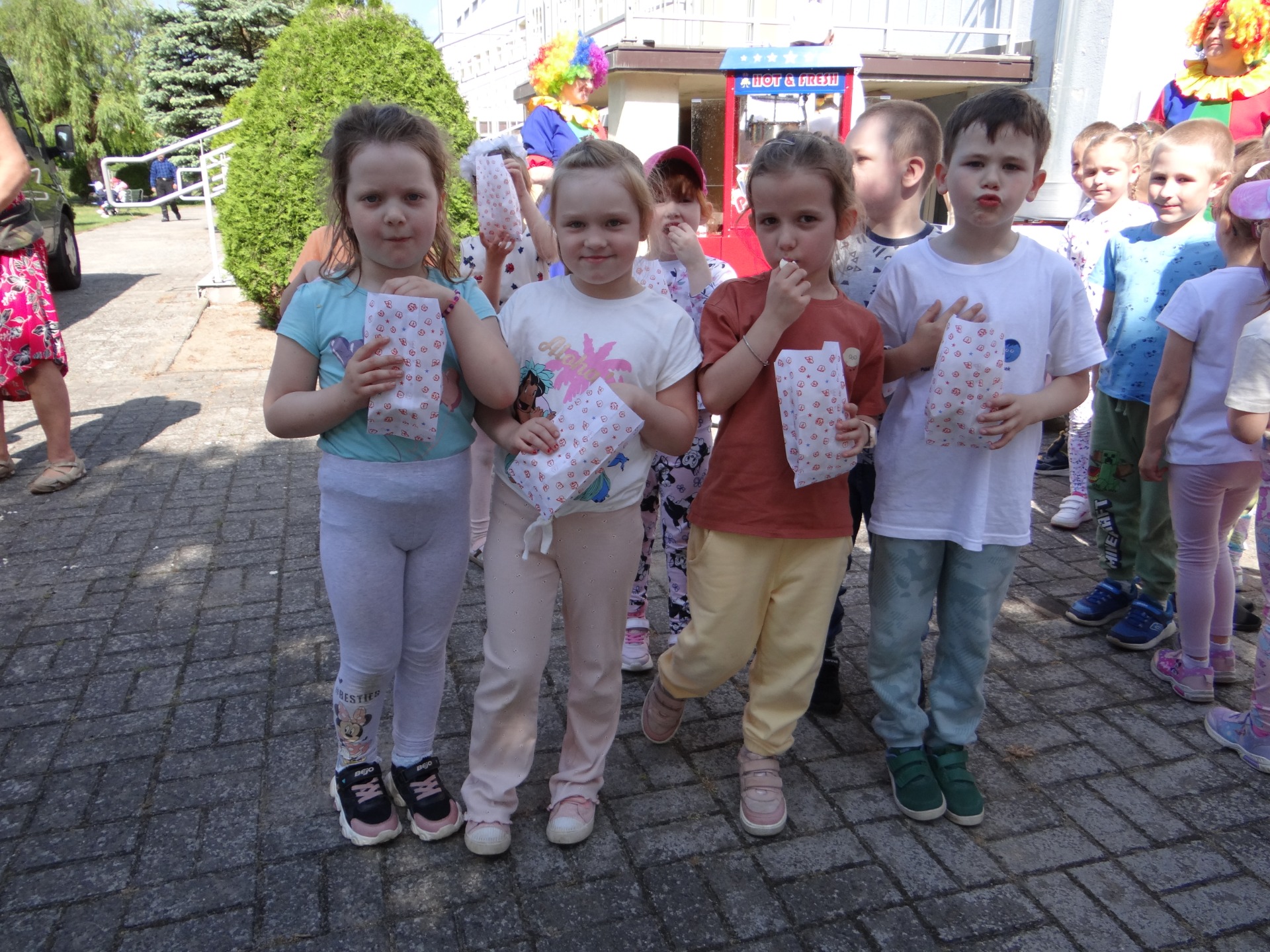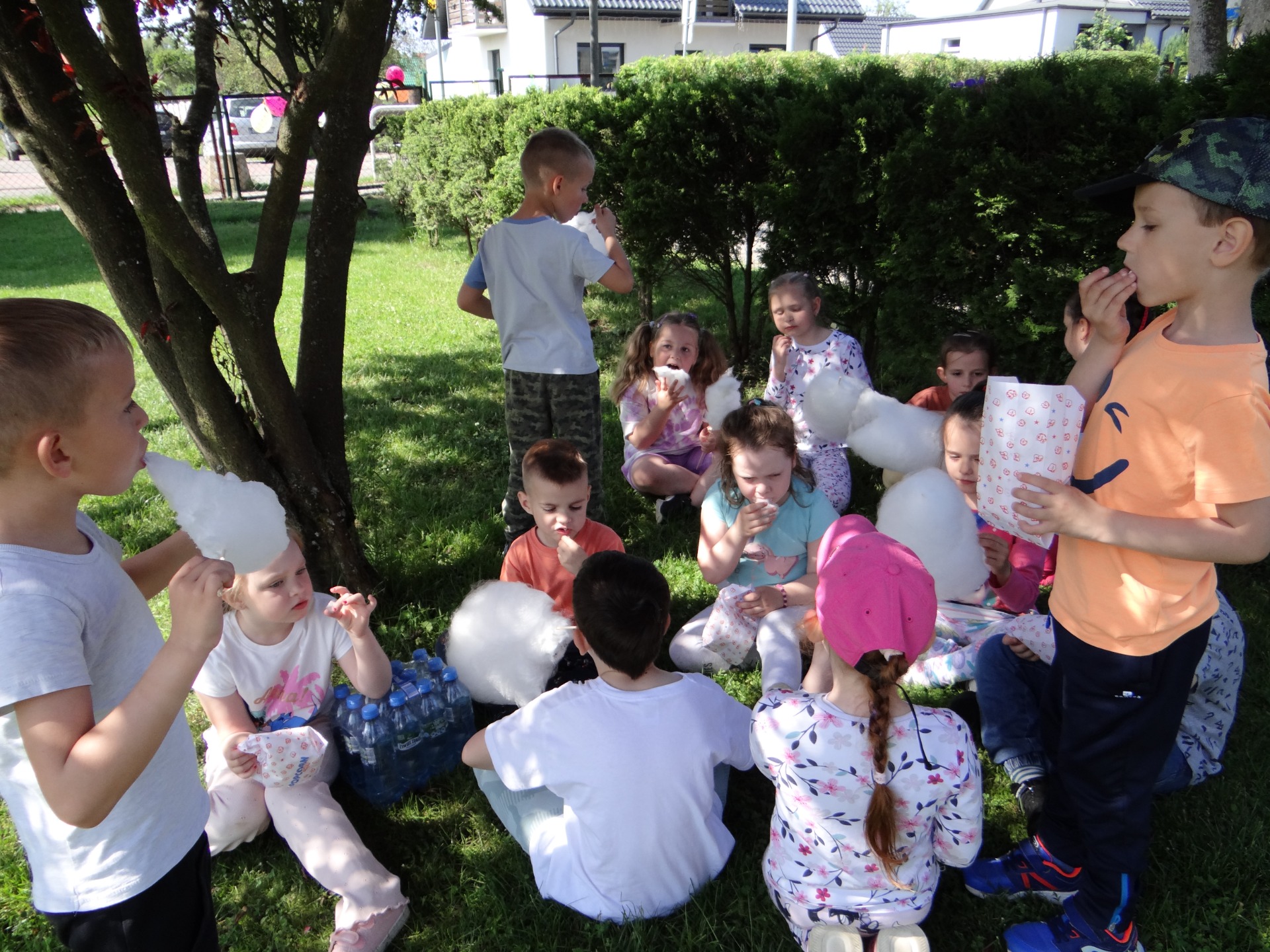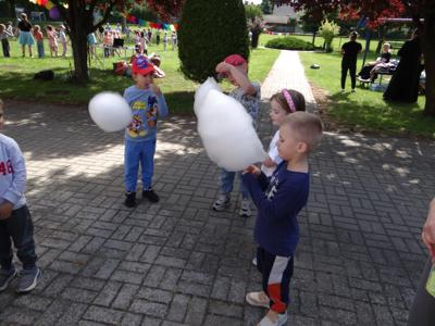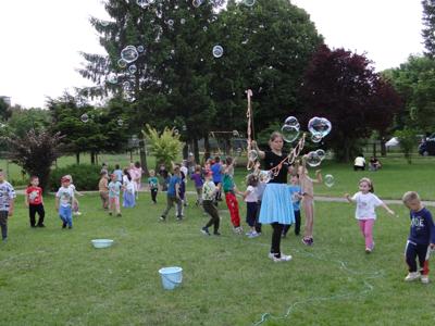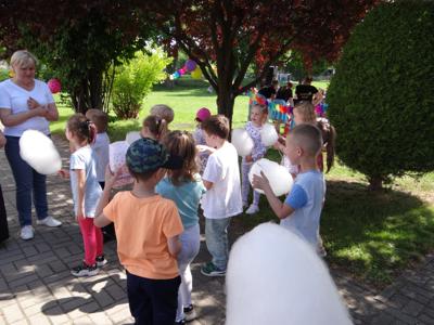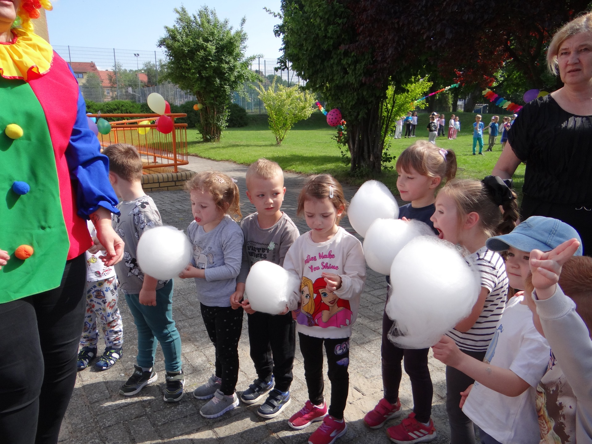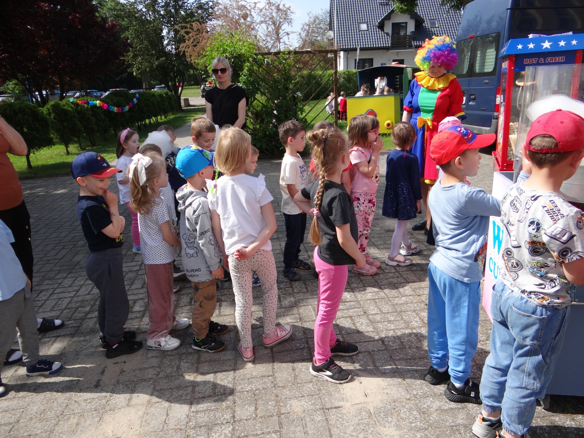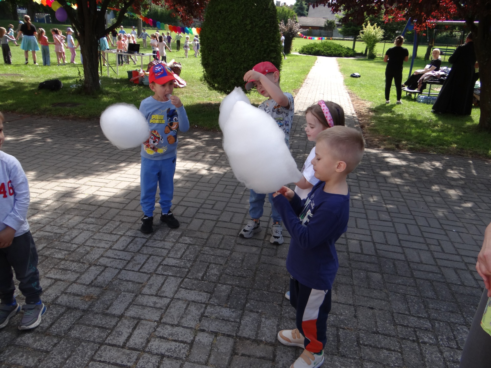 Na dzieci czekało wiele atrakcji: wata cukrowa, popcorn, lody oraz kolorowe bańki mydlane, które unosiły się w powietrzu, wywołując zachwyt i radość. Niespodzianką dla przedszkolaków była wizyta kominiarza – Pana Leszka Mazura, który przybył z workiem pełnym cukierków dla dzieci, wywołując wielkie poruszenie i uśmiechy na twarzach najmłodszych.