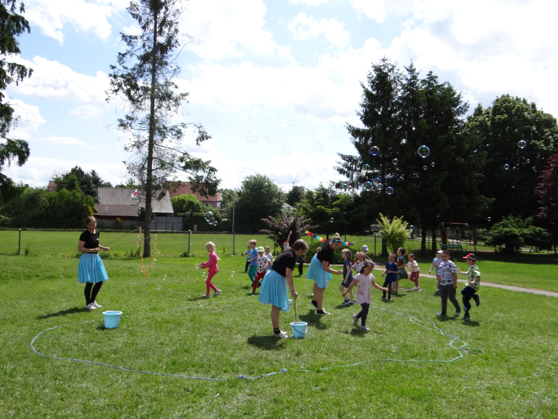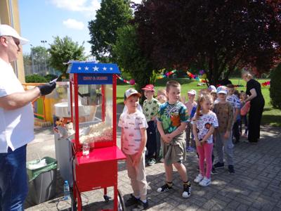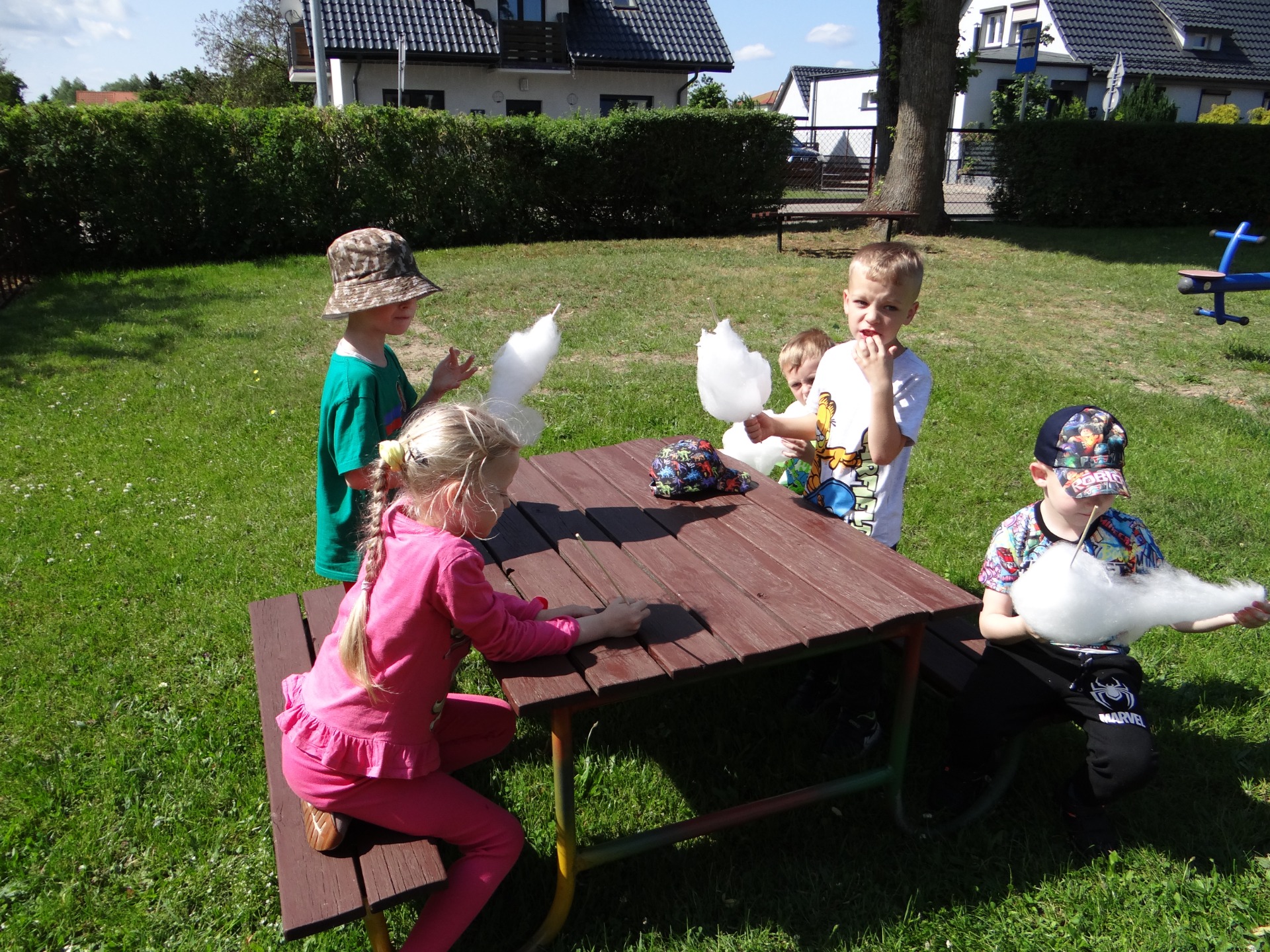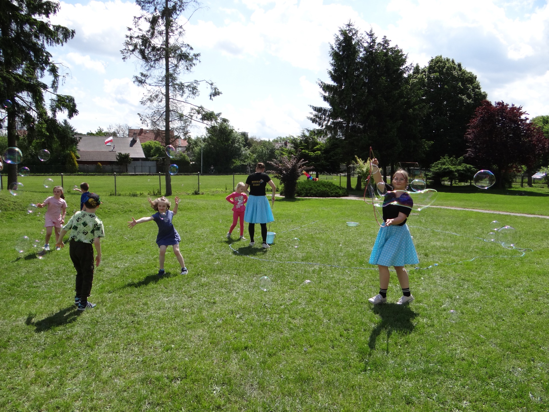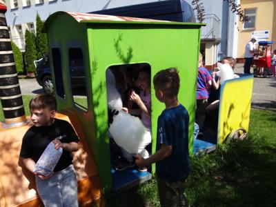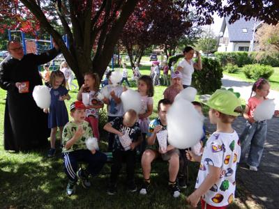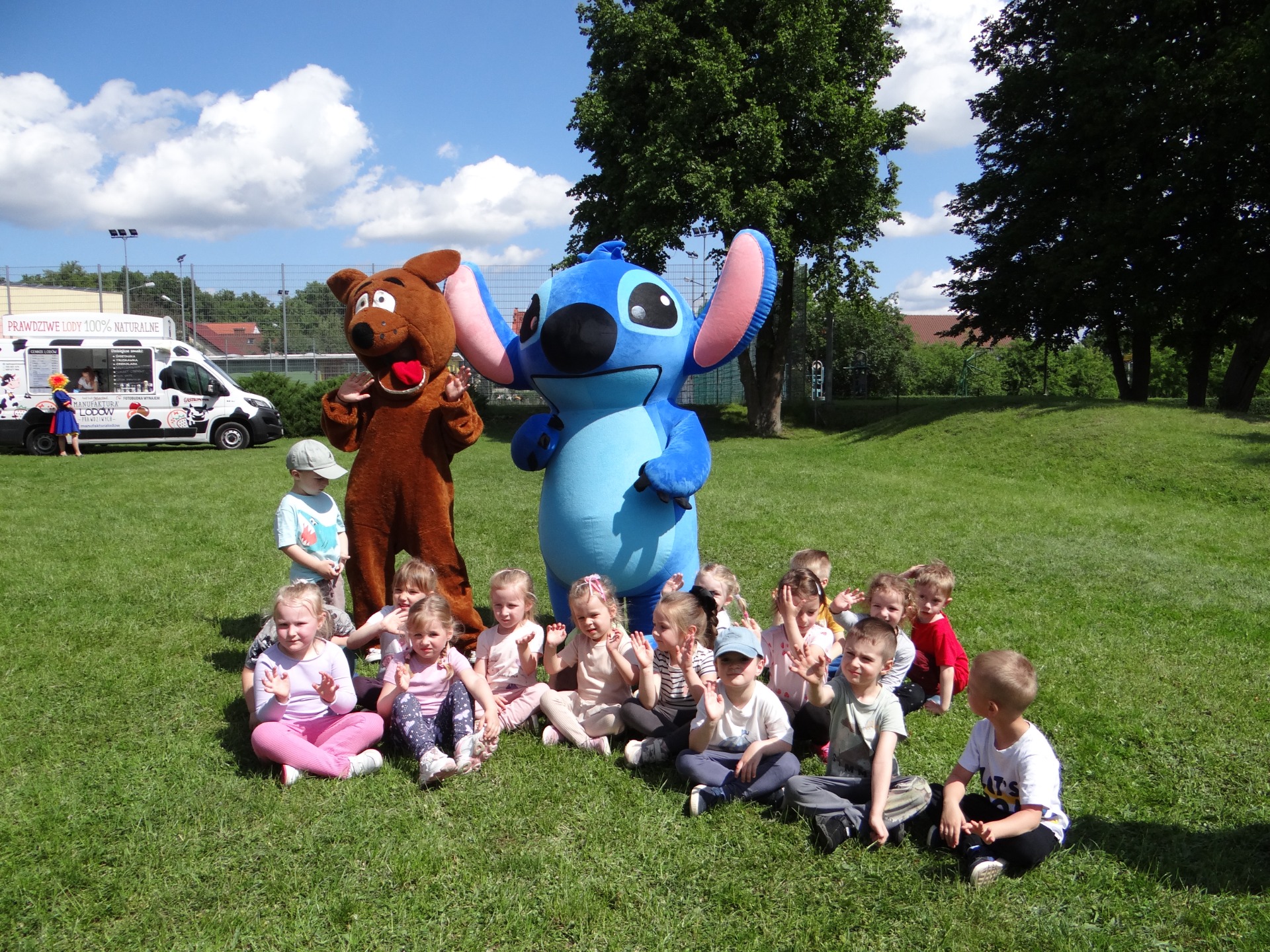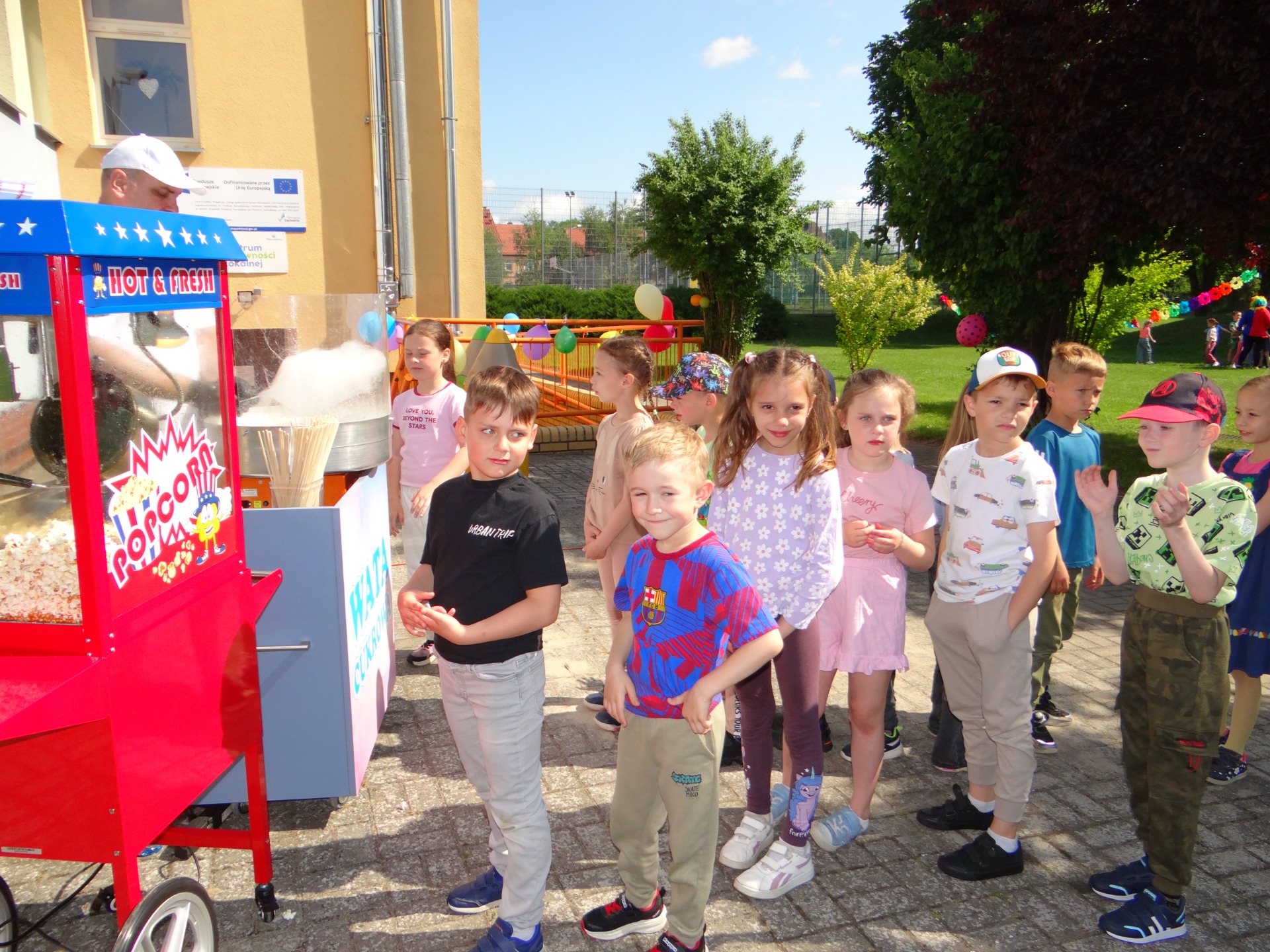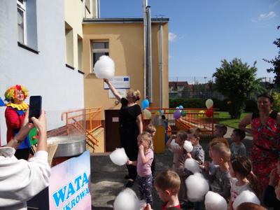 Na dzieci czekało wiele atrakcji: wata cukrowa, popcorn, lody oraz kolorowe bańki mydlane, które unosiły się w powietrzu, wywołując zachwyt i radość. Niespodzianką dla przedszkolaków była wizyta kominiarza – Pana Leszka Mazura, który przybył z workiem pełnym cukierków dla dzieci, wywołując wielkie poruszenie i uśmiechy na twarzach najmłodszych.