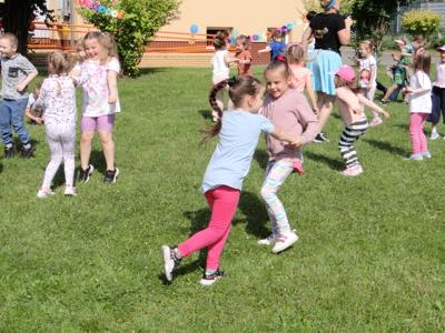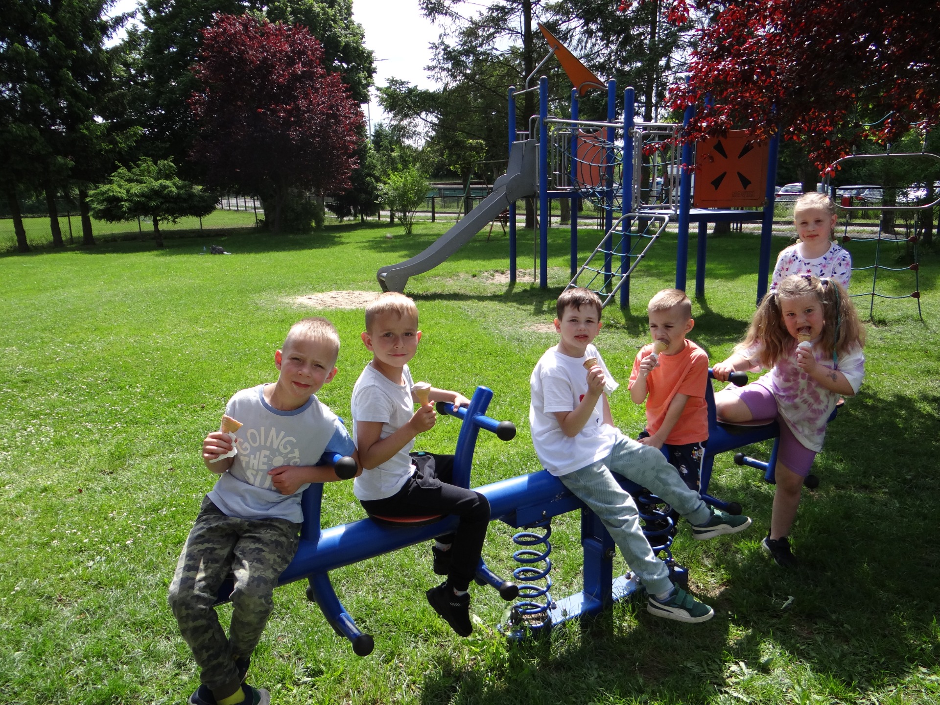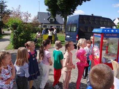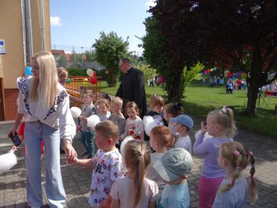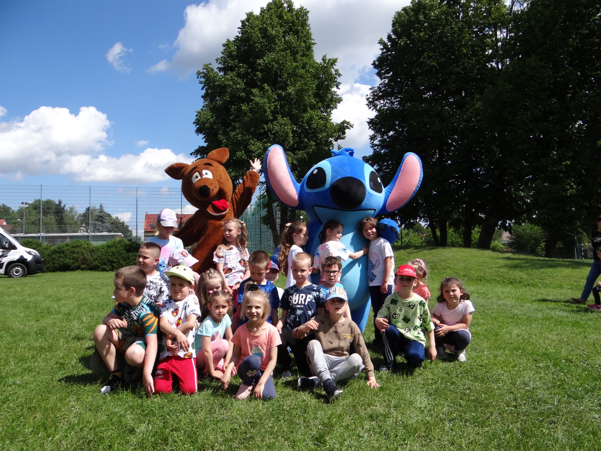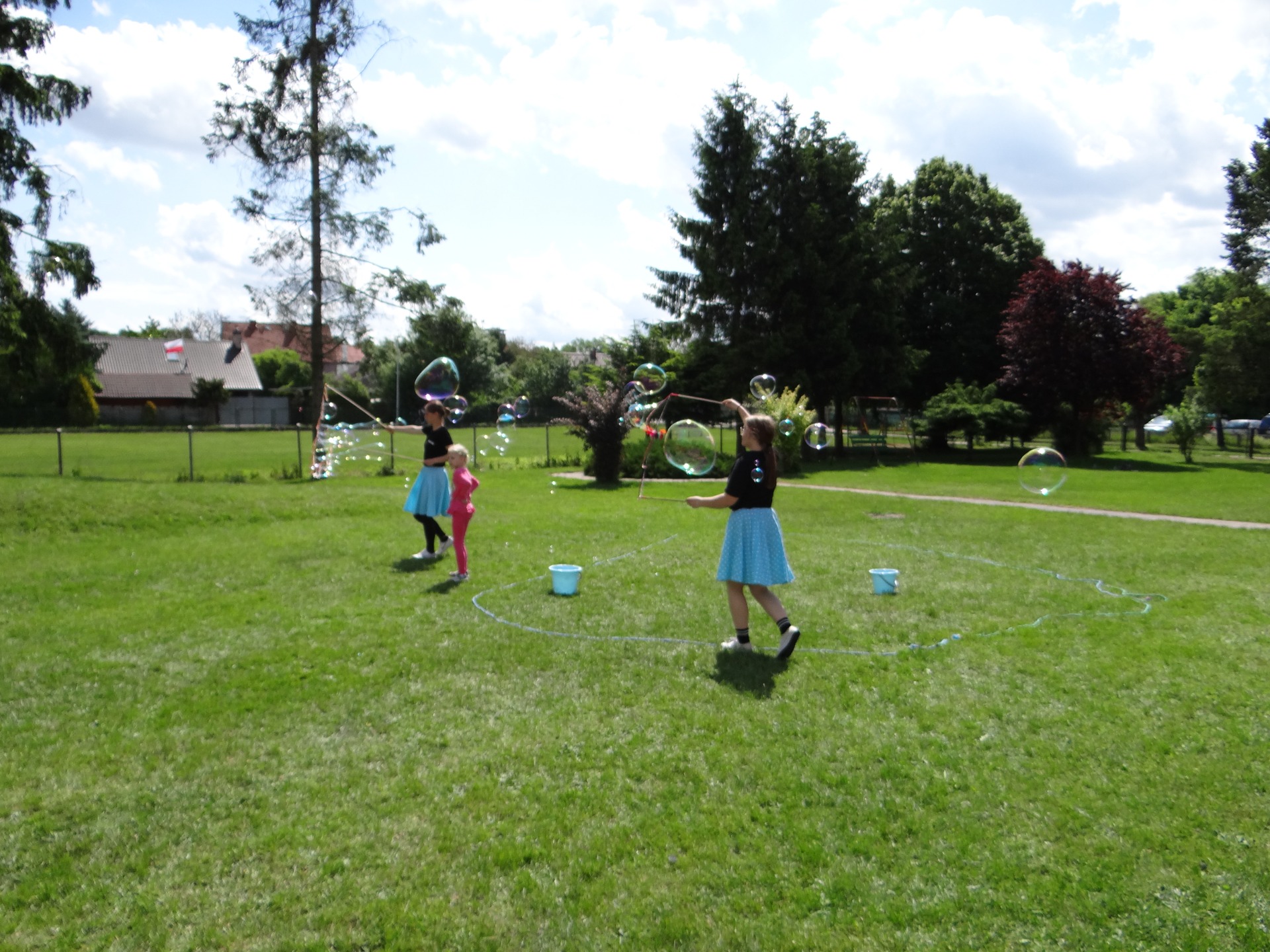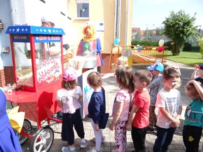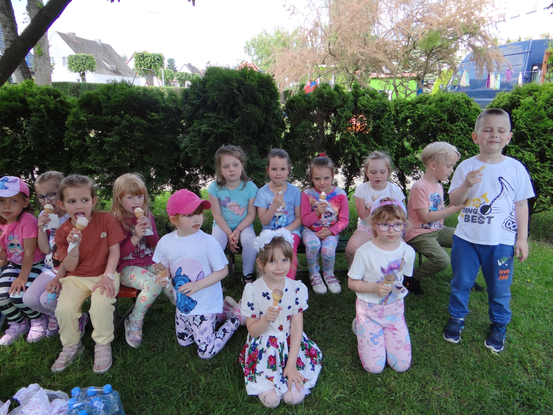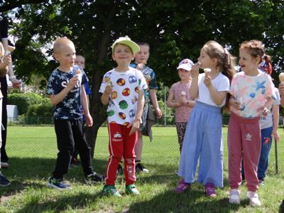 Na dzieci czekało wiele atrakcji: wata cukrowa, popcorn, lody oraz kolorowe bańki mydlane, które unosiły się w powietrzu, wywołując zachwyt i radość. Niespodzianką dla przedszkolaków była wizyta kominiarza – Pana Leszka Mazura, który przybył z workiem pełnym cukierków dla dzieci, wywołując wielkie poruszenie i uśmiechy na twarzach najmłodszych.