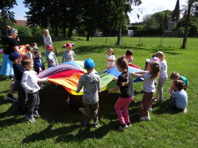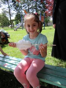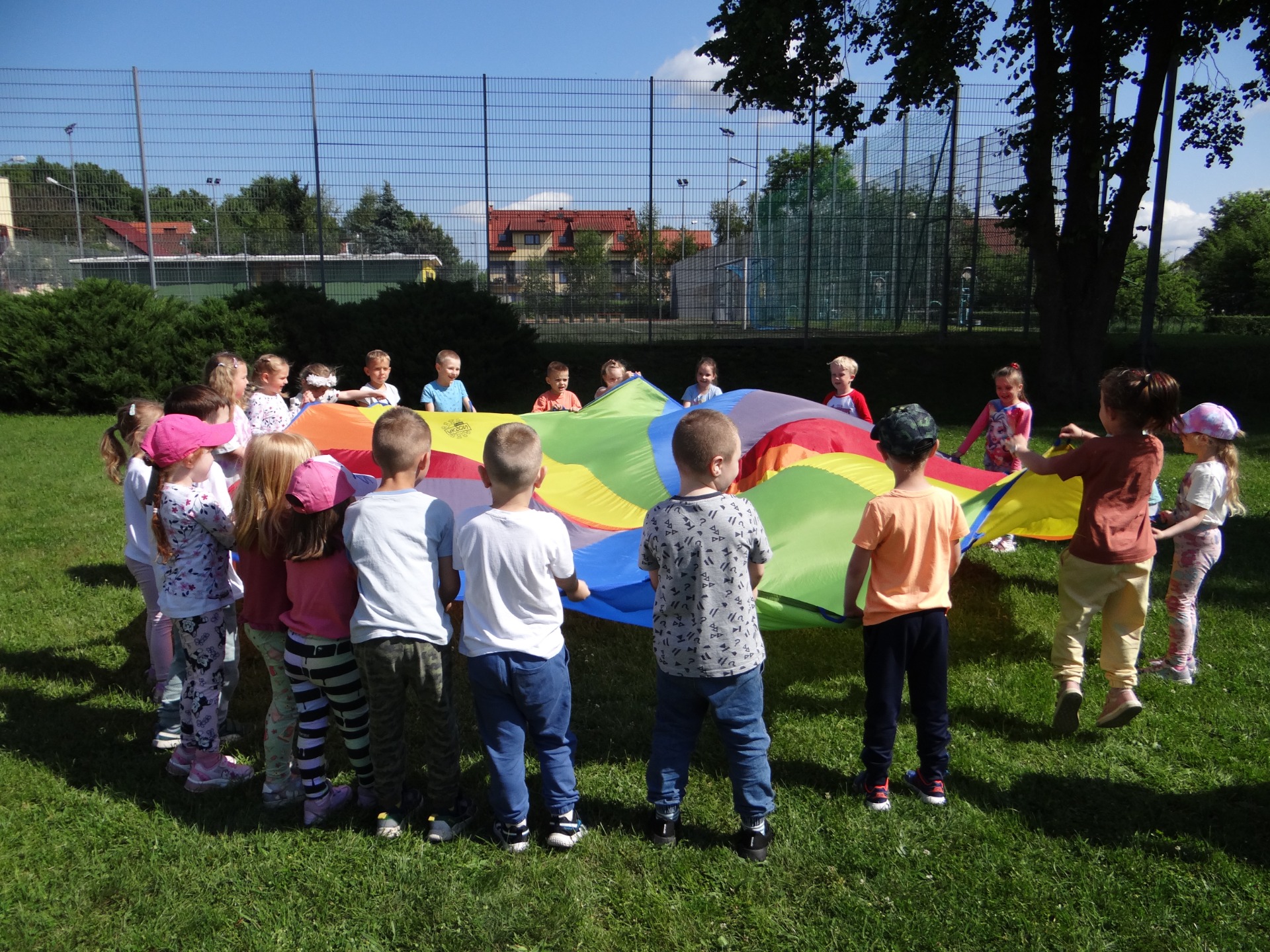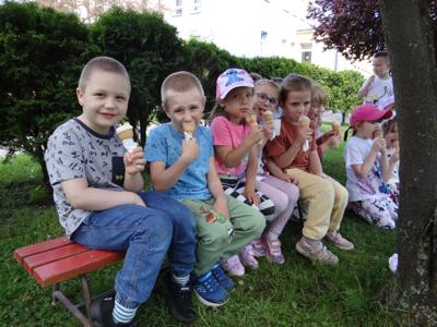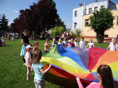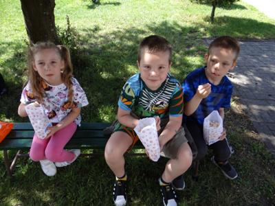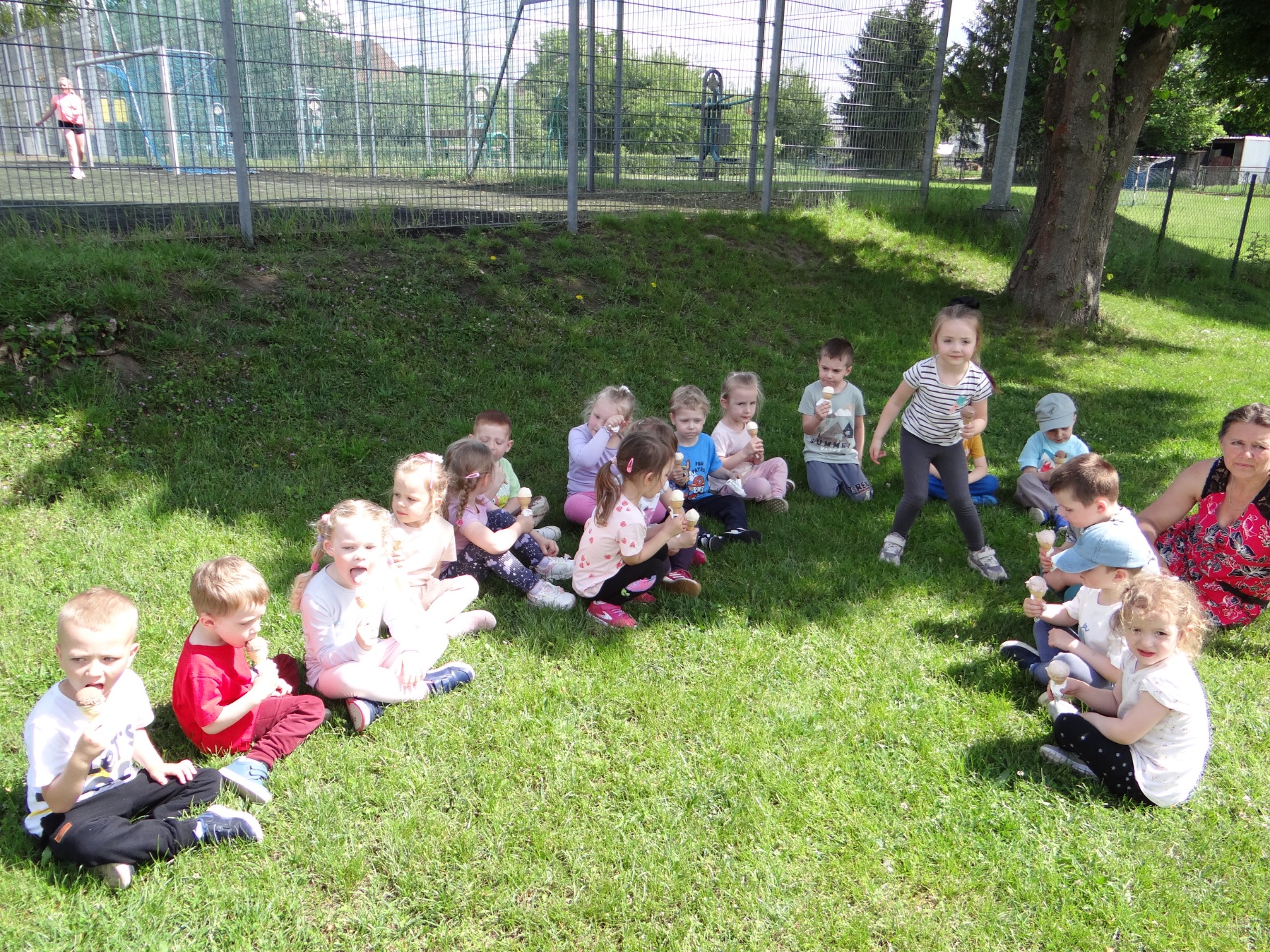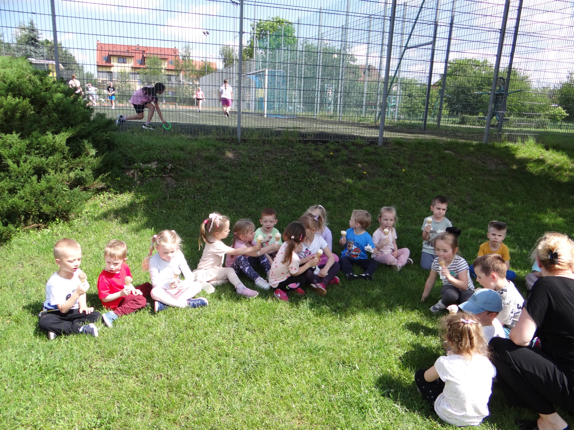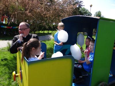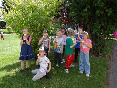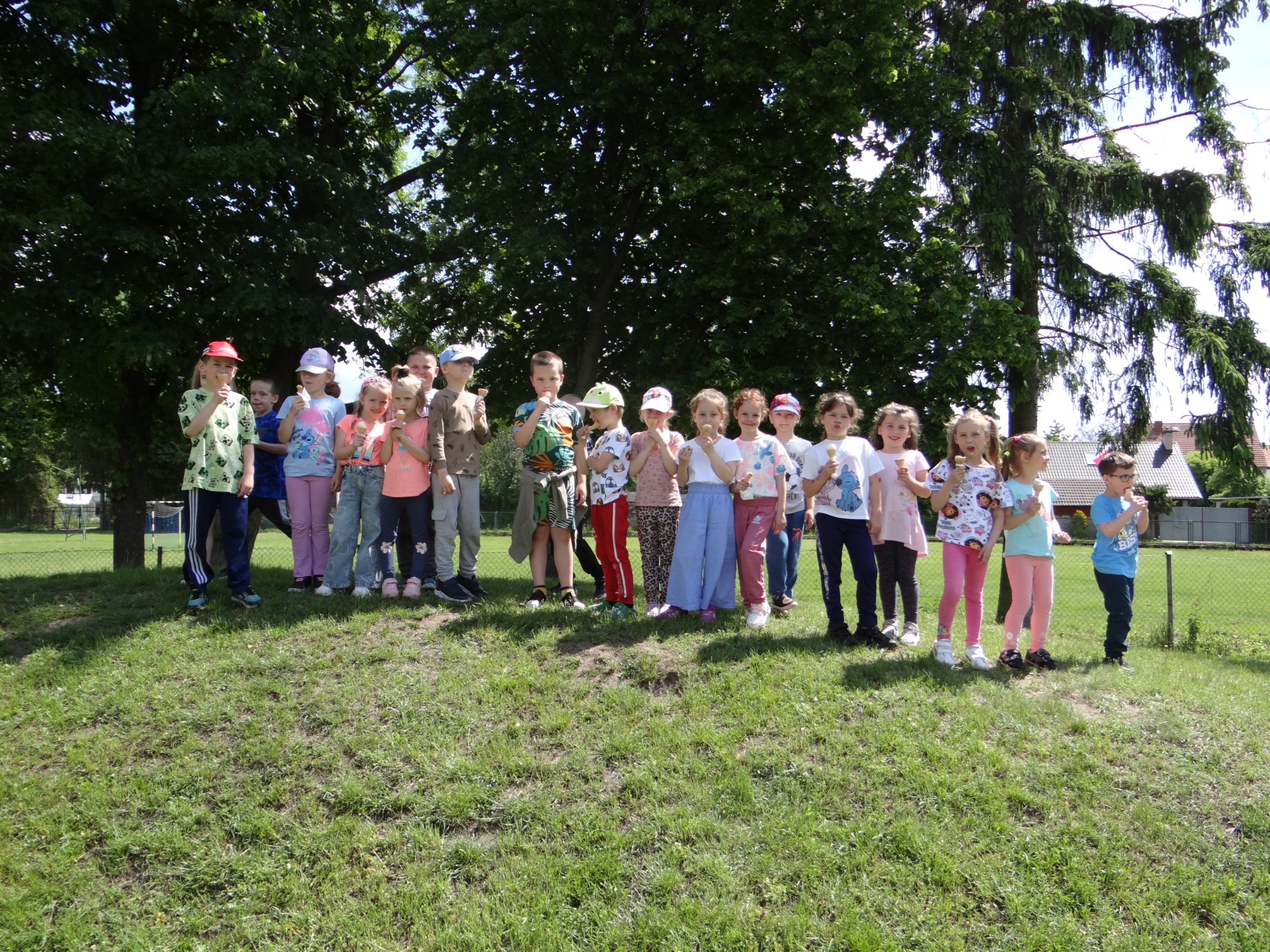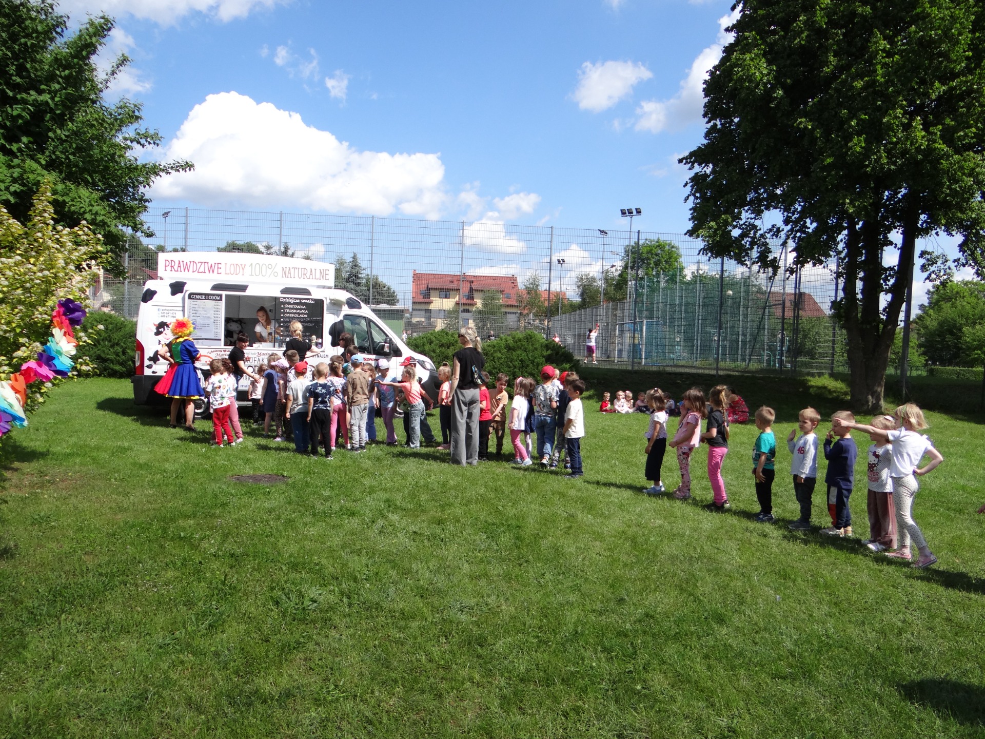 Na dzieci czekało wiele atrakcji: wata cukrowa, popcorn, lody oraz kolorowe bańki mydlane, które unosiły się w powietrzu, wywołując zachwyt i radość. Niespodzianką dla przedszkolaków była wizyta kominiarza – Pana Leszka Mazura, który przybył z workiem pełnym cukierków dla dzieci, wywołując wielkie poruszenie i uśmiechy na twarzach najmłodszych.