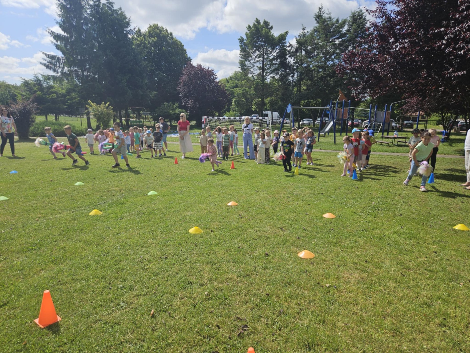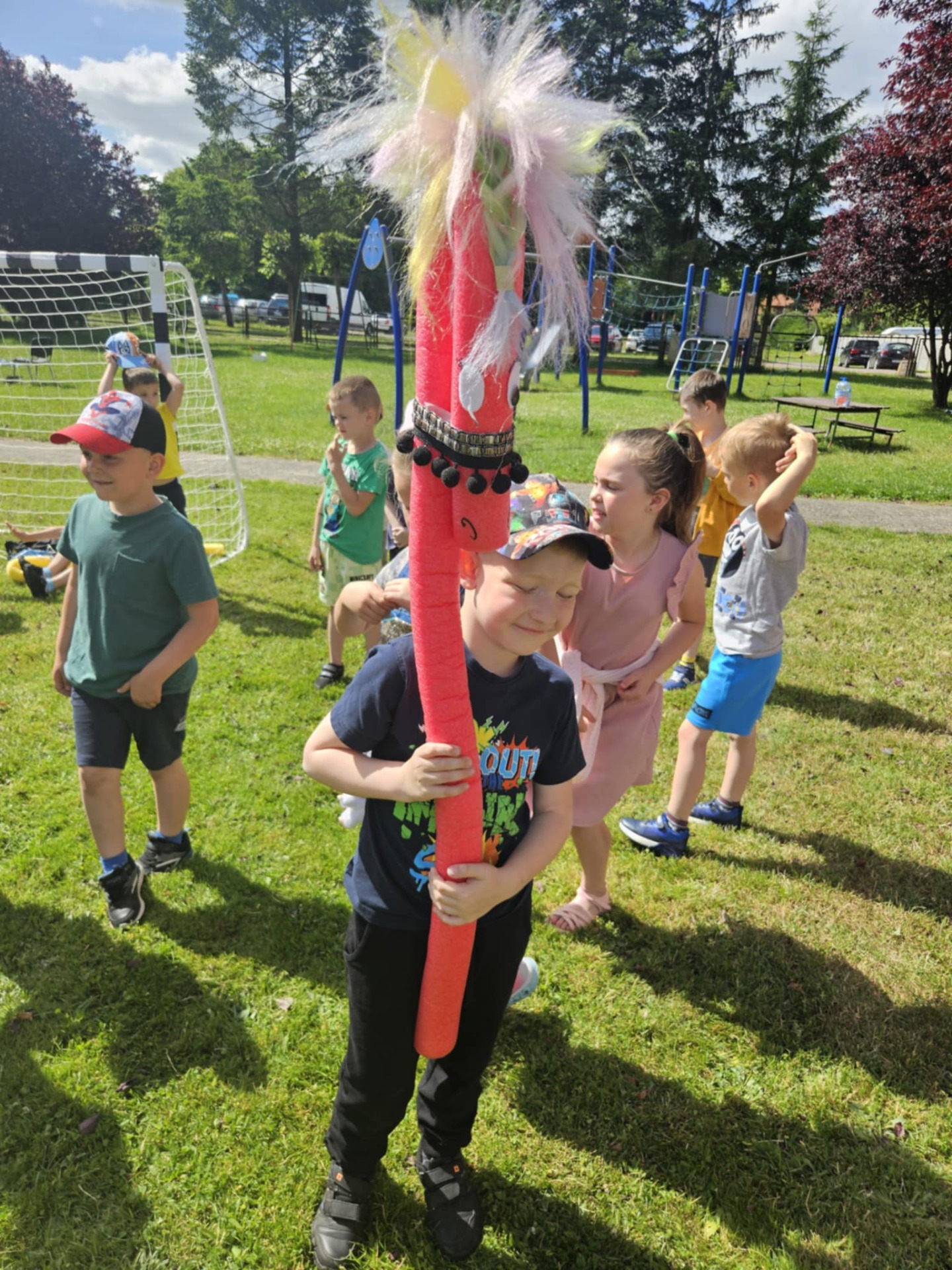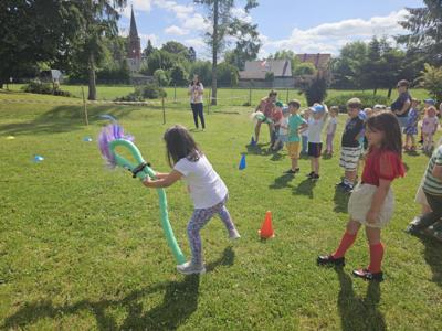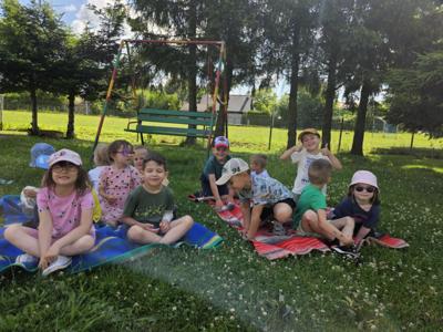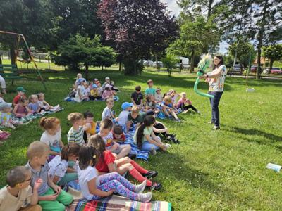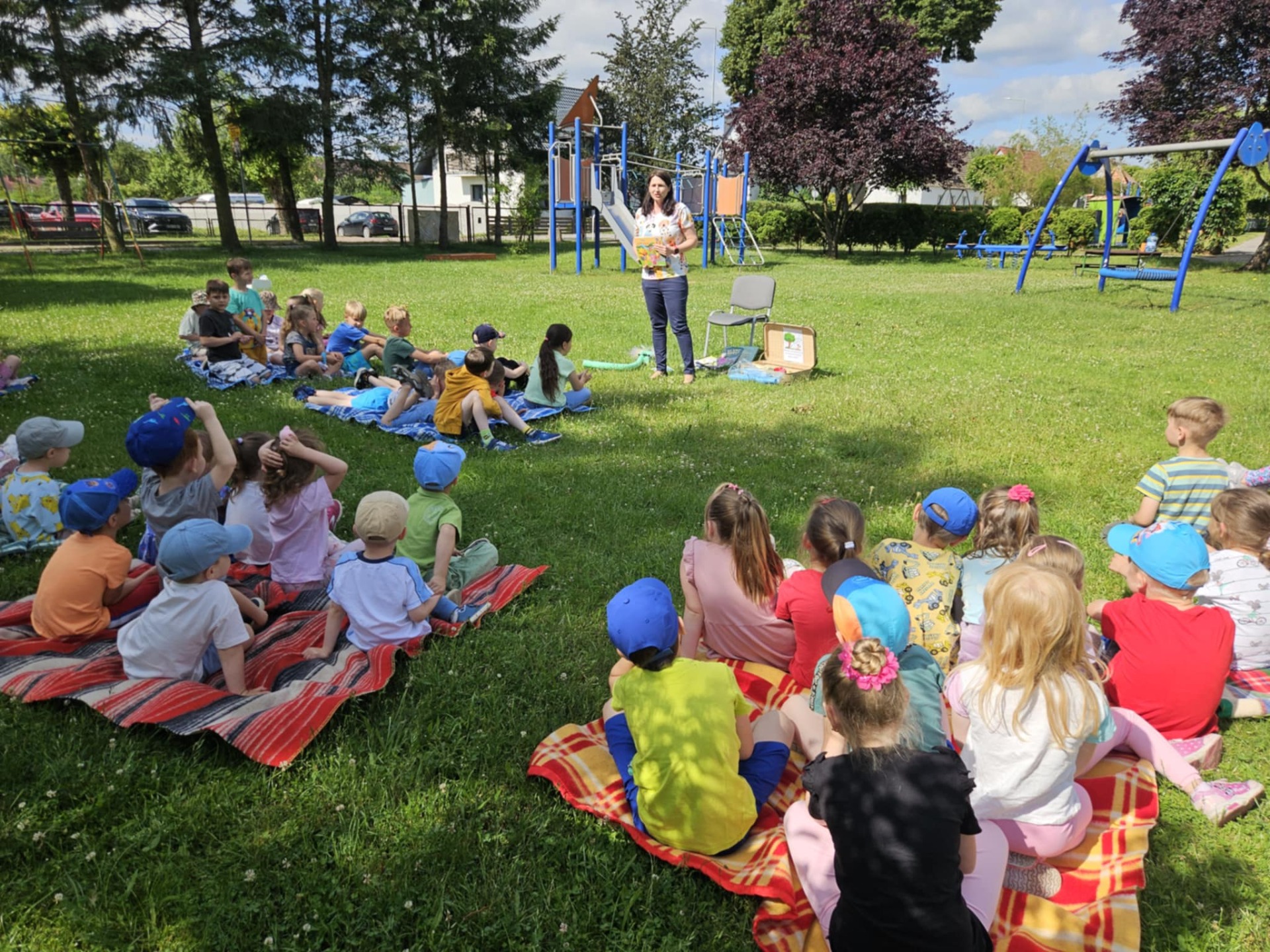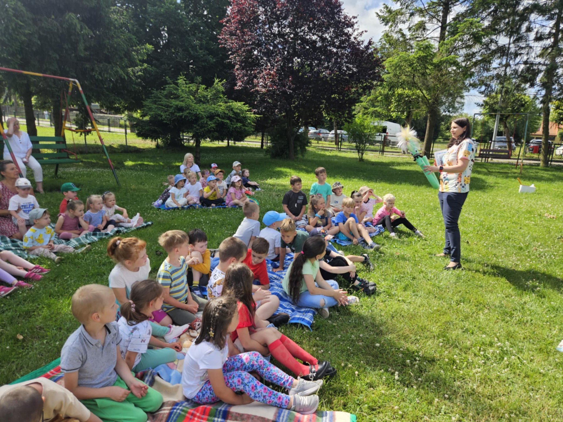 Dnia 26 czerwca 2025r. przedszkolaki brały udział w Międzynarodowej Akcji „Czytanie na polanie”. Spotkanie poprowadziła pani Monika Deptuła z Biblioteki Publicznej w Mirosławcu, która z ogromnym zaangażowaniem zadbała o przyjazną atmosferę i ciekawe atrakcje dla dzieci.
