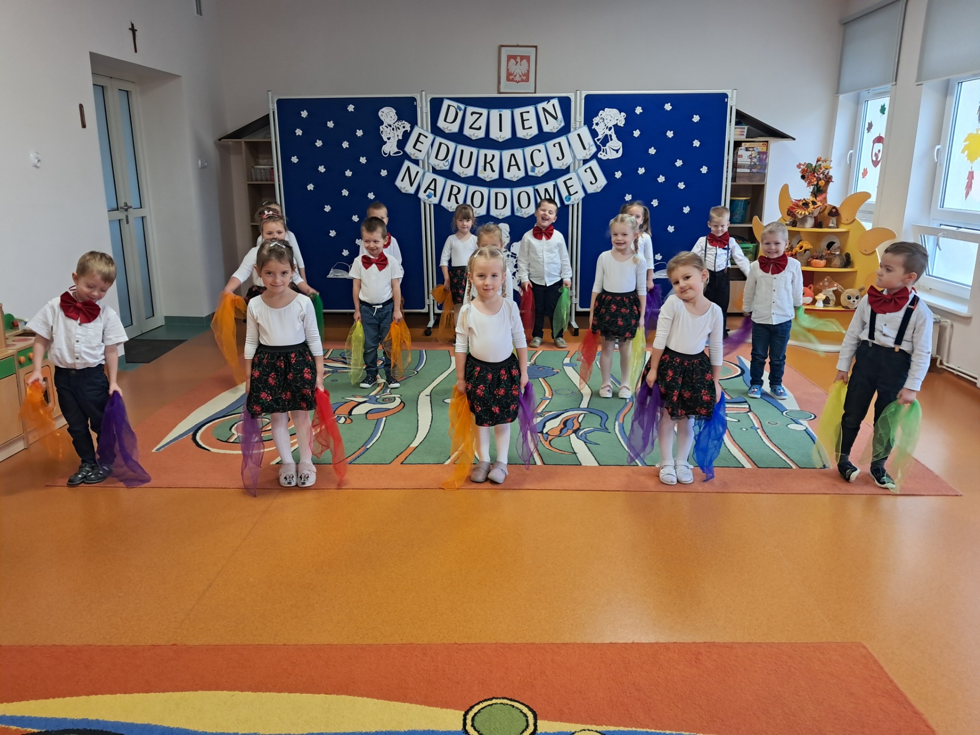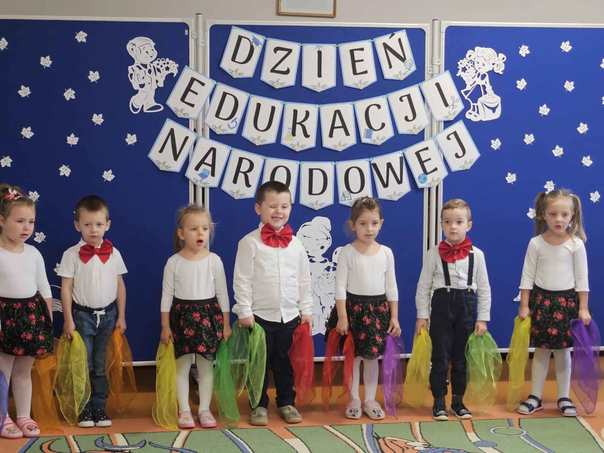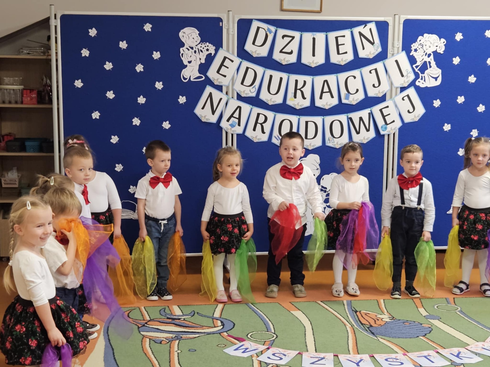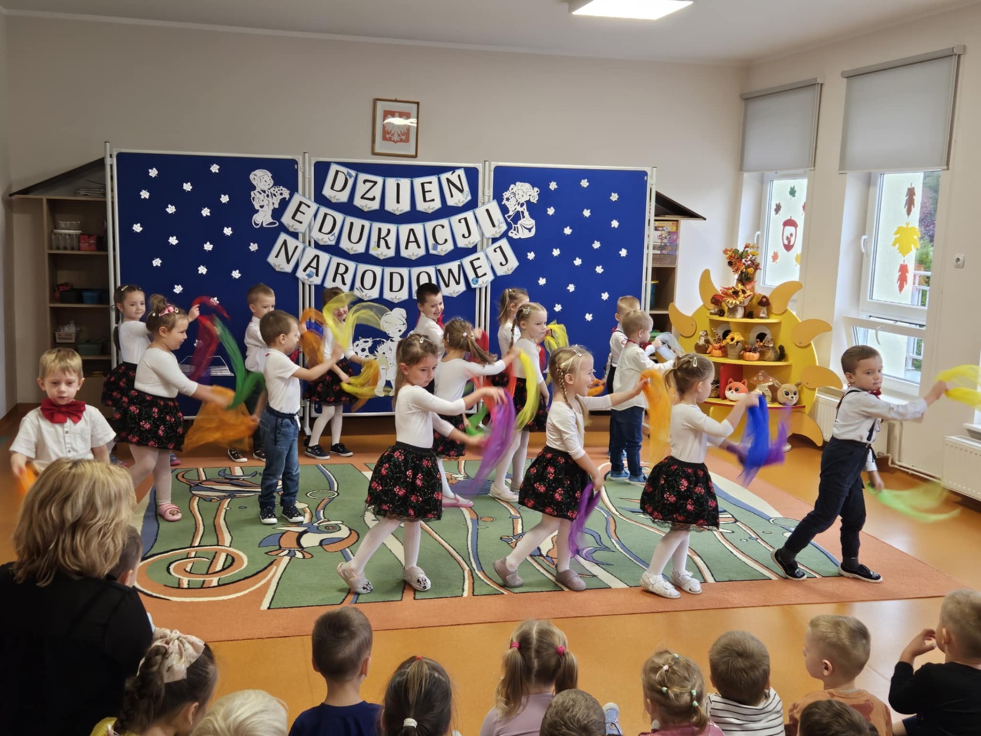 14 października w naszym przedszkolu odbyły się uroczyste obchody Dnia Edukacji Narodowej. Była to wyjątkowa okazja, by podziękować wszystkim nauczycielom i pracownikom przedszkola za ich codzienny trud, uśmiech i serce wkładane w pracę z dziećmi. Część artystyczną przygotowały dzieci z grupy „Muchomorki”. Przedszkolaki zaprezentowały program słowno–muzyczny, na który składały się piosenki, taniec oraz mini skecz. Występ był pełen radości, wzruszeń i dziecięcego entuzjazmu – widownia nagrodziła młodych artystów gromkimi brawami. Po części artystycznej dzieci wręczyły wszystkim pracownikom przedszkola symboliczne upominki w dowód wdzięczności za ich pracę, troskę i serdeczność okazywaną każdego dnia. Uroczystość przebiegła w bardzo miłej i ciepłej atmosferze, a wspólne świętowanie dostarczyło wszystkim wielu pozytywnych emocji i pięknych wspomnień.