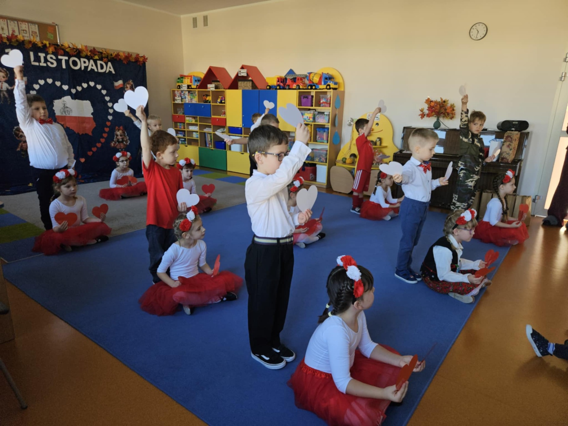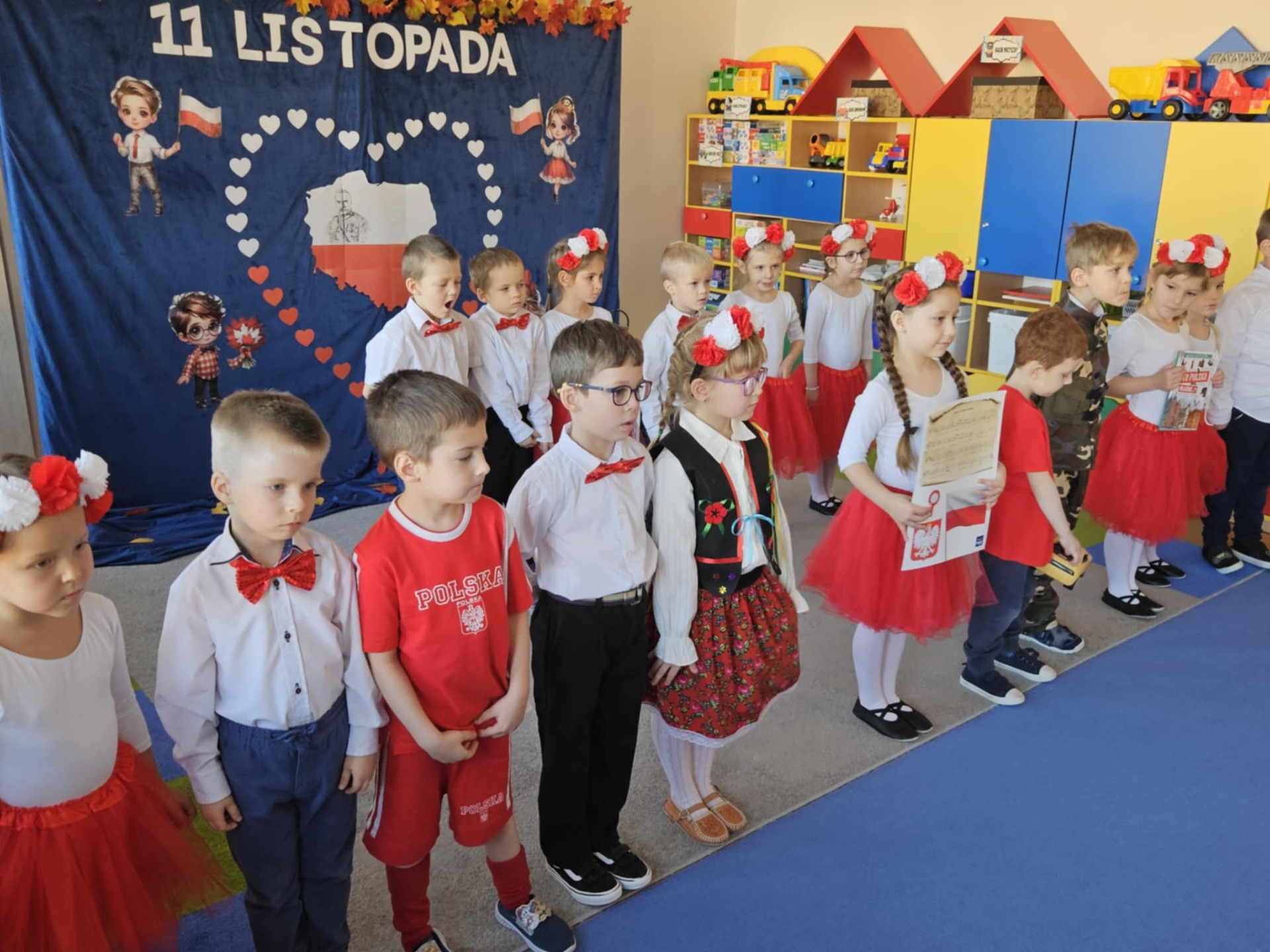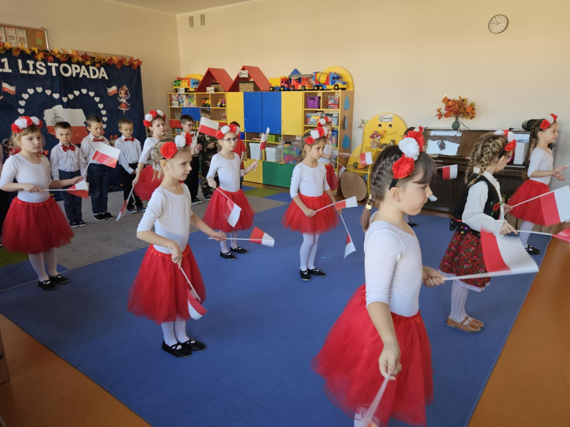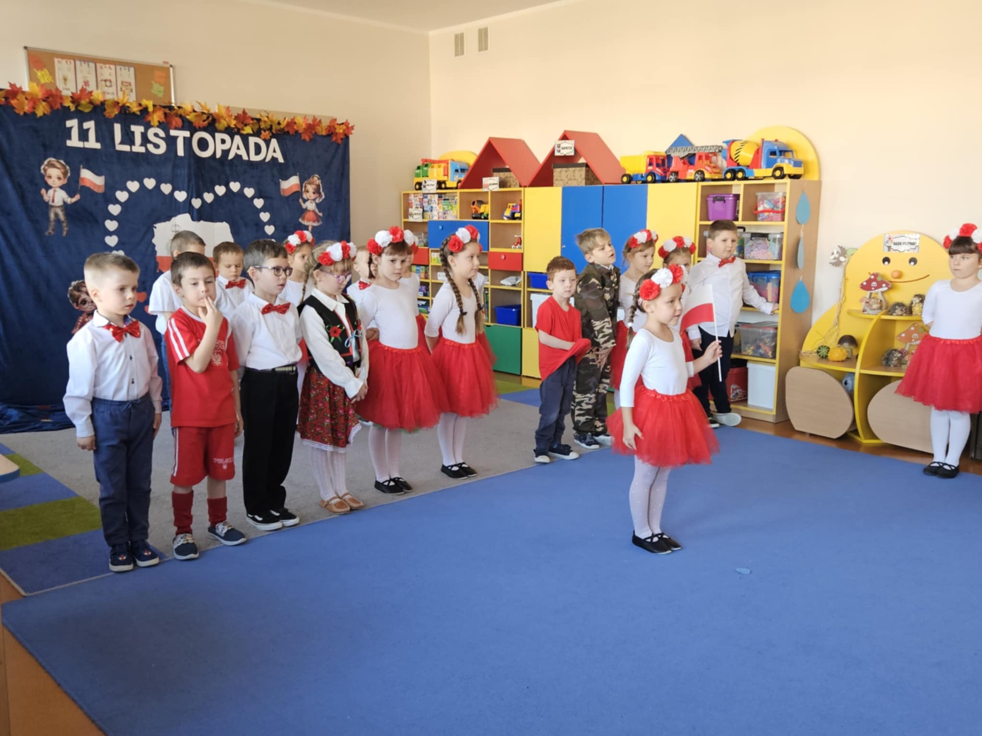 7 listopada w naszym przedszkolu odbyły się uroczyste obchody Święta Niepodległości. Z tej okazji dzieci z grupy „Deszczowe Kropelki” przygotowały pod czujnym okiem wychowawcy pani Agnieszki Paradowskiej - Rakowskiej, specjalny występ artystyczny dla rodziców, zaproszonych gości, nauczycieli, dzieci i pracowników przedszkola. Tego dnia wszyscy – zarówno dzieci, jak i nauczyciele – byli odświętnie ubrani, w galowych strojach, podkreślających rangę narodowego święta. Program artystyczny obejmował wiersze, tańce i piosenki o tematyce patriotycznej, które wprowadziły wszystkich w podniosły i wzruszający nastrój. Na zakończenie uroczystości wszyscy uczestnicy wspólnie i z wielkim zaangażowaniem odśpiewali hymn państwowy – „Mazurek Dąbrowskiego”. Uroczystość była piękną lekcją patriotyzmu, radości i dumy z bycia Polakiem. Dzieci wspaniale zaprezentowały swoje umiejętności, a zgromadzeni goście wyrazili uznanie dla ich występu.