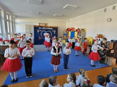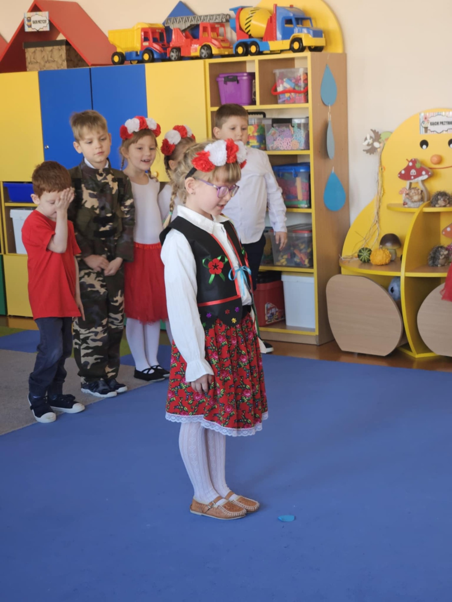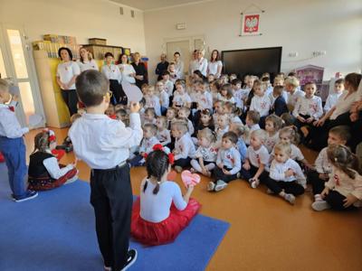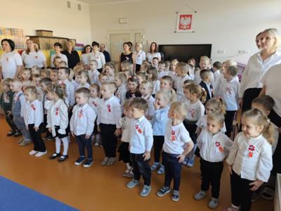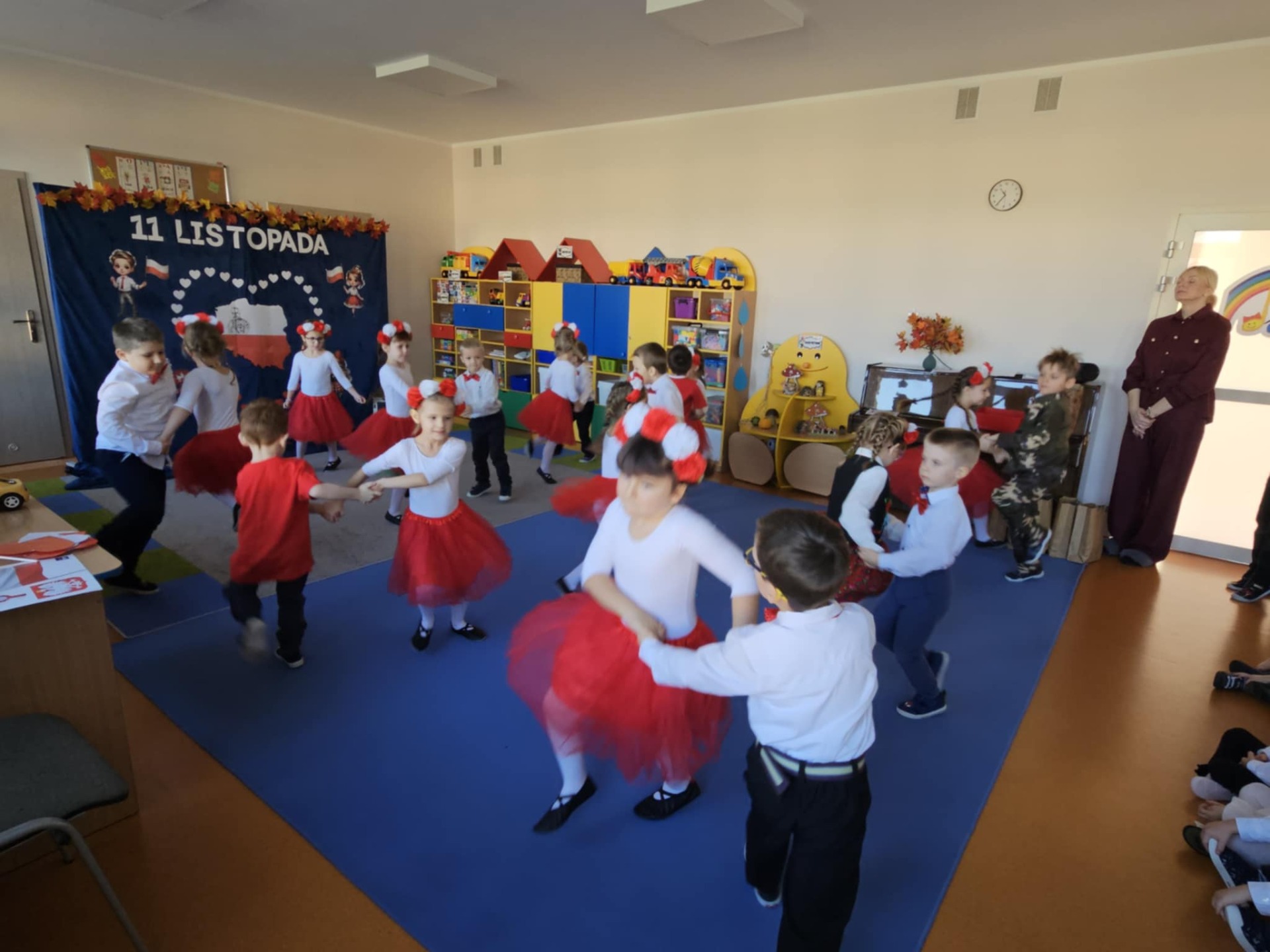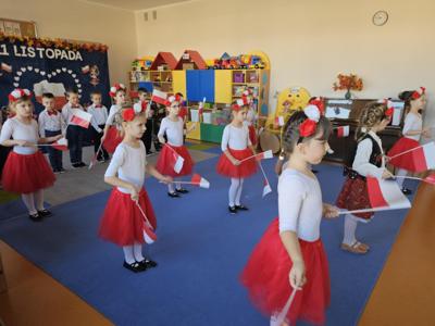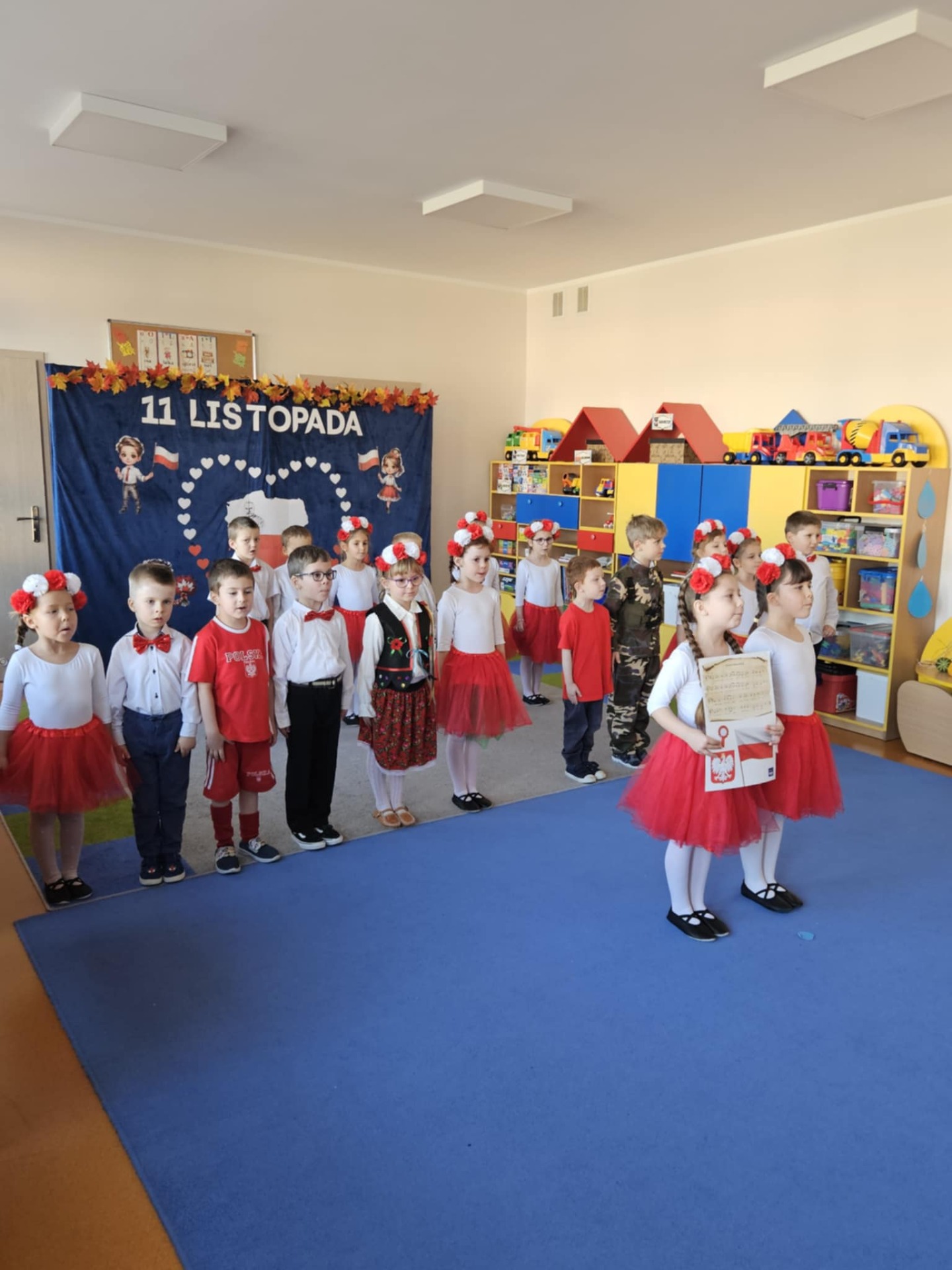 7 listopada w naszym przedszkolu odbyły się uroczyste obchody Święta Niepodległości. Z tej okazji dzieci z grupy „Deszczowe Kropelki” przygotowały pod czujnym okiem wychowawcy pani Agnieszki Paradowskiej - Rakowskiej, specjalny występ artystyczny dla rodziców, zaproszonych gości, nauczycieli, dzieci i pracowników przedszkola. Tego dnia wszyscy – zarówno dzieci, jak i nauczyciele – byli odświętnie ubrani, w galowych strojach, podkreślających rangę narodowego święta. Program artystyczny obejmował wiersze, tańce i piosenki o tematyce patriotycznej, które wprowadziły wszystkich w podniosły i wzruszający nastrój. Na zakończenie uroczystości wszyscy uczestnicy wspólnie i z wielkim zaangażowaniem odśpiewali hymn państwowy – „Mazurek Dąbrowskiego”. Uroczystość była piękną lekcją patriotyzmu, radości i dumy z bycia Polakiem. Dzieci wspaniale zaprezentowały swoje umiejętności, a zgromadzeni goście wyrazili uznanie dla ich występu.