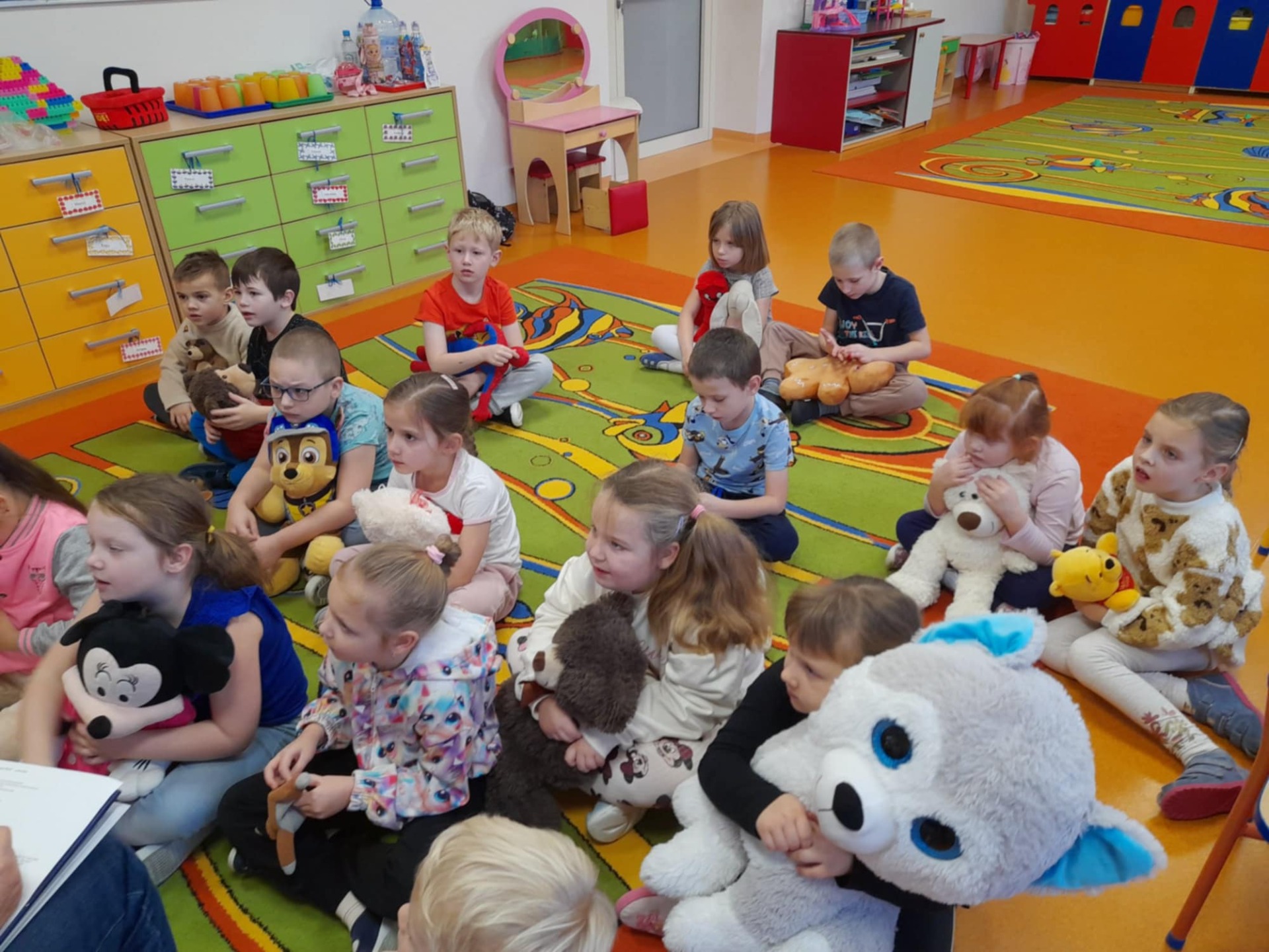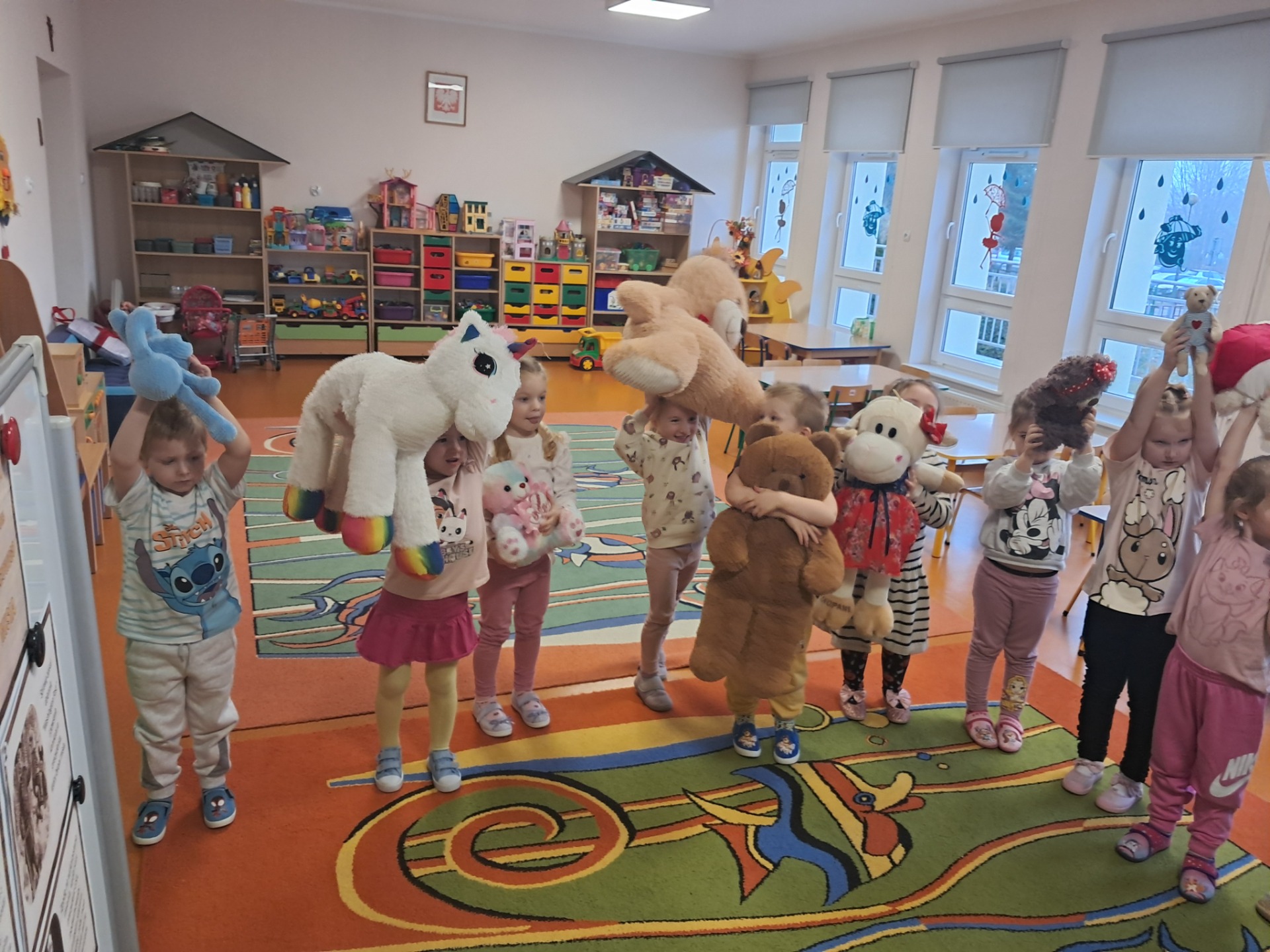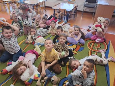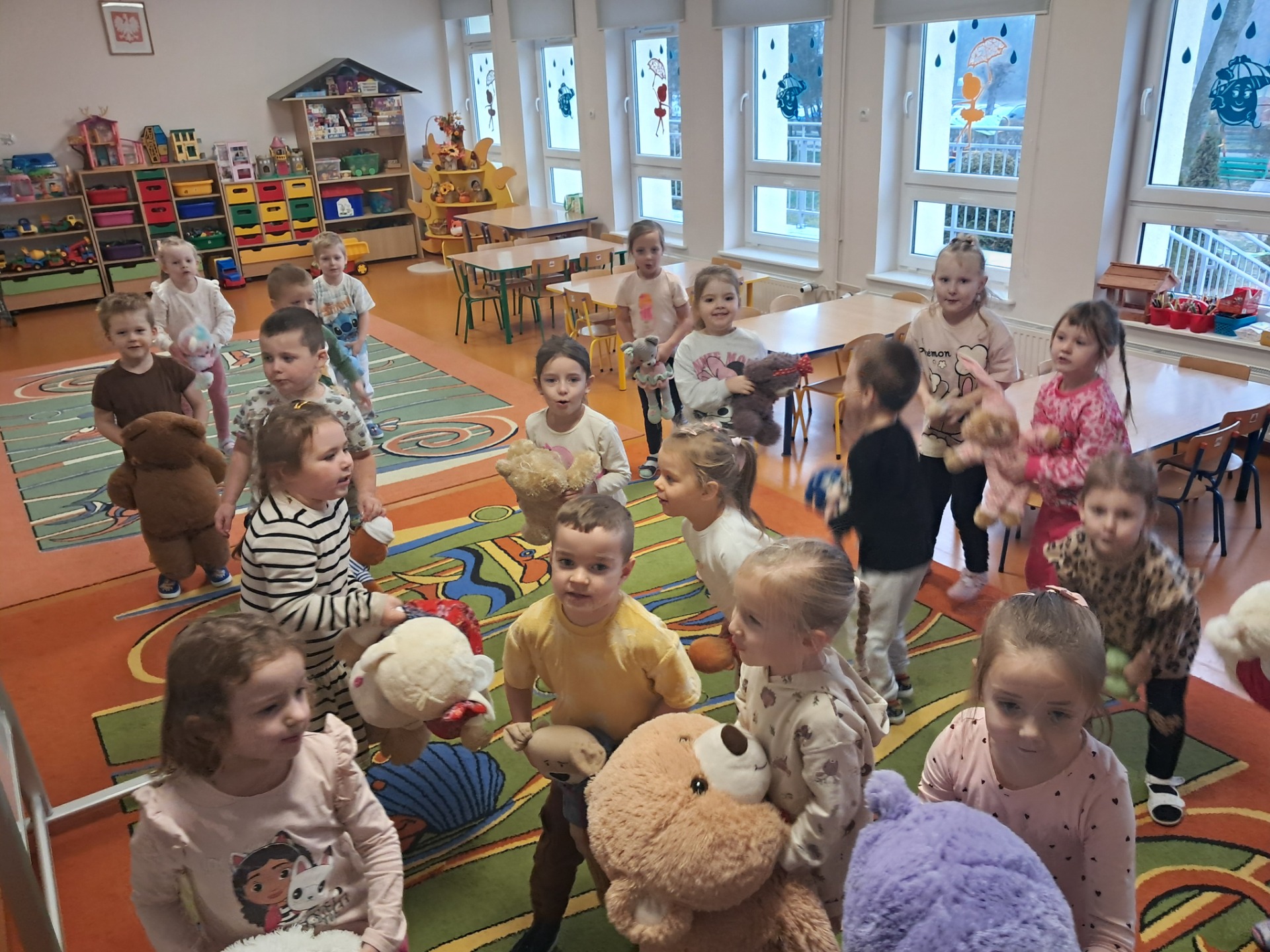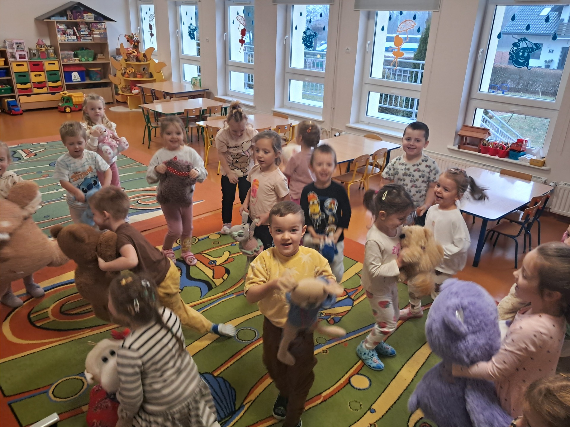 25 listopada w naszym przedszkolu świętowaliśmy Dzień Pluszowego Misia, który jak co roku dostarczył dzieciom wiele radości i niezapomnianych wrażeń. Tego dnia przedszkolaki przyniosły do sal swoje ulubione pluszowe misie, aby wspólnie przeżyć wyjątkowe chwile pełne zabawy i twórczej aktywności. Przedszkolaki z zainteresowaniem wysłuchały opowieści o tym, skąd wziął się pierwszy miś i dlaczego stał się jedną z najbardziej lubianych dziecięcych zabawek na świecie. Nie zabrakło również zabaw z misiami przy muzyce. Dzieci tańczyły, poruszały się w rytm wesołych piosenek oraz uczestniczyły w zabawach integracyjnych, które rozwijały ich sprawność ruchową i wywołały wiele uśmiechów. Inną atrakcją było układanie puzzli z wizerunkiem misiów. Zadanie to nie tylko bawiło, ale również doskonaliło koncentrację i umiejętność współpracy. Przedszkolaki chętnie pomagały sobie nawzajem, aby jak najszybciej ułożyć obrazki. Wspólny dzień z misiami zakończyła praca plastyczna, podczas której dzieci tworzyły swojego własnego misia wykorzystując kolorowanie, wycinanie i sklejanie elementów. Każdy miś był wyjątkowy i odzwierciedlał kreatywność małych twórców. Obchody Dnia Pluszowego Misia upłynęły w atmosferze radości i wspólnej zabawy. Był to dzień pełen uśmiechów, w trakcie którego dzieci mogły nie tylko dobrze się bawić, ale również rozwijać swoje umiejętności i wyobraźnię.