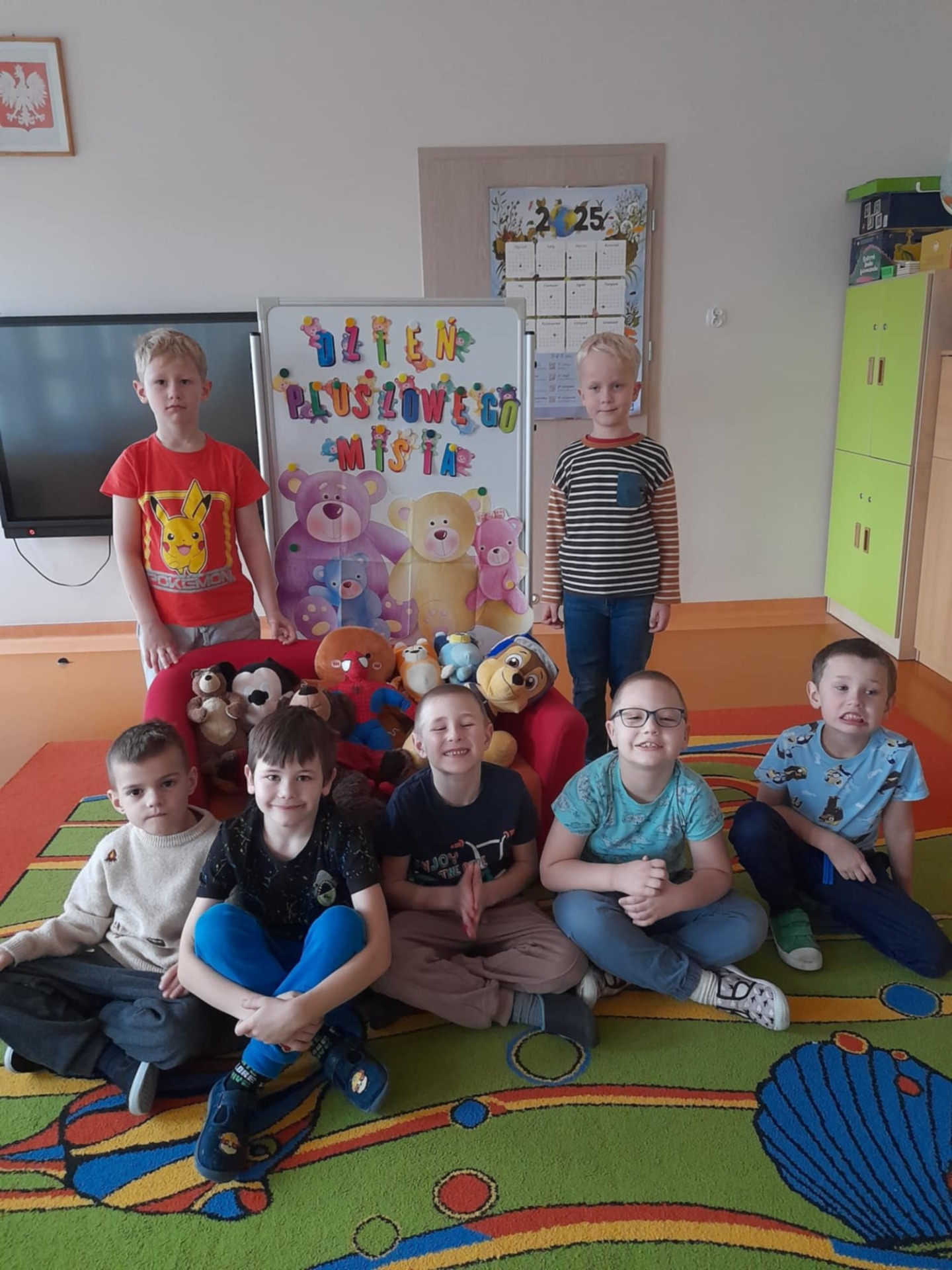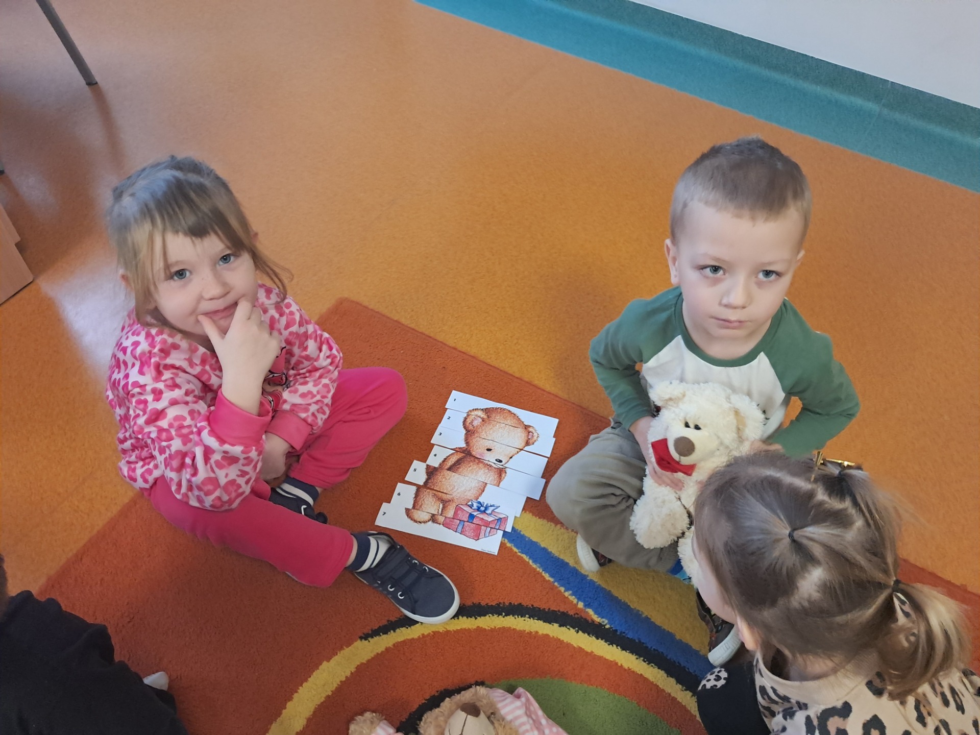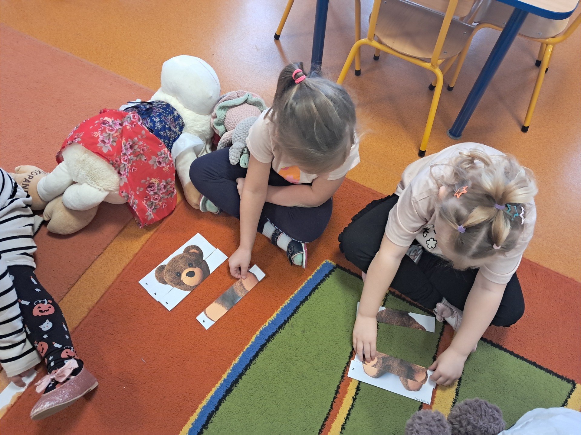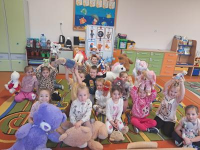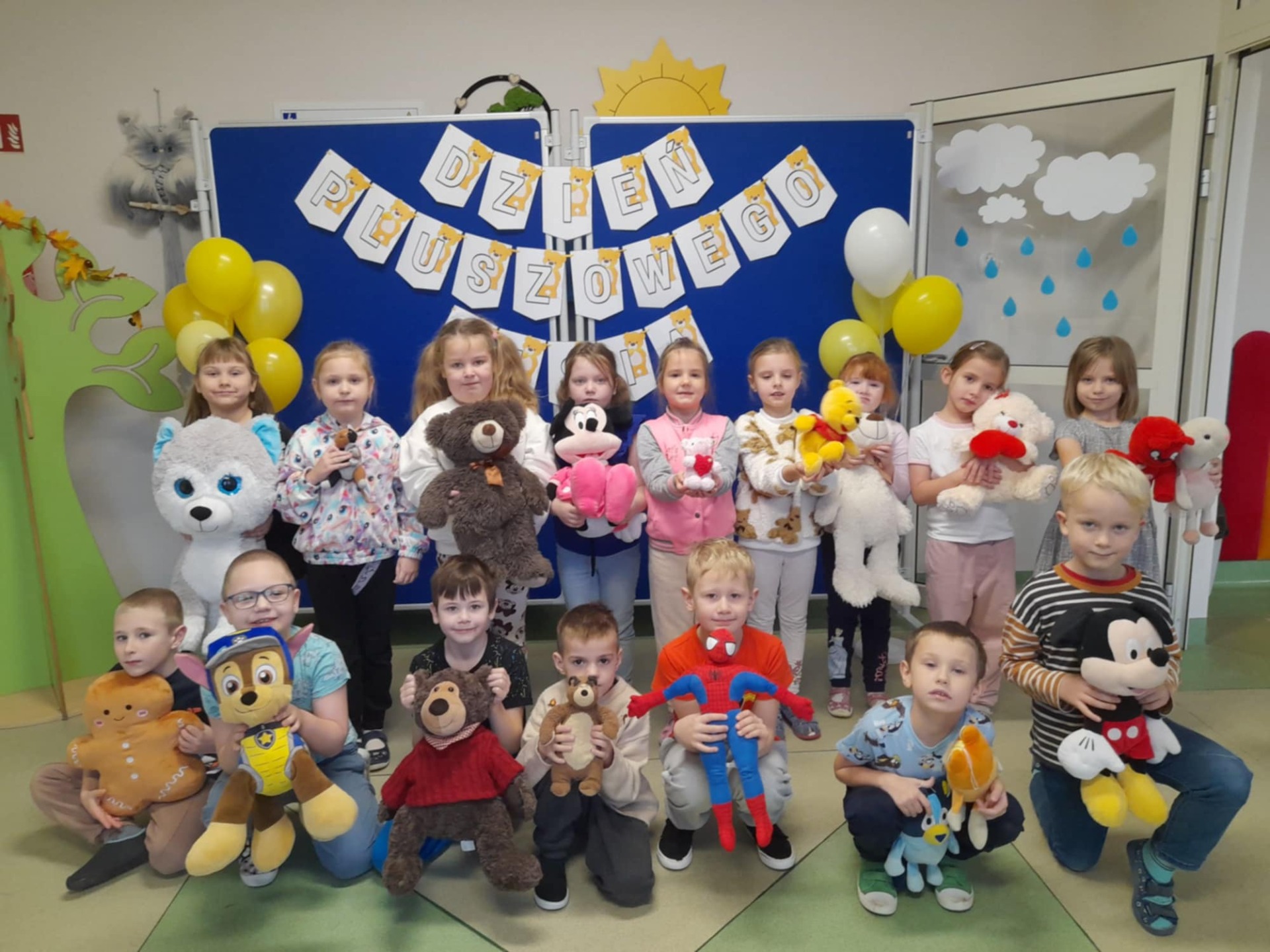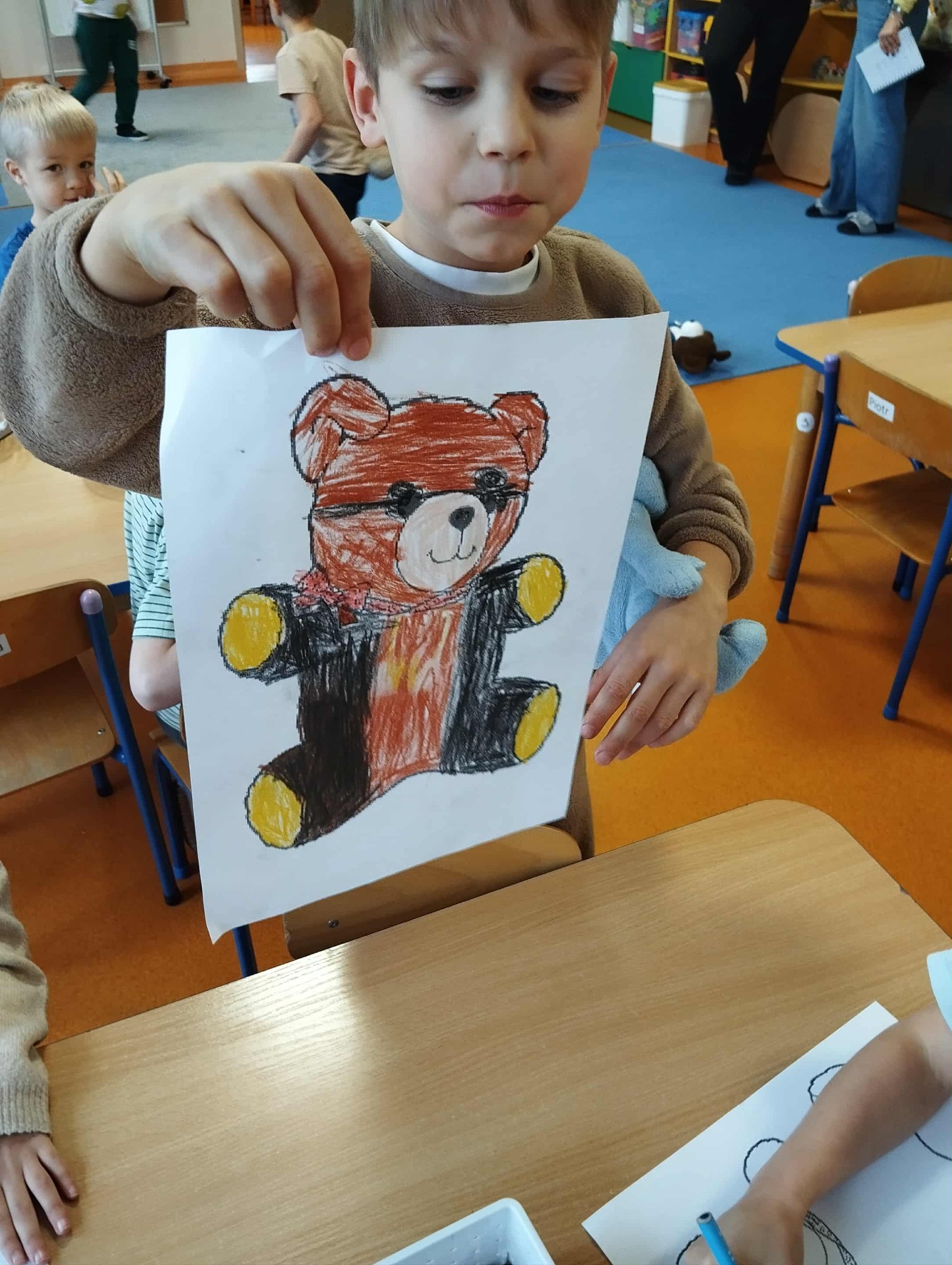 25 listopada w naszym przedszkolu świętowaliśmy Dzień Pluszowego Misia, który jak co roku dostarczył dzieciom wiele radości i niezapomnianych wrażeń. Tego dnia przedszkolaki przyniosły do sal swoje ulubione pluszowe misie, aby wspólnie przeżyć wyjątkowe chwile pełne zabawy i twórczej aktywności. Przedszkolaki z zainteresowaniem wysłuchały opowieści o tym, skąd wziął się pierwszy miś i dlaczego stał się jedną z najbardziej lubianych dziecięcych zabawek na świecie. Nie zabrakło również zabaw z misiami przy muzyce. Dzieci tańczyły, poruszały się w rytm wesołych piosenek oraz uczestniczyły w zabawach integracyjnych, które rozwijały ich sprawność ruchową i wywołały wiele uśmiechów. Inną atrakcją było układanie puzzli z wizerunkiem misiów. Zadanie to nie tylko bawiło, ale również doskonaliło koncentrację i umiejętność współpracy. Przedszkolaki chętnie pomagały sobie nawzajem, aby jak najszybciej ułożyć obrazki. Wspólny dzień z misiami zakończyła praca plastyczna, podczas której dzieci tworzyły swojego własnego misia wykorzystując kolorowanie, wycinanie i sklejanie elementów. Każdy miś był wyjątkowy i odzwierciedlał kreatywność małych twórców. Obchody Dnia Pluszowego Misia upłynęły w atmosferze radości i wspólnej zabawy. Był to dzień pełen uśmiechów, w trakcie którego dzieci mogły nie tylko dobrze się bawić, ale również rozwijać swoje umiejętności i wyobraźnię.