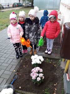 W piątek 6 listopada dzieci z grupy "Motylki" uczyniły okolicę naszego przedszkola piękniejszą - wkopały do ziemi piękne kwiaty, które przedszkole otrzymało w prezencie od Pani Dyrektor Ośrodka Kultury w Miorsławcu. Starszaki najpierw wykopały dziury, wsadziły do ziemi i podlały sadzonki....