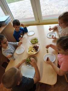 W ramach omawiania tygodniowego bloku tematycznego "Idzie jesień... przez ogród i sad", dzieci z grupy "Biedronki" wzięły udział w zabawie kulinarnej i tworzyły szaszłyki z ulubionych owoców. Zajęcia miały na celu utrwalenie nazw owoców, które jesienią rosną w sadach...