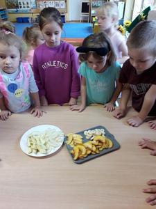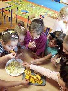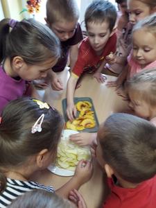 W ramach realizacji tematu tygodniowego „Idzie jesień... przez ogród i sad” w środę 2. października grupa „Motylki” uczestniczyła w zabawach badawczych. Przedszkolaki miały możliwość poznawania owoców różnymi zmysłami – wzrokiem, dotykiem, smakiem. Poznawały walory smakowe oraz wartości odżywcze owoców. Na zakończenie zajęć pokrojone na cienie plasterki umieściliśmy w suszarce do owoców. Dzieci nie mogły się doczekać na pyszne i zdrowe chipsy owocowe.