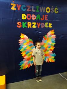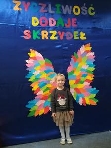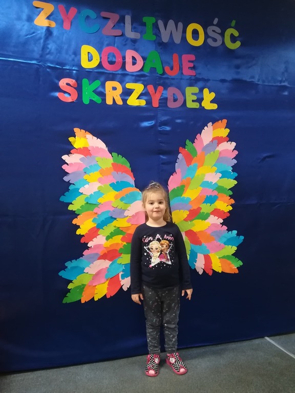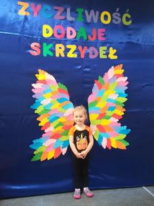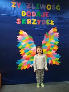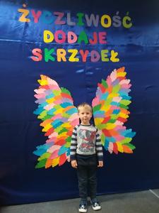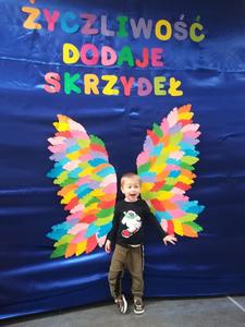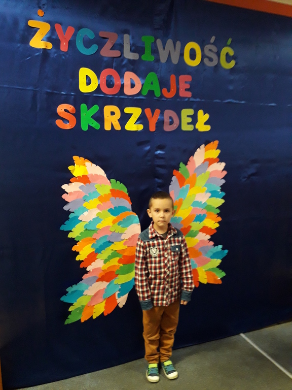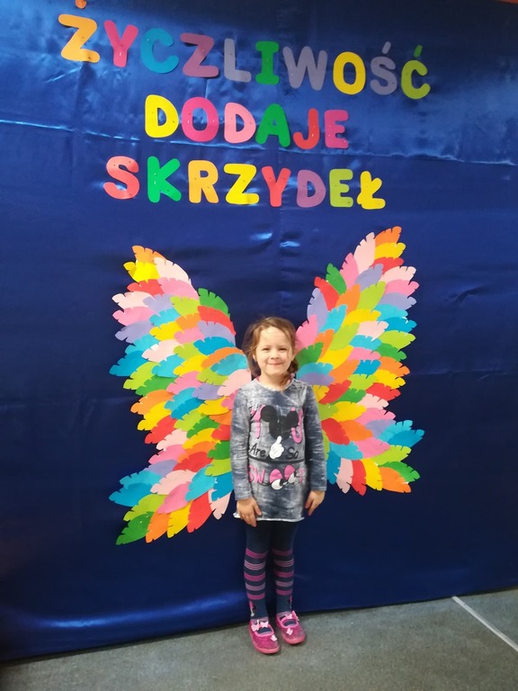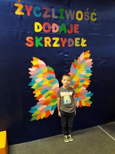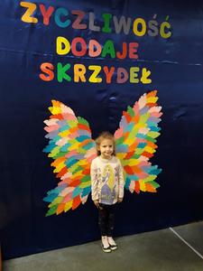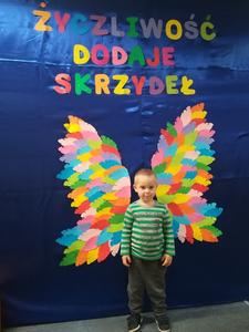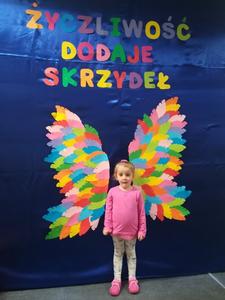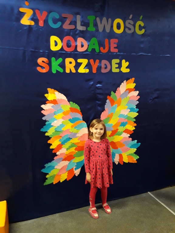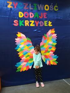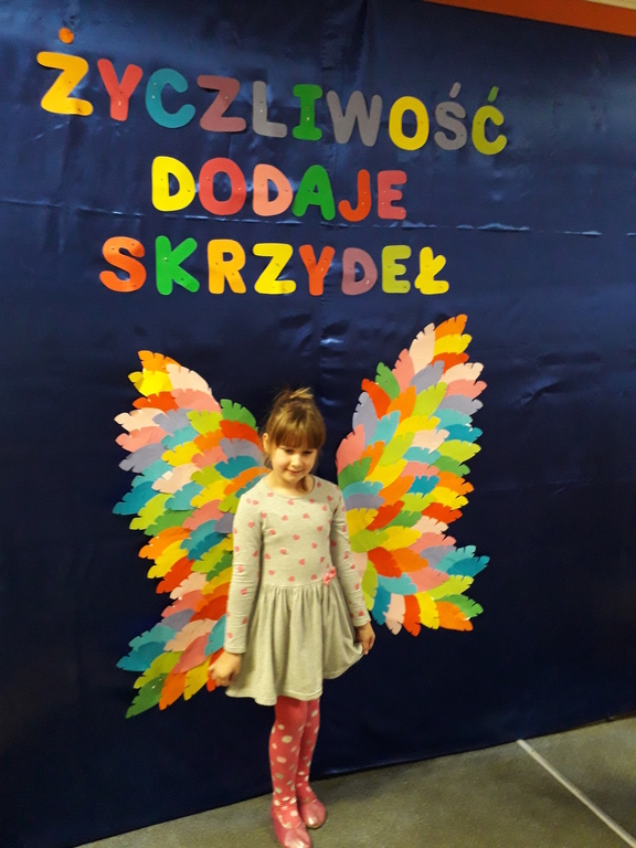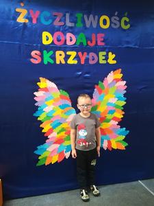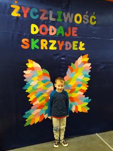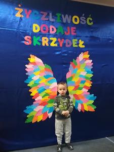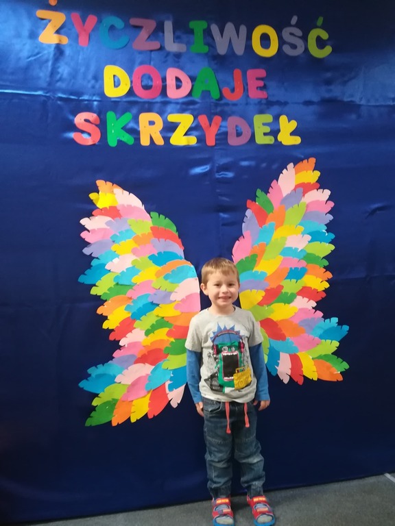 21 listopada obchodziliśmy w naszym przedszkolu Dzień Życzliwości. Tuż po śniadaniu "Biedronki" i "Motylki" spotkały się w sali u starszaków, aby wspólnie świętować ten dzień. Dziweci uczestniczyły w wielu zabawach ruchowych i ze śpiewam, których celem było swtorzenie przyjaznej atmosfery pełnej usmiechu i wzajemnej życzliwości. Dzieci bawiły się w "Pomidora", współpracowały w parach w zabawie "Pomóż przyjacielowi", współdziałały przy okazji zabaw z chustą animacyjną. Przedszkolaki próbowały też ustalic co to znaczy być życzliwym, jakie cechy można przypisać osobie życzliwej. Swoje pomysły zapisywały na promyczkach "Słoneczka życzliwości". Każde dziecko stworzyło także laurkę dla rodziców w którą wkleiło kilka miłych słów. Największą atrakcjią dzisiejszego dnia była jednak piękna dekoracja z napisem "życzliwośc dodaje skrzydeł" - umożliwiała ona wykonanie zdjęcia na tle pięknych kolorowych skrzydeł.