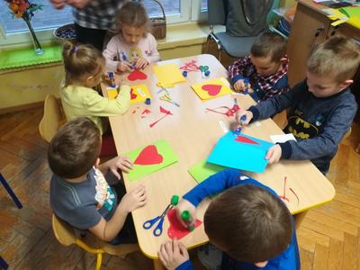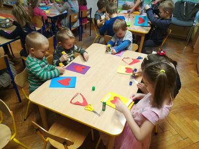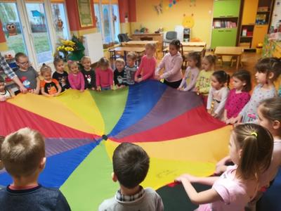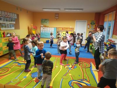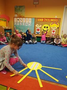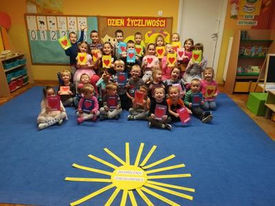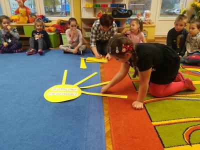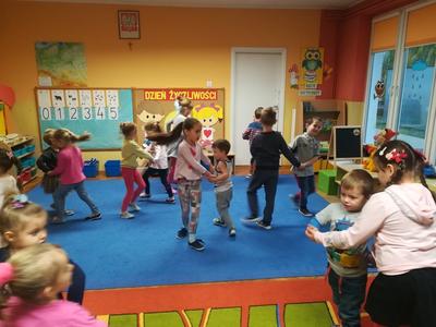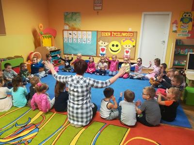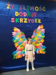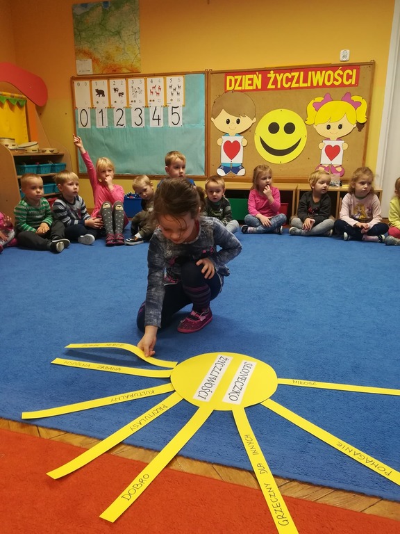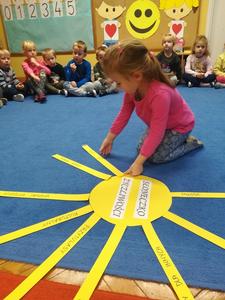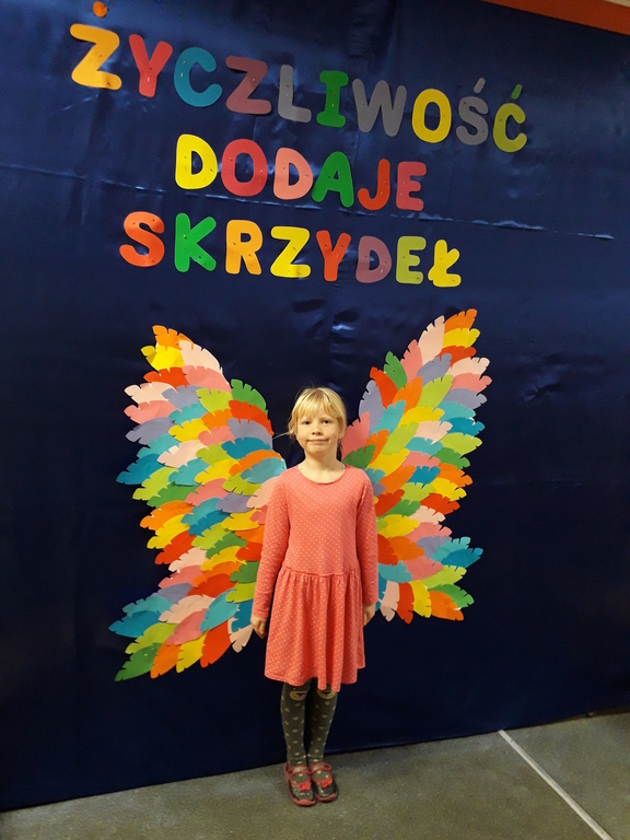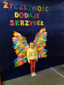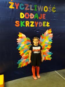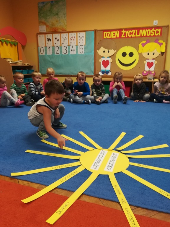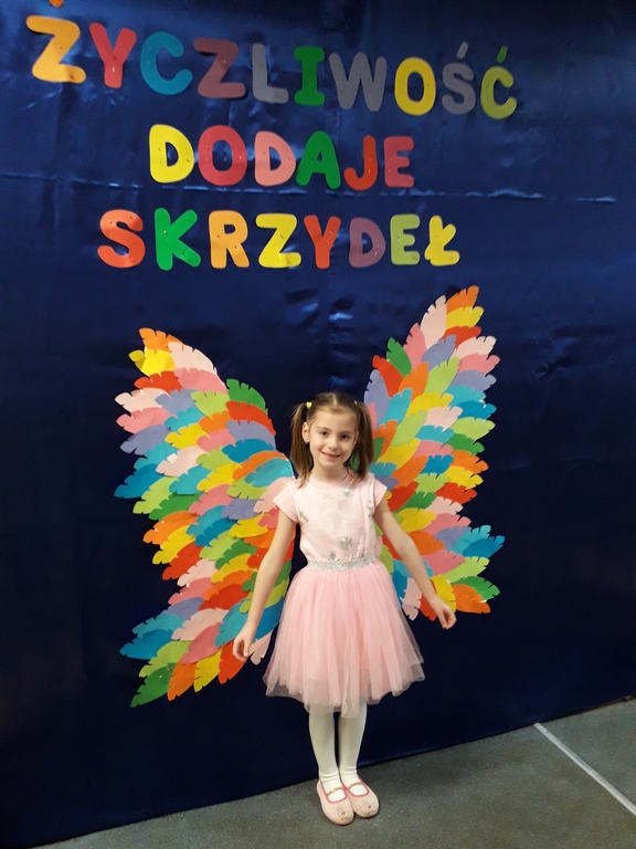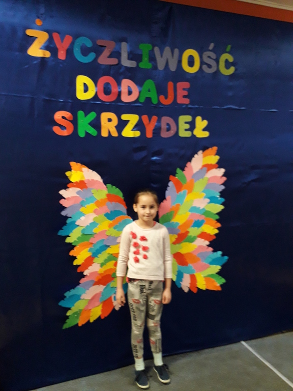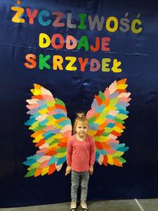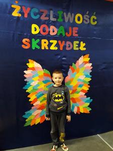 21 listopada obchodziliśmy w naszym przedszkolu Dzień Życzliwości. Tuż po śniadaniu "Biedronki" i "Motylki" spotkały się w sali u starszaków, aby wspólnie świętować ten dzień. Dziweci uczestniczyły w wielu zabawach ruchowych i ze śpiewam, których celem było swtorzenie przyjaznej atmosfery pełnej usmiechu i wzajemnej życzliwości. Dzieci bawiły się w "Pomidora", współpracowały w parach w zabawie "Pomóż przyjacielowi", współdziałały przy okazji zabaw z chustą animacyjną. Przedszkolaki próbowały też ustalic co to znaczy być życzliwym, jakie cechy można przypisać osobie życzliwej. Swoje pomysły zapisywały na promyczkach "Słoneczka życzliwości". Każde dziecko stworzyło także laurkę dla rodziców w którą wkleiło kilka miłych słów. Największą atrakcjią dzisiejszego dnia była jednak piękna dekoracja z napisem "życzliwośc dodaje skrzydeł" - umożliwiała ona wykonanie zdjęcia na tle pięknych kolorowych skrzydeł.
