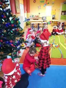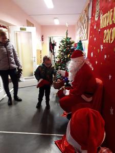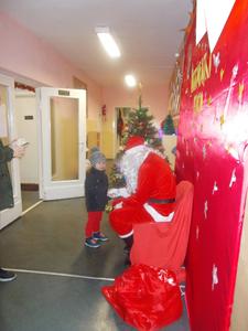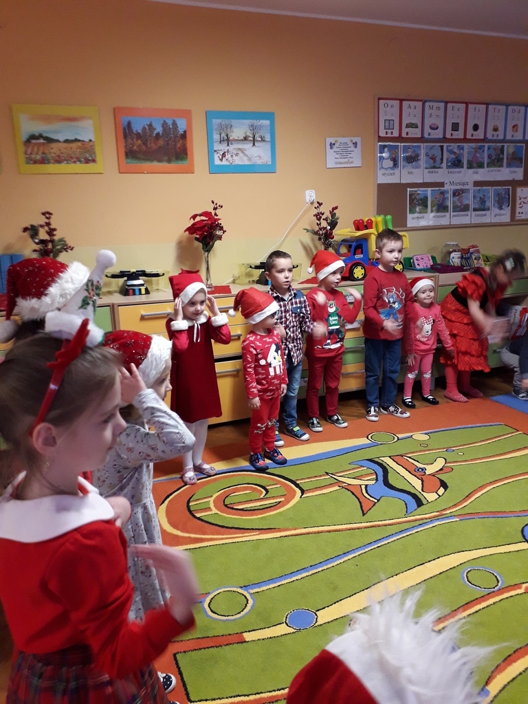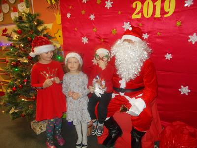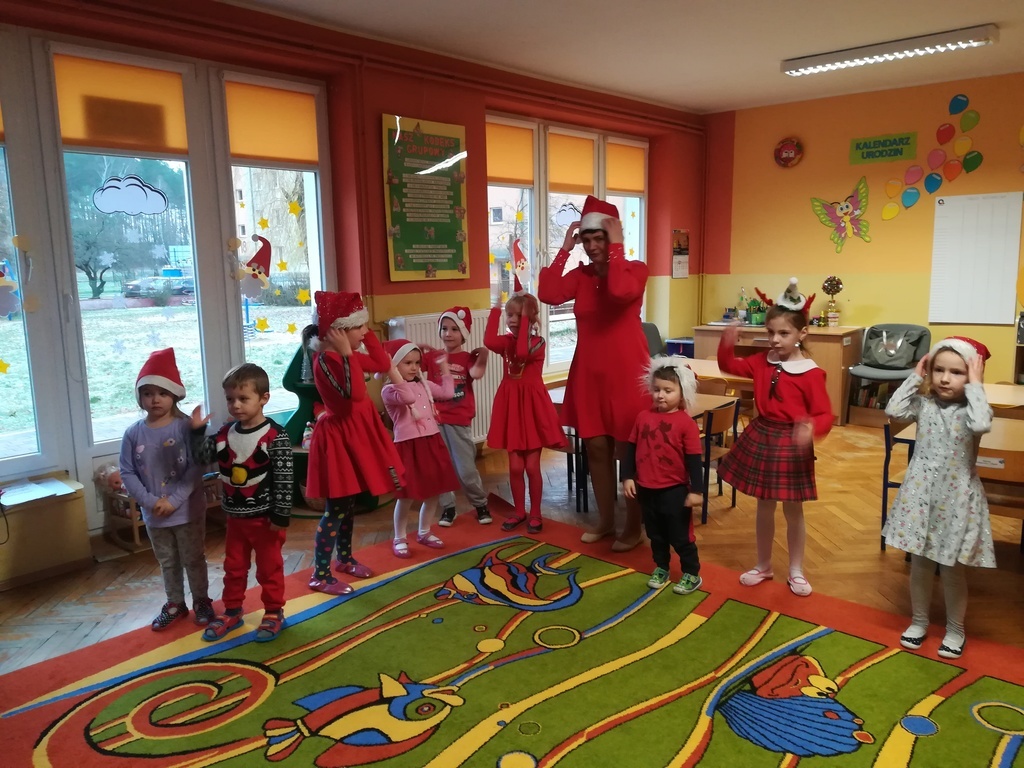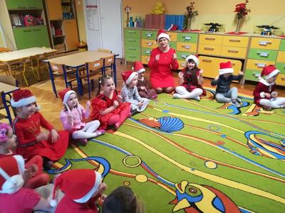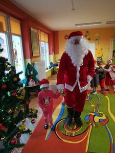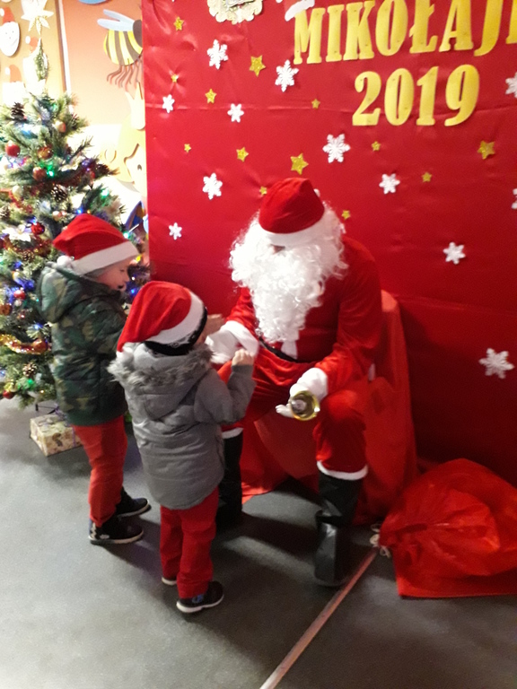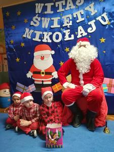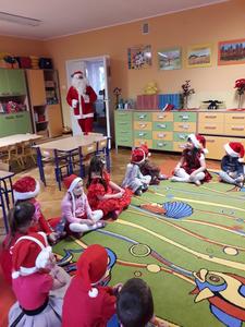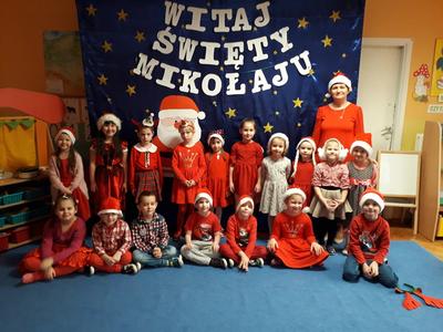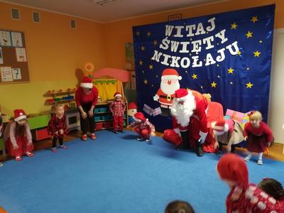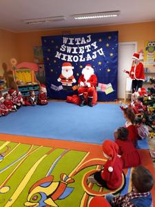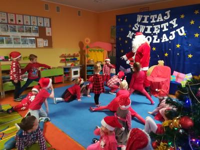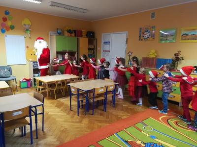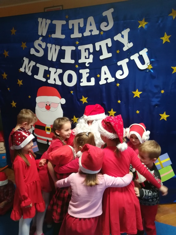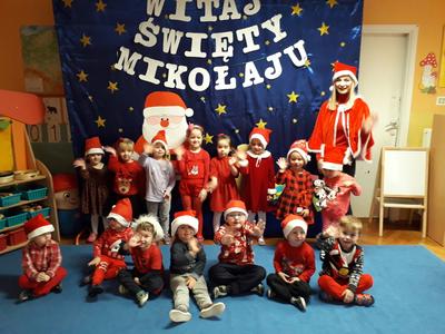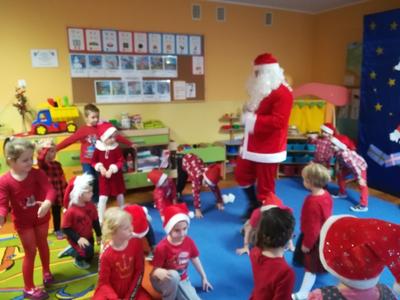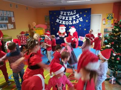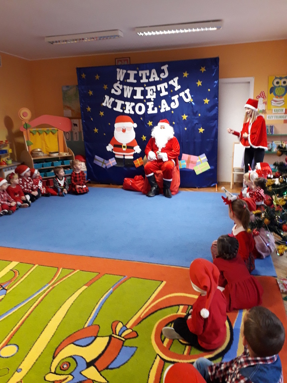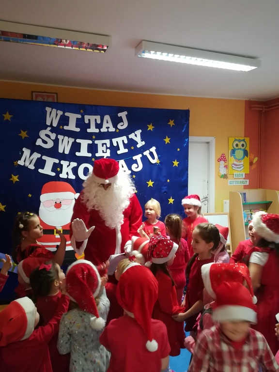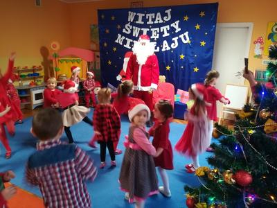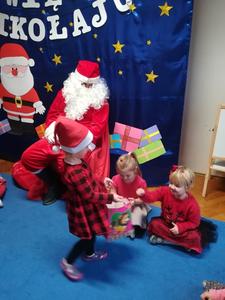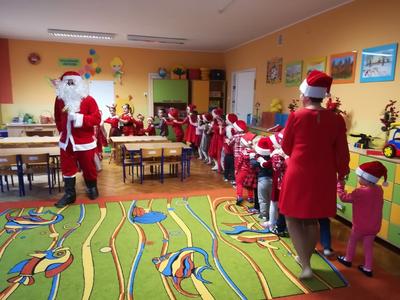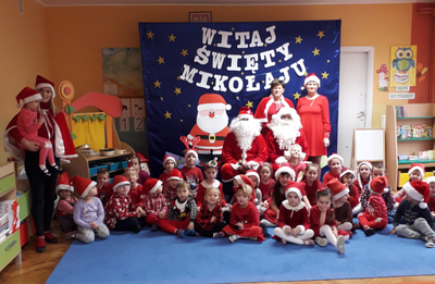 Piątek 6 grudnia był w naszym przedszkolu bardzo radosnym dniem. Od samego rana, każde przychodzące do przedszkola dziecko było witane w przedszkolnym holu przez samego Świętego Mikołaja! Przedszkolaki miały możliwość uściskać poczciwego "staruszka", zrobić sobie z nim zdjęcie oraz poczęstować się cukierkiem. Po śniadaniu wszystkie dzieci zebrały się w jednej sali, aby wspólnie rozpocząć zabawę ze Świętym Mikołajem... Po omówieniu wyglądu i cech charakterystycznych Mikołaja, dzieci rozpoczęły nawoływanie. "PRZYJDŹ DO NAS MIKOŁAJU!" na pewno słyszeli wszyscy mieszkańcy osiedla! Mikołaj w końcu spełnił zaproszenie dzieci i przybył do nich, aby wspólnie się pobawić. Dzieci chętnie powitały gościa wierszykiem i zaśpiewały mu piosenki. Święty Mikołaj uczestniczył wraz z dziećmi w zabawach ruchowych i tanecznych. Przedszkolaki wzięły też udział w quizie z wiedzy o Świętym Mikołaju. Jednym słowem - zabawy było co niemiara. Na dodatek nasza mała "biedroneczka" Oliwia miała również tego dnia urodziny, poczęstowała wszystkie dzieci cukierkami oraz otrzymała życzenia od samego świętego Mikołaja! Na koniec spotkania nasz gość rozdał dzieciom prezenty, ale także sam otrzymał prezent - książeczkę stworzoną z rysunków i kolorowanek pomalowanych przez naszych przedszkolaków. Dziękujemy Mikołaju za odwiedziny i zapraszamy za rok!