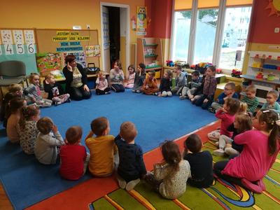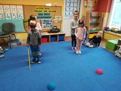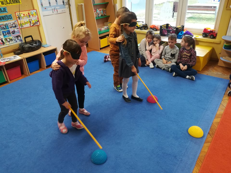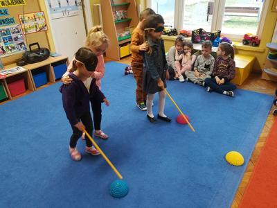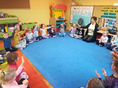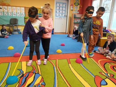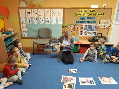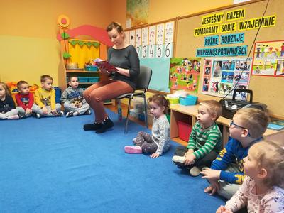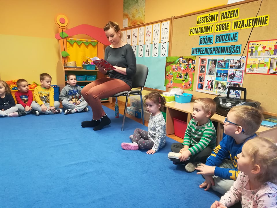 W ramach realizacji styczniowego modułu projektu czytelniczego "Magiczna Moc Bajek" 20 stycznia 2020 dzieci z obu grup wzięły udział w zajęciach pt. "Jesteśmy Razem, pomagamy sobie Wzajemnie. Różne rodzaje niepełnosprawności". Zajęcia rozpoczęły się od wysłuchania opowiadania "Tolerancja" G. Kasdepke, czytanego przez mamę Pawełka z "Biedronek". Po wysłuchaniu treści utworu, dzieci starały się znaleźć odpowiedź na pytanie: "co to jest tolerancja/ co to znaczy być tolerancyjnym?". Następnie uczestniczyły w zajęciach dydaktycznych, podczas których poznały różne rodzaje niepełnosprawności (osoba niepełnosprawna ruchowo, osoba niewidoma, osoba niesłysząca), starały się też dopasować do zdjęć osób niepełnosprawnych atrybuty i udogodnienia przygotowane specjalnie dla nich. Tego dnia dzieci miały również okazję choć przez chwile poczuć się jak osoba niepełnosprawna - uczestniczyły w "torze przeszkód" z zakrytymi oczami i laską, układały wieżę z klocków z zakrytymi oczami i starały się usłyszeć wypowiadane przez kolegów słowo mając na uszach duże, wyciszające słuchawki. Podczas zajęć dzieci miały okazję poczuć się też jak osoba, która nie ma rąk - rysowały po papierze używając stóp i trzymając mazak w ustach. Przedszkolaki przyznały, że jest to naprawdę bardzo trudne zadanie. Na koniec dzieci zaśpiewały wspólnie piosenkę "Budujemy ciszę". Dzięki tym aktywnościom nasze przedszkolaki nabrały pokory i nauczyły się szacunku dla osób niepełnosprawnych. To były bardzo pouczające zajęcia.