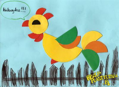 Rodzic pokazuje, w jaki sposób wykonać koguta. Dziecko powtarza jego czynności. Składa duże koło na pół i przykleja je na środku kartki. Jedno średnie koło przykleja jako głowę, a pozostałe składa na pół i przykleja na tułowiu jako skrzydło i kolorowy ogon. Małe czerwone koła składa na pół i przykleja jako dziób, grzebień, dzwonek pod dziobem. Kredkami dorysowuje oko i nogi koguta. Można dorysować płot, na którym siedzi kogut.