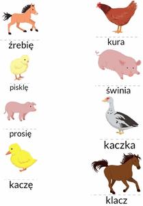 Rodzic prezentuje dziecku obrazek (w załącznikach), na którym są młode i dorosłe zwierzęta wiejskie. Zadaniem dziecka jest nazwać poszczególne zwierzęta i dopasować młode do jego mamy. Rodzic może pomóc dziecku w prawidłowym nazywaniu zwierząt (prosię, źrebię...). Rodzic może poprosić dziecko, aby wyklaskało (podzieliło na sylaby) nazwy zwierząt.