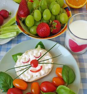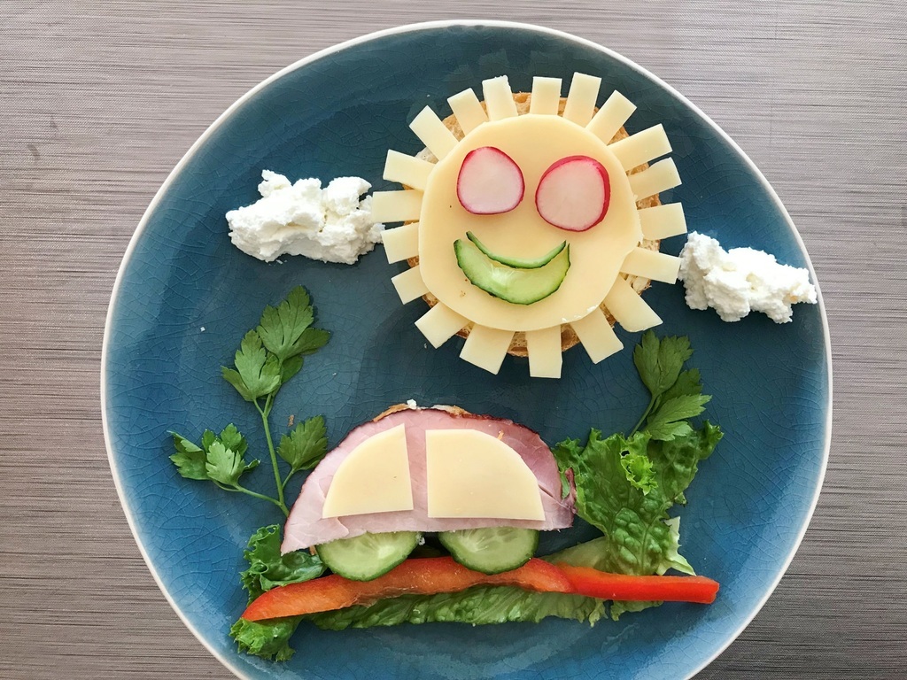 Następnie rodzic szykuje dziecku warzywa pokrojone w rózne kształty (półksiężyce, koła, słupki, nitki) i inne zdrowe produkty (np. twarożek, hummus, chudą wędlinę, gotowane jajko, ser żółty).