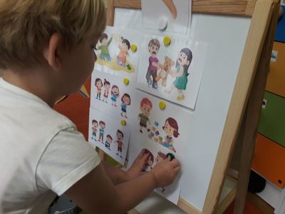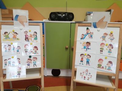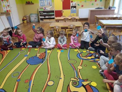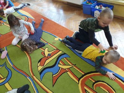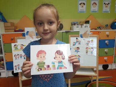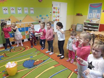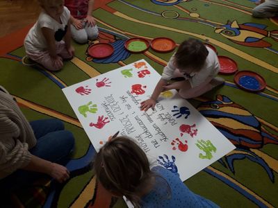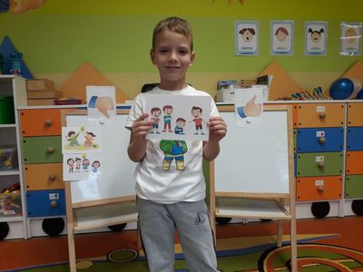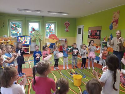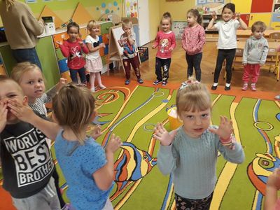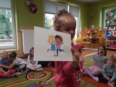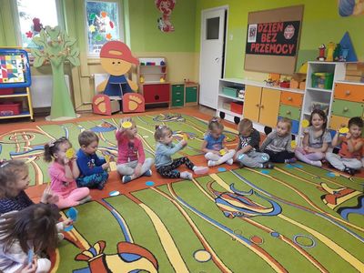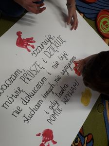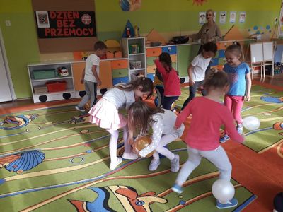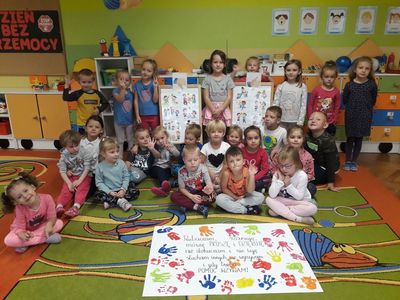 W piątek 2-go października "Biedronki" i "Motylki" wzięły udział w zajęciach z okazji obchodów Dznia Bez Przemocy. Tematem przewodnim zajęć była złość i poszukiwanie sposobów na radzenie sobie z nią. Na początku zajęć dzieci z dużą uwagą wysłuchały opowiadania pt. "Historia Jasia" i póbowały nazywać emocje, które odczuwał chłopiec w różnych sytuacjach. Dzieci uczestniczyły też w zabawie ruchowej "ochraniamy balony" - zadaniem uczestników było próbować przebić w rytm muzyki balony pozostałych dzieci, jednocześnie starając się ochronić swój balon. Dzieci opisywały jak się czuły, gdy ktoś próbował przebić im balon – czy się bały, a może czuły złość? Przedszkolaki wzięły także udział w burzy mózgów dotyczącej metod radzenia sobie ze złością, oraz śpiewały piosenkę pt. "Osa", dzięki której poznały sposoby na radzenie sobie ze złością w taki sposób, aby nie robic nikomu krzywdy. Bardzo pouczające było także przeprowadzenie doświadczenia z dwoma jabłkami - jedno było zdrowe, drugie pobijane w środku - dzieci dowiedziały się, że przemoc to nie tylko czyny, ale także słowa, którymi można bardzo mocno ranić inne osoby. "Biedronki" i Motylki" utrwaliły tego dnia Kodeks przedszkolaka, określały czy zachowania przedstawione na ilustracjach są dobre czy złe. Dzieci odbiły także swoje rączki wokół wierszyka o dobrym zachowaniu, jako dowód na to, że wiedzą, że właśnie w taki sposób należy się zachowywać.