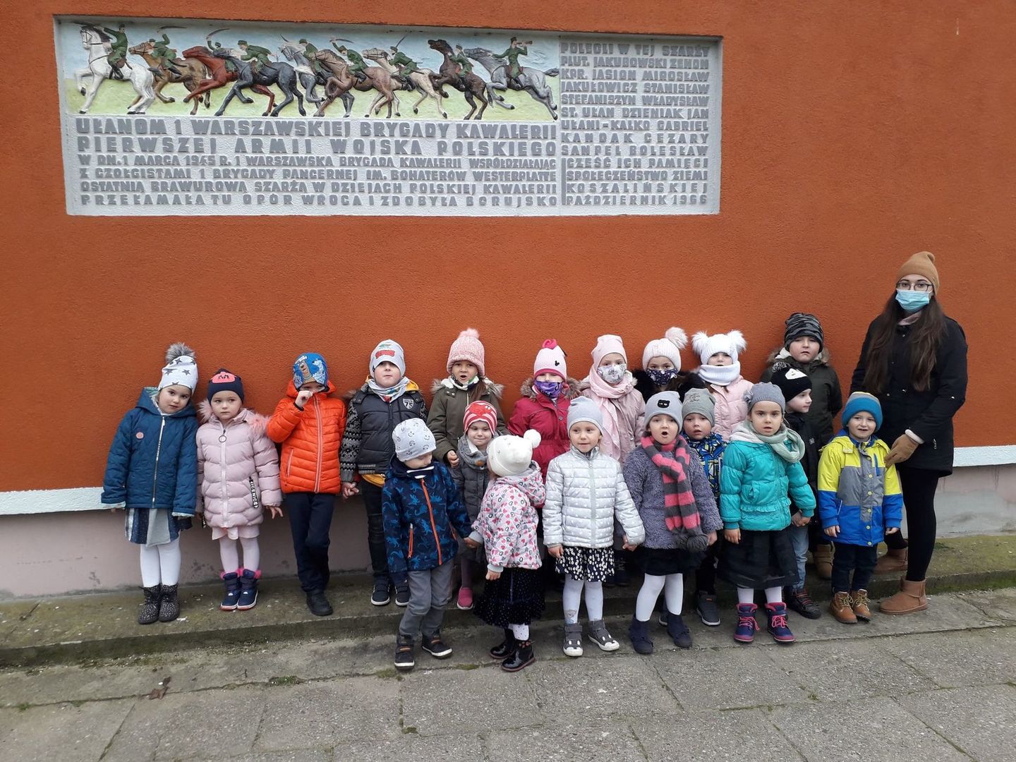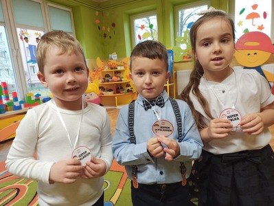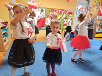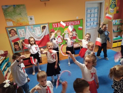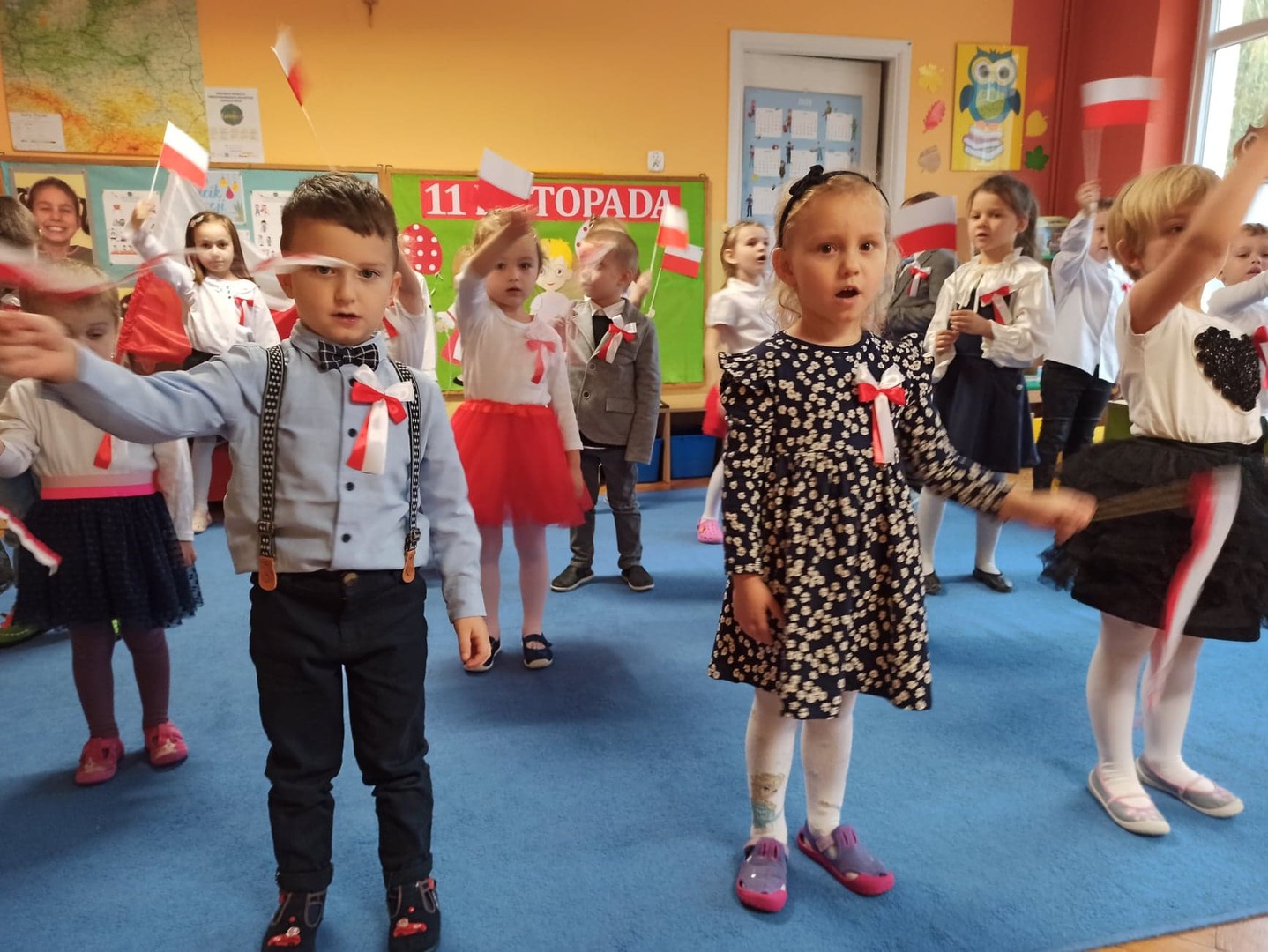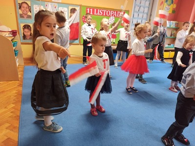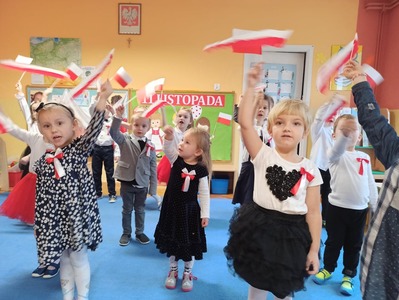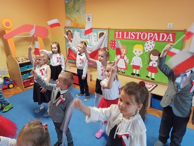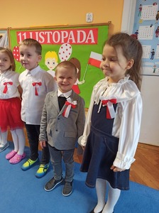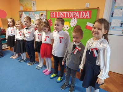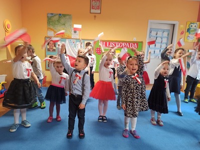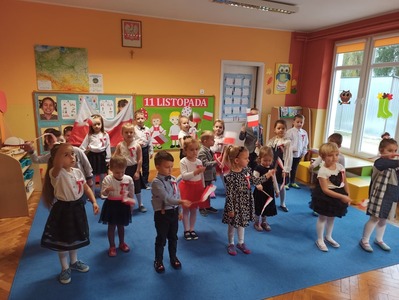 W wtorek 10 listopada w naszym przedszkolu odbyła się uroczystość z okazji obchodów Święta Niepodległości. Dzieci przyszły tego dnia do przedszkola ubrane na galowo i zaprezentowały program artystyczny o tematyce patriotycznej - były wiersze, piosenki, a także w ramach  ogólnopolskiej akcji "szkoła do hymnu" wszystkie dzieci odśpiewały Mazurek Dąbrowskiego. Tego dnia dzieci udały się również na spacer, aby pod pomnikiem zapalić znicz i uczcić w ten sposób pamięć o osobach, które swoimi czynami przysłużyły się Polsce.