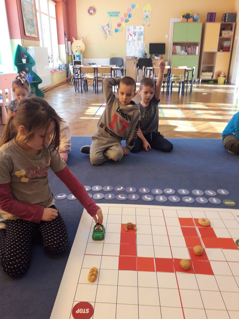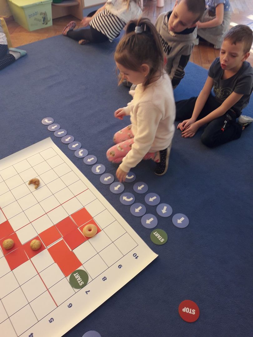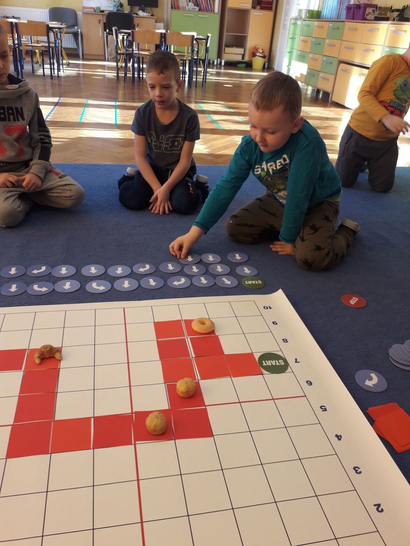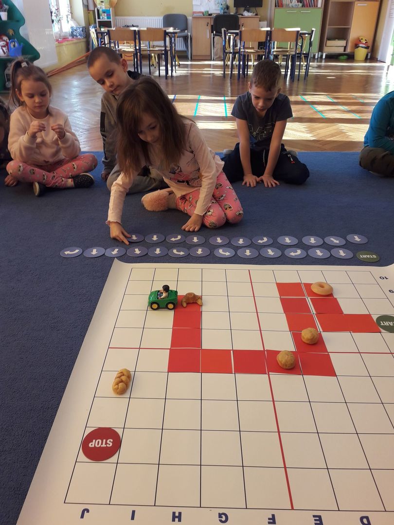 W tłusty czwartek grupa "Motylki" bawiła się w kodowanie. Najpierw dzieci odszyfrowały zakodowanego pączka. Kolejnym zadaniem było zaprogramowanie trasy kierowcy, który jadąc do domu musiał odwiedzić różne cukiernie i kupić słodkości. Trasę dzieci zaprogramowały przy pomocy symboli.