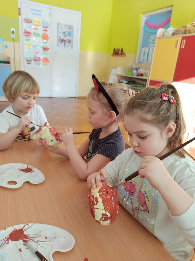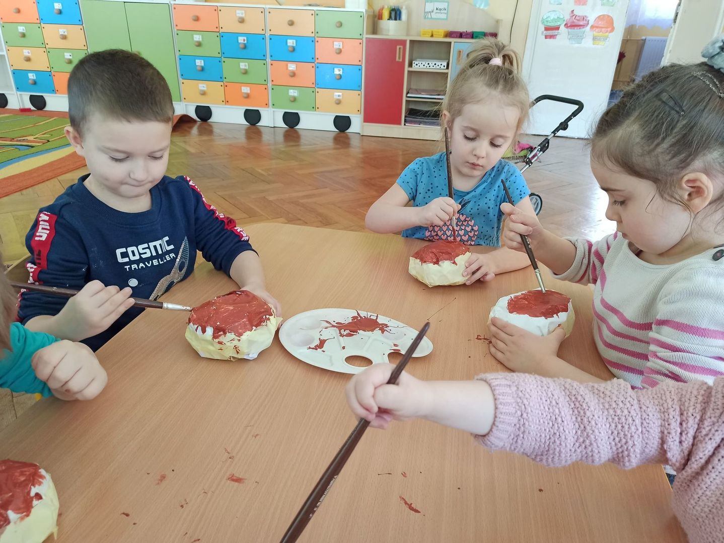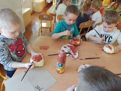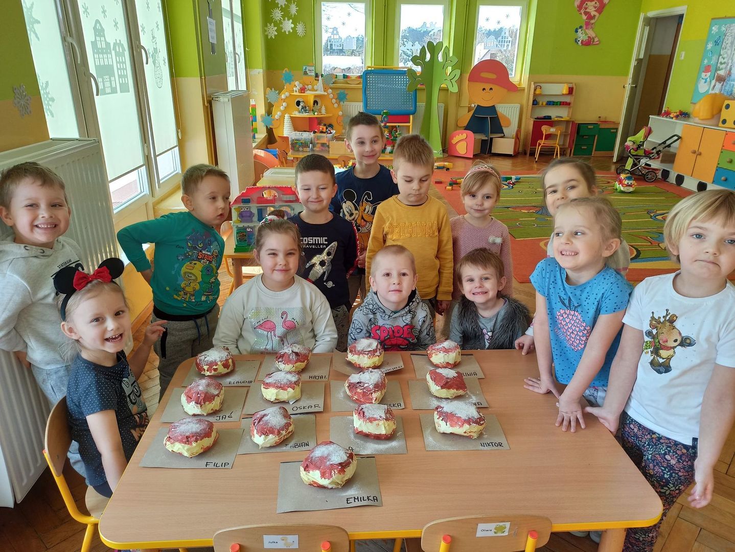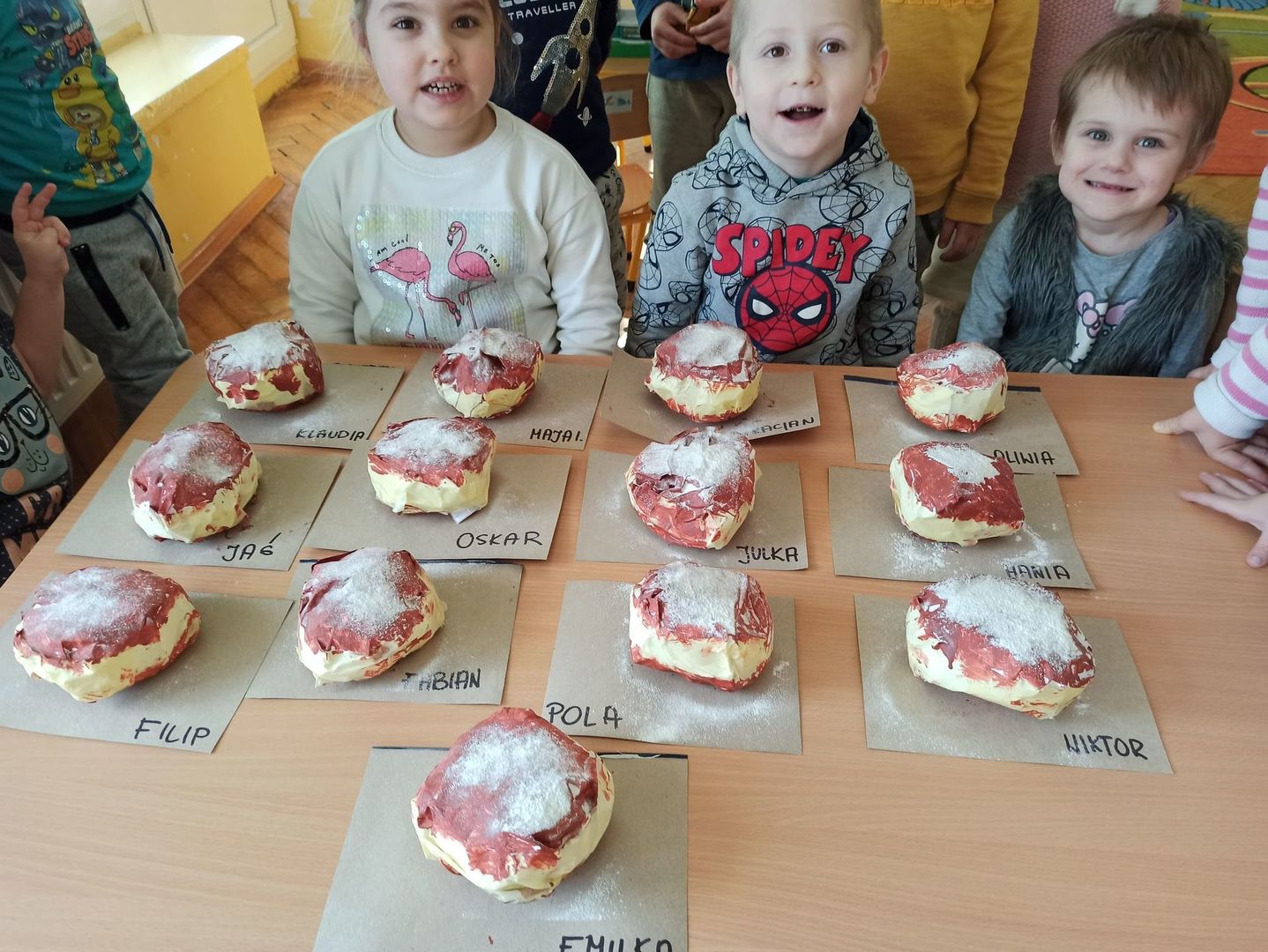 W grupie maluchów, z okazji tłustego czwartku dzieci wykonały bardzo apetyczne prace plastyczne - kulkę papieru pomalowały brązową farbą a następnie posypały mąką. Pączki wyglądały jak prawdziwe!