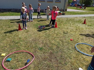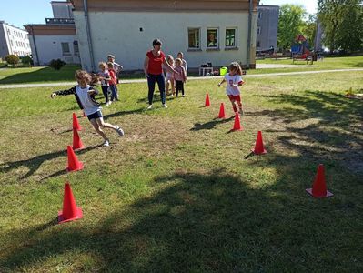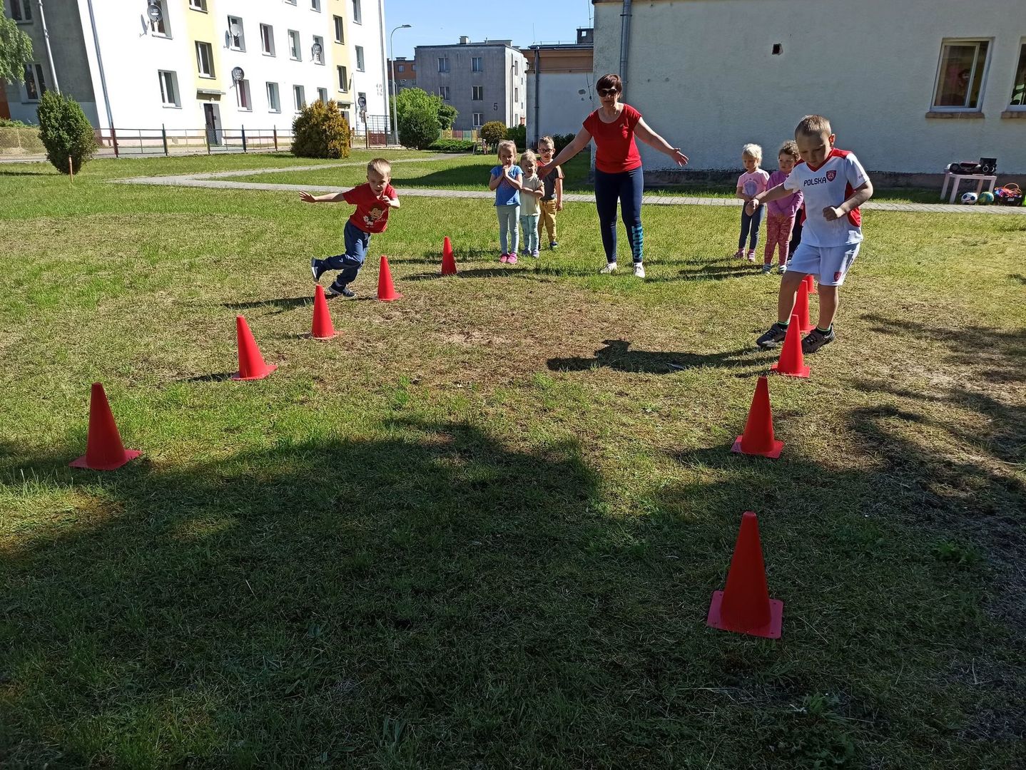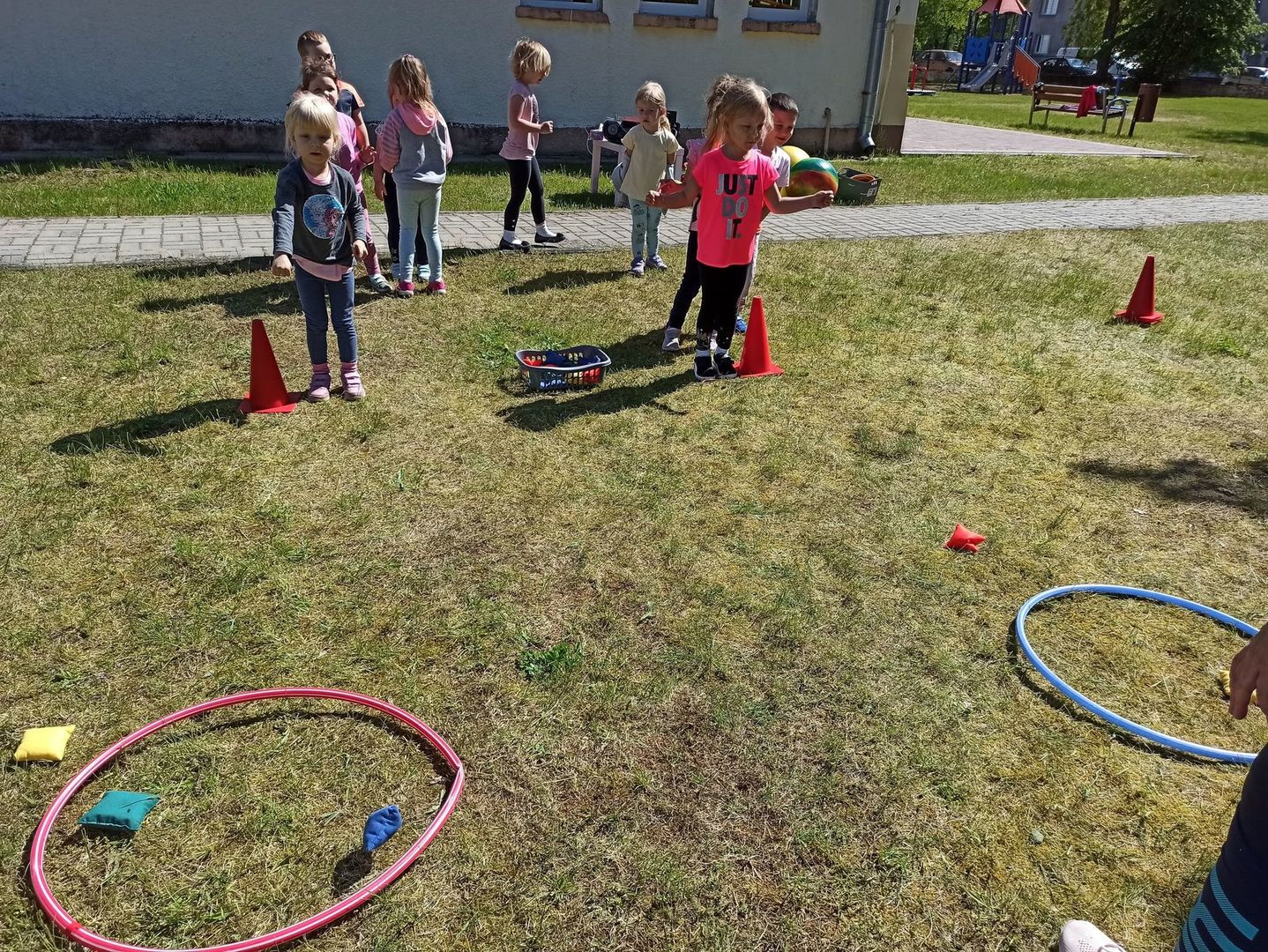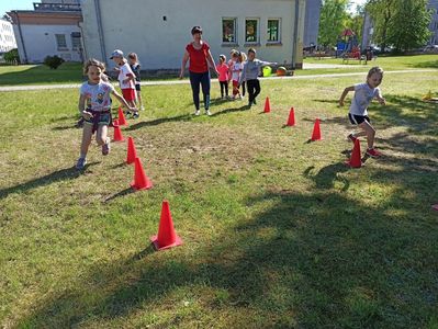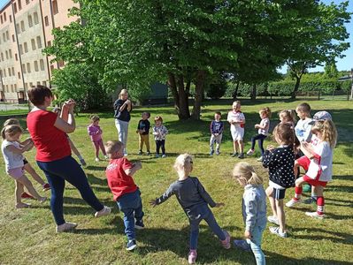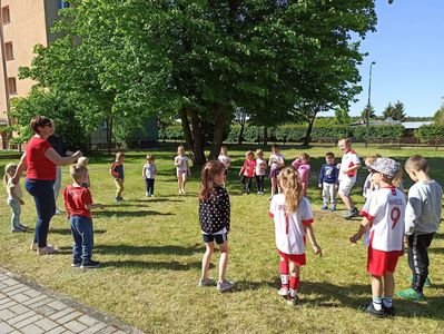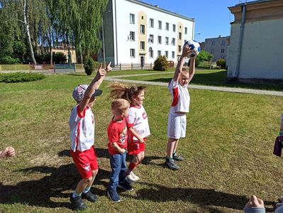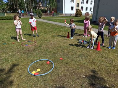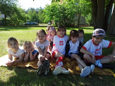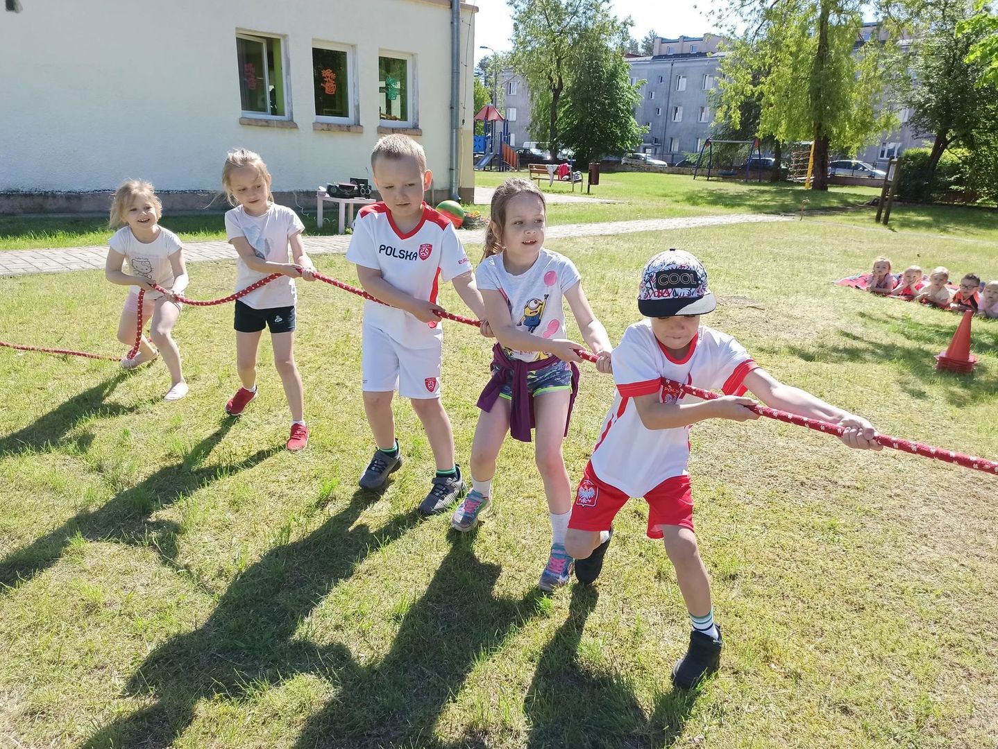 W poniedziałek 31 maja obchodziliśmy w naszym przedszkolu Dzień Sportu. Tego dnia wszystkie dzieci i ich wychowawczynie przyszły do Przedszkola w strojach sportowych. Głównym celem było zachęcenie dzieci do aktywności ruchowej na świeżym powietrzu, ale też integrowanie się grup przedszkolnych, kształtowanie zachowań prozdrowotnych, nabywanie wiary we własne siły i możliwości oraz wzbogacanie przeżyć poprzez szlachetne współzawodnictwo. Zawody sportowe poprzedzone zostały porządną rozgrzewką a także zabawami tanecznymi przy znanych dzieciom piosenkach. Każdy przedszkolak bardzo przejęty brał udział w przygotowanych konkurencjach sportowych. Każde prawidłowo wykonane ćwiczenie budziło w dzieciach ogromna radość i zadowolenie z dobrze wykonanego zadania. Wszystkie zadania sprawiły dzieciom dużo radości.