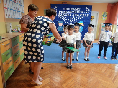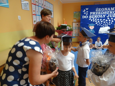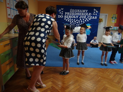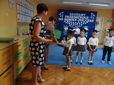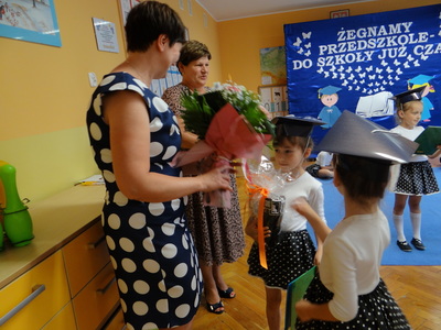 Pani dyrektor wręczyła starszakom dyplomy ukończenia przedszkola, podziękowała rodzicom za bezinteresowną pomoc i aktywne uczestnictwo w życiu przedszkola. Rodzice również podziękowali pani dyrektor oraz nauczycielkom i pracownikom przedszkola za opiekę nad dziećmi, cierpliwość, wychowanie i edukację.