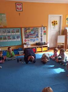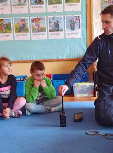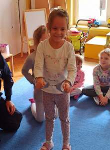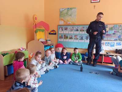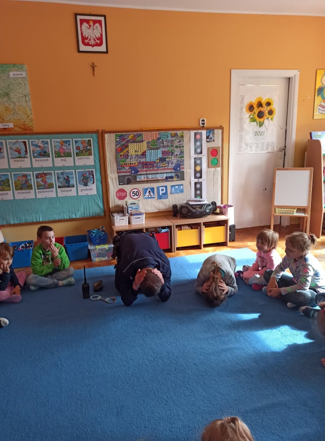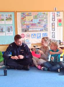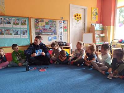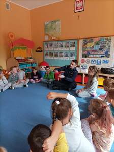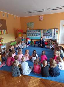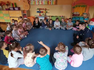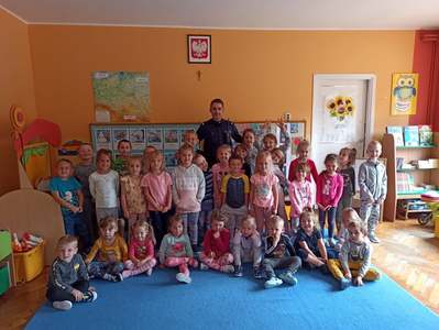 21 września nasze przedszkole odwiedził Pan Policjant. Tematem spotkania było utrwalenie z dziećmi zasad ruchu drogowego oraz przypomnienie zagadnień dotyczących bezpieczeństwa dzieci w przedszkolu i w domu. Pan policjant, w formie praktycznej, przypomniał podstawowe zasady zachowania się podczas przechodzenia przez jezdnię. Policjant poinformował i zademonstrował dzieciom również, w jaki sposób należy się zachowywać podczas ataku psa. Dzieci z dużym zainteresowaniem słuchały rad i wskazówek zaproszonego gościa, a także zadawały pytania. Duże zainteresowanie u dzieci wywołało umundurowanie i wyposażenie policjanta, a w szczególności kajdanki i radio. Na zakończenie wizyty przedszkolaki wręczyły panu policjantowi w podziękowaniu mały upominek.