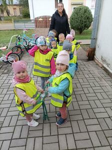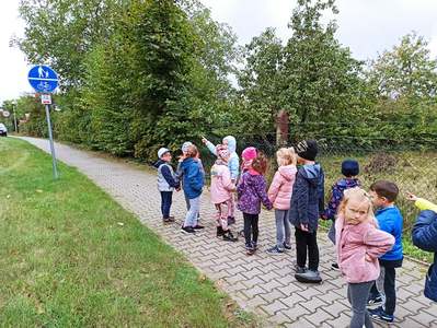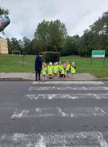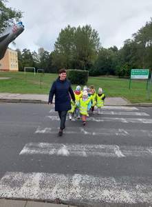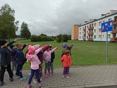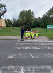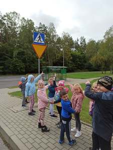 W środę 22 września 2021 r. w ramach realizacji tematu tygodniowego „Moja droga do przedszkola” dzieci z grup "Biedronki" i "Motylki" udały się na wycieczkę na przejście dla pieszych. Maluszki ubrane w kamizelki odblaskowe ćwiczyły umiejętność przechodzenia po pasach. Starszaki także utrwalały wiadomości związane z bezpieczeństwem na drodze. Ponad to, dzieci, podczas spaceru w okolicy przedszkola wyszukiwały znaki drogowe, opisywały ich wygląd (kształt, kolor, co przedstawiają) a także omawiały ich znaczenie.