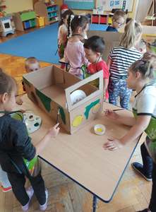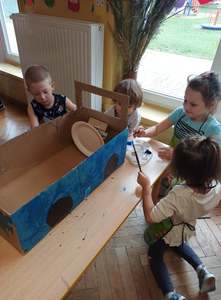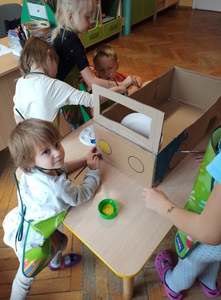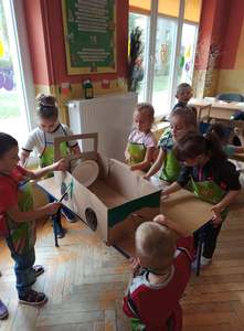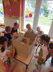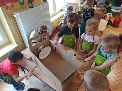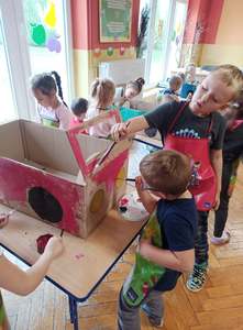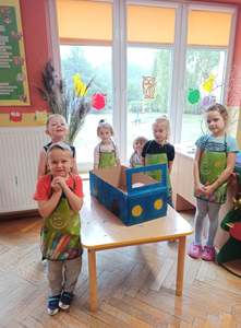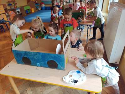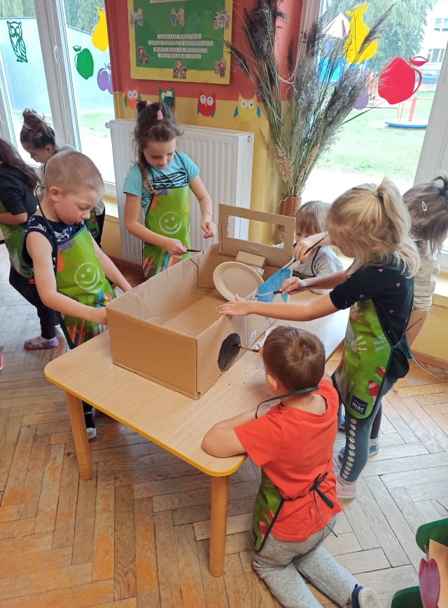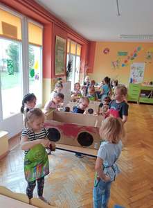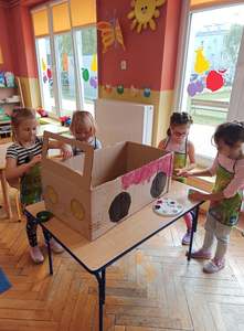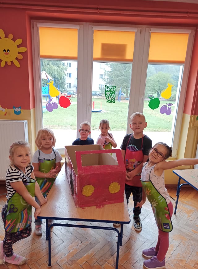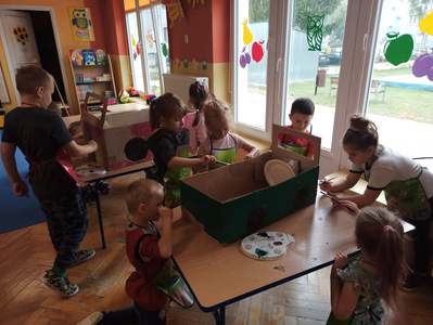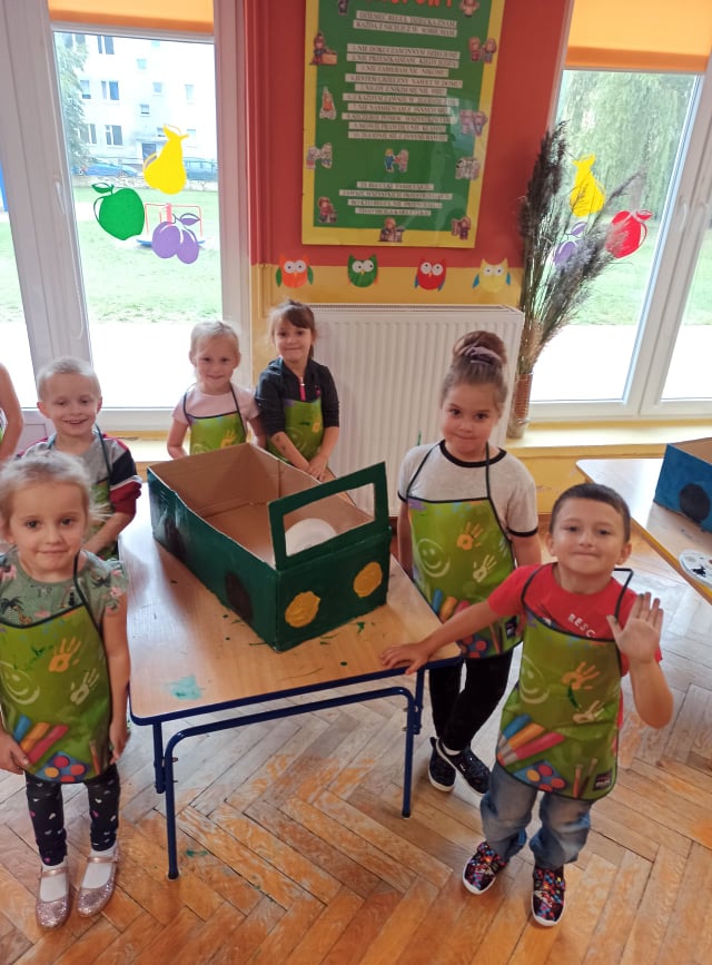 23 września dzieci z grupy starszaków zrealizowały jedno z zadań Ogólnopolskiego Projektu Edukacyjnego "Z darami natury świat nie jest ponury" - "Karton i jego drugie życie". Celem naszych działań było kreatywne wykorzystanie kartonu. Przy okazji tematu tygodniowego "Moja droga do przedszkola" dzieci wykonały piękne samochody, które posłużą im do wspólnych zabaw w sali. "Motylki" podzielone na trzy zespoły ćwiczyły umiejętność pracy z grupie podczas malowania kartonów farbami. Dzieci współpracowały, wspólnie ustaliły kolor swojego samochodu, a także podzieliły się zadaniami. Przedszkolaki pracowały zgodnie i wszystkie grupy były niezwykle dumne z efektów swojej pracy.