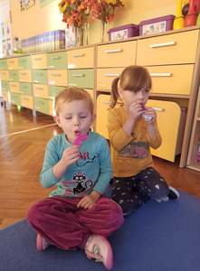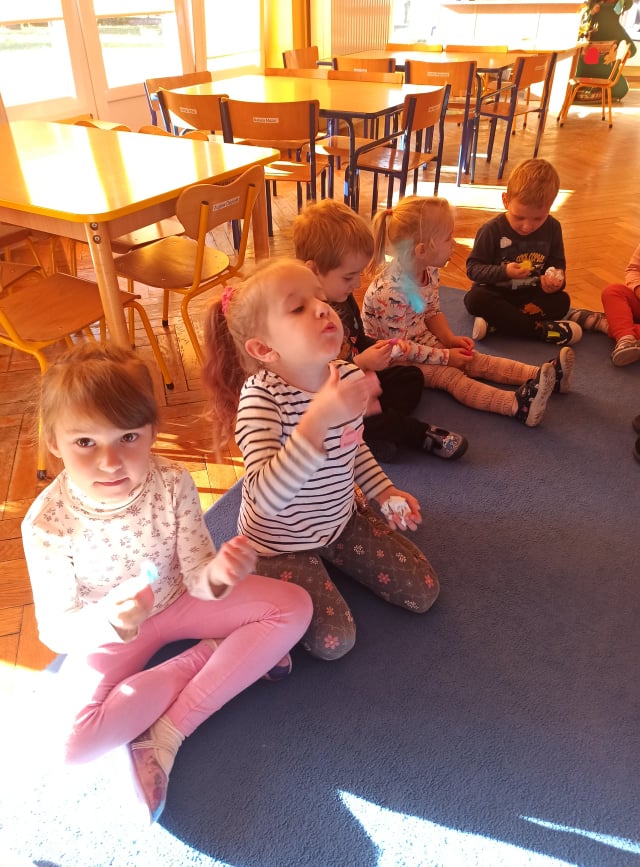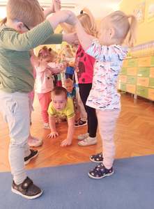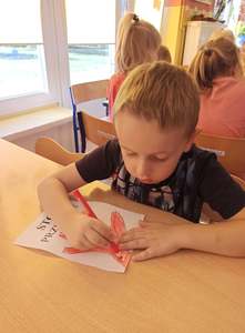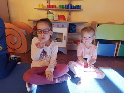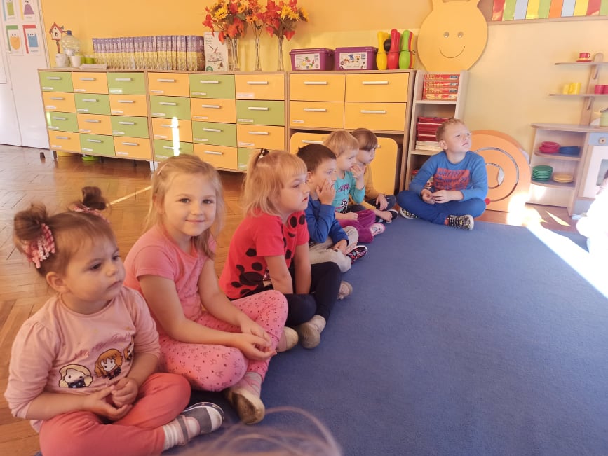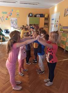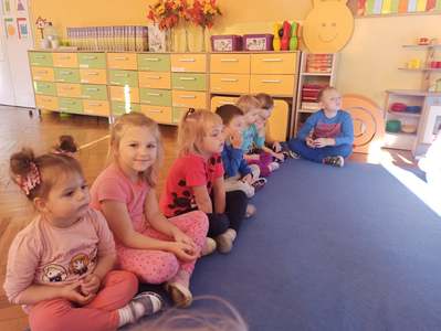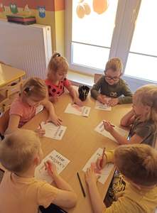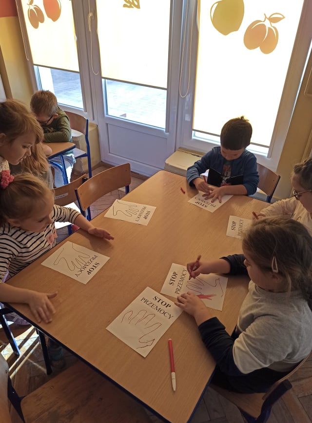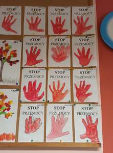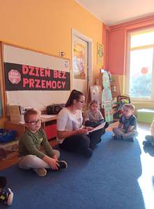 2 października dzieci z obu grup przedszkolnych zebrały się w sali starszaków, aby wspólnie uczestniczyć w zajęciach zorganizowanych w ramach obchodów Międzynarodowego Dnia bez Przemocy. Przedszkolaki wysłuchały bajki terapeutycznej pt. "Lew Drapuś", a następnie na podstawie tekstu starały się odpowiedzieć na pytanie czym jest przemoc. Podczas zajęć dzieci szukały również sposobów radzenia sobie ze złością - między innymi gniotły i wyrzucały w górę kartkę papieru oraz dmuchały piórka. Zajęcia zakończyły się utworzeniem długiego tunelu przyjaźni oraz wykonaniem pracy plastycznej pt. "Stop przemocy". To były bardzo ważne i pouczające zajęcia.