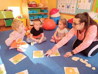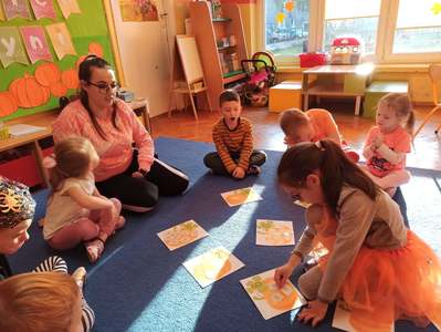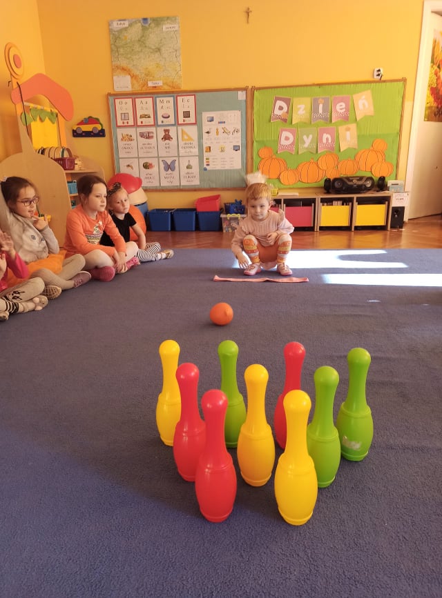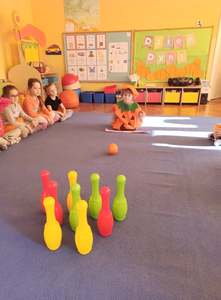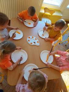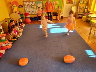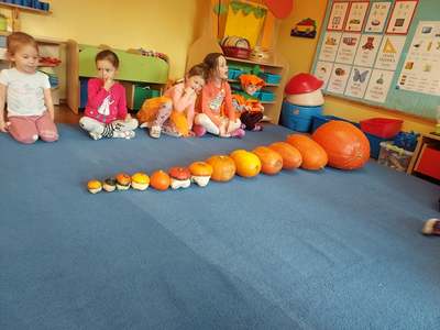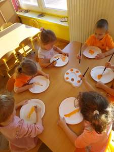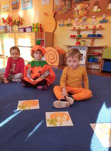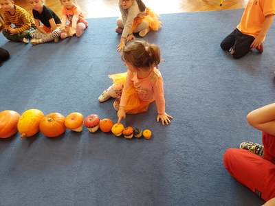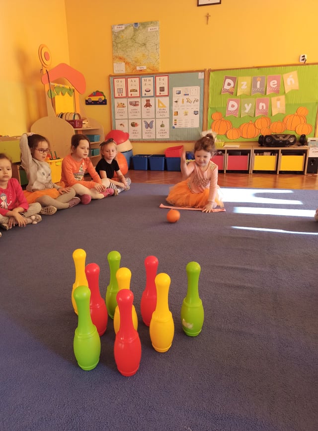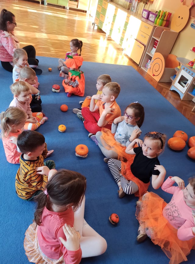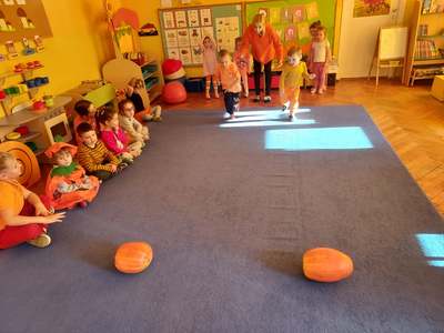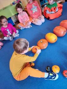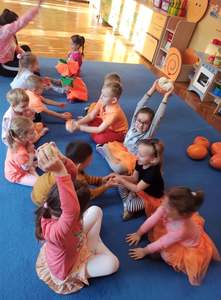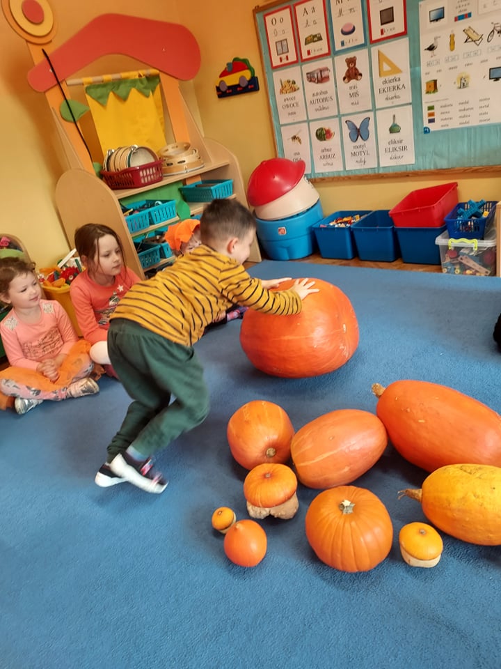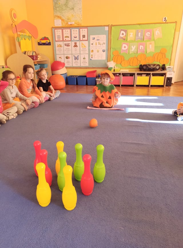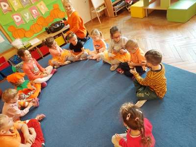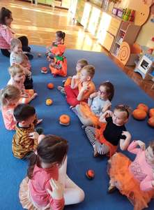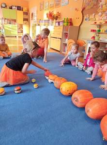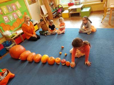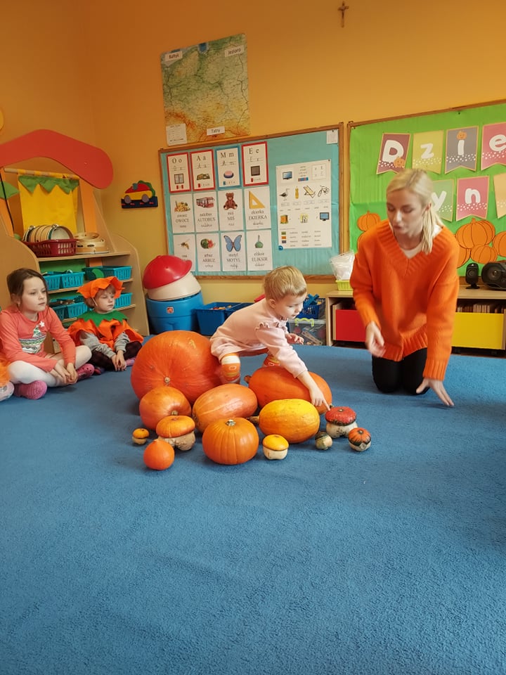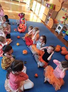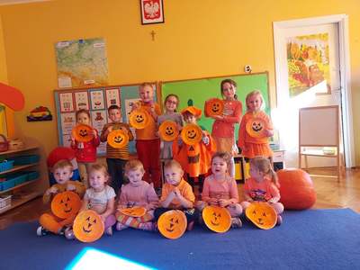 29 października dzieci z grup "Biedronki" i "Motylki" spotkały się, wszystkie ubrane na pomarańczowo, aby wspólnie świętować Dzień Dyni. Z tej okazji, dzięki uprzejmości rodziców, dzieci uczestniczyły w aktywnościach, do których wykorzystywały prawdziwe dynie. Przedszkolaki utrwalały pojęcia duży/mały, większy/mniejszy i ustawiały dynie od największej do najmniejszej. Dzieci bawiły się w ulubiona zabawę "dynia parzy!", grały w kręgle w których zamiast klasycznej kuli wykorzystywały dynię, a także uczestniczyły w zabawach sportowych i muzycznych z wykorzystaniem dyń. Dzieci uczestniczyły również w zabawie matematyczniej, w której odczytywały zapisane liczby i przeliczały pestki dyni. Na koniec zajęć dzieci wykonały pracę plastyczną malując papierowy talerzyk tak, aby wyglądał jak wesoły lampion z dyni.