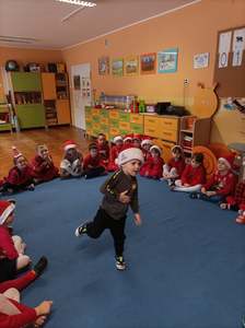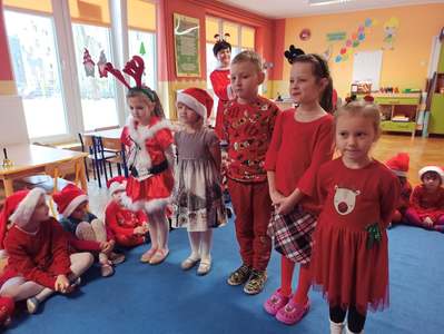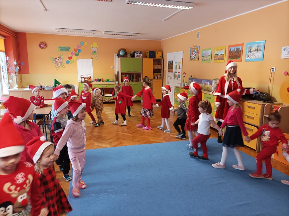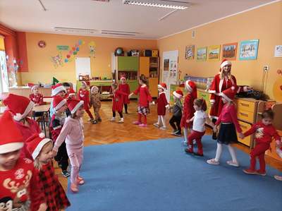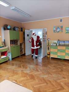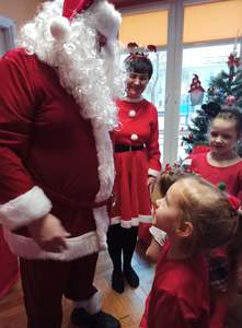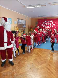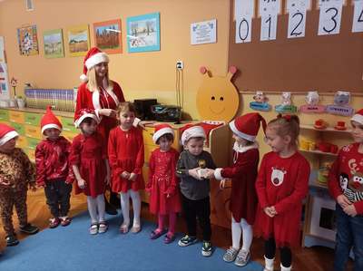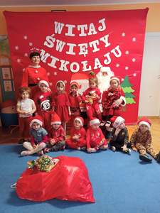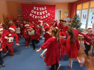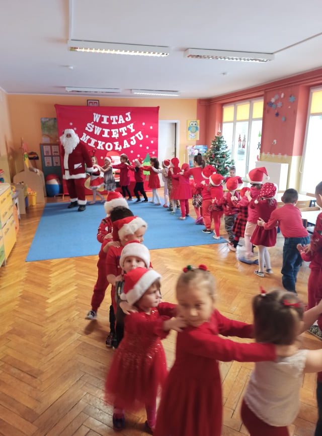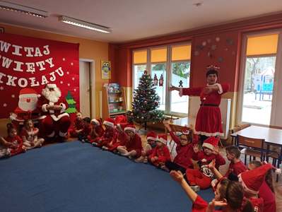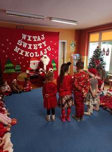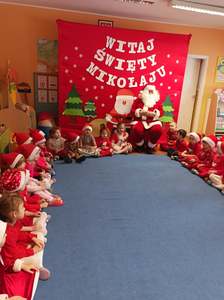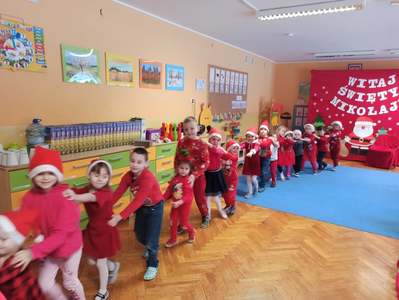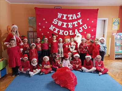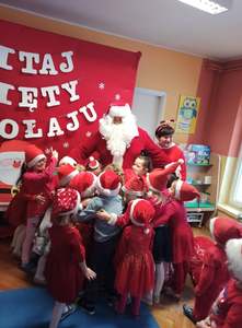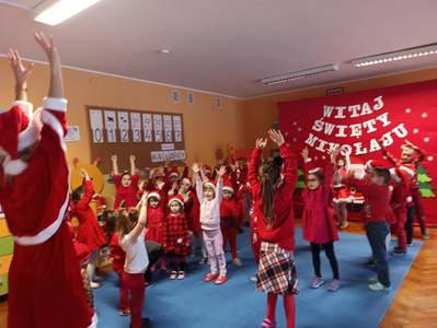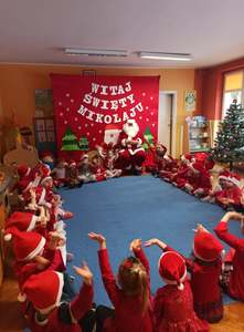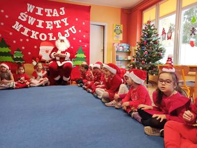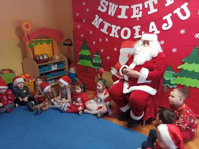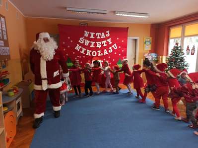 Święty Mikołaj lubi odwiedzać dzieci na całym świecie. 6 grudnia z workiem pełnym prezentów przyjechał również do naszego przedszkola. Od samego rana Święty Mikołaj witał wszystkie dzieci, które bardzo chętnie pozowały z Nim do pamiątkowego zdjęcia. Po śniadaniu, oczekując na Mikołaja dzieci z wielkim zaangażowaniem brały udział w rozmaitych zabawach ruchowych i ze śpiewem. Po wykonaniu wszystkich zadań dzieci nasłuchiwały dźwięku dzwoneczków zwiastujących przybycie Świętego Mikołaja. Przedszkolaki były bardzo szczęśliwe, a kiedy znalazły się blisko upragnionego Gościa, troszkę zawstydzone. Św. Mikołaj wręczył oczywiście dzieciom wielki wór wypełniony prezentami. Za otrzymane upominki dzieci odwdzięczyły się recytacją wierszyków i śpieaniem piosenek.