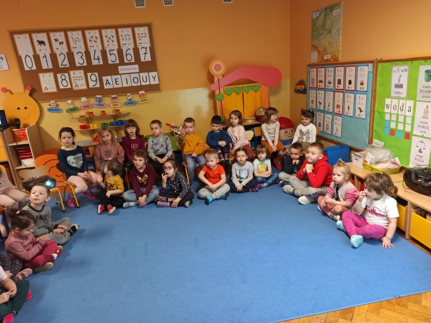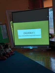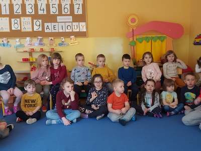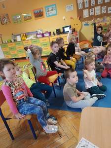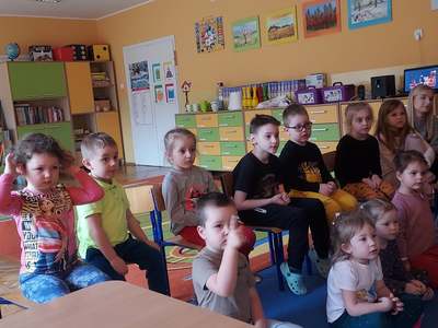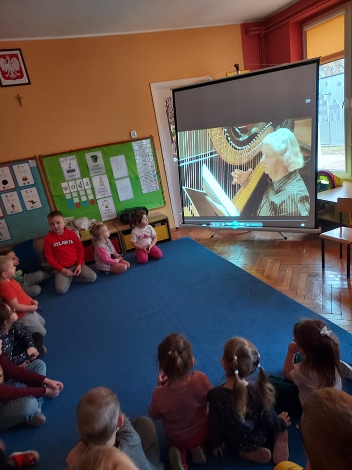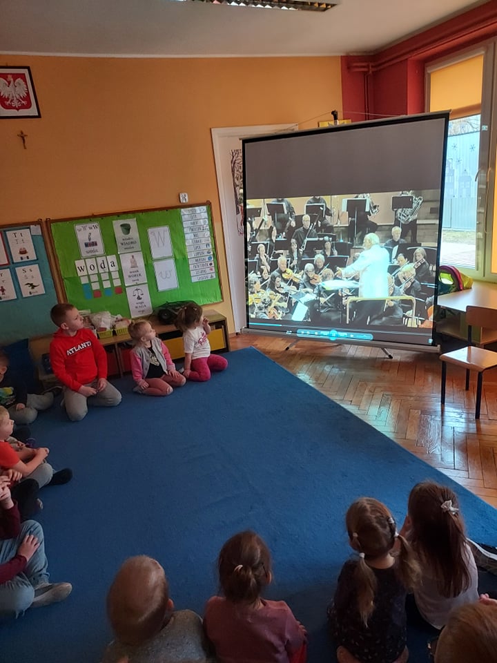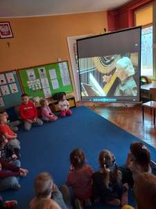 W środę 16.04 dzieci z obu grup zebrały się w sali grupy "Motylki" aby porozmawiać o muzyce i instrumentach w ramach realizacji tematu tygodniowego "Muzyka wokół nas". Przedszkolaki poznały wgląd różnych instumentów, a także dowiedziały się w jaki sposób gra się na nich oraz jakie wydają dźwięki. Dzieci z zachwytem obejrzały koncert orkiestry symfonicznej, utrwalając tym samym nazwy: filharmonia, dyrygent, muzycy, nuty, publiczność, scena. Dzieci odpowiadały na zagadki słuchowe, utrwalając nazwy instrumentów.