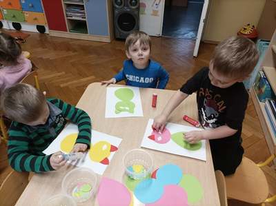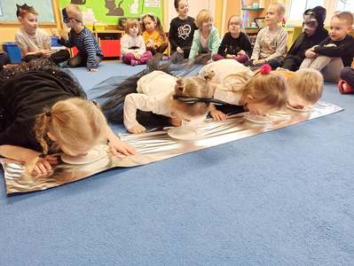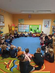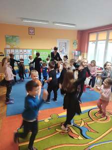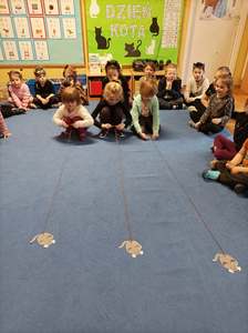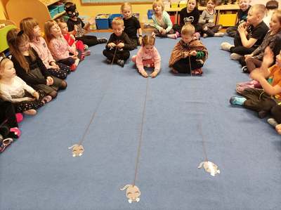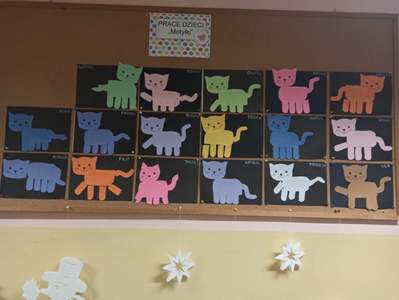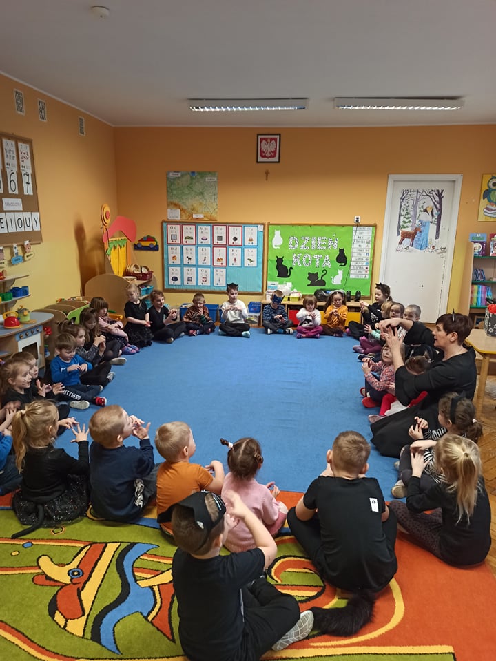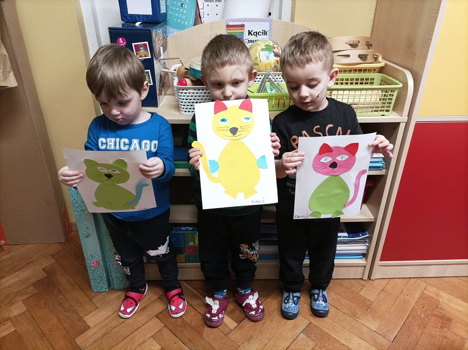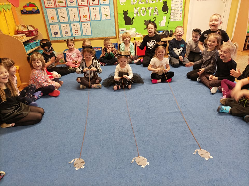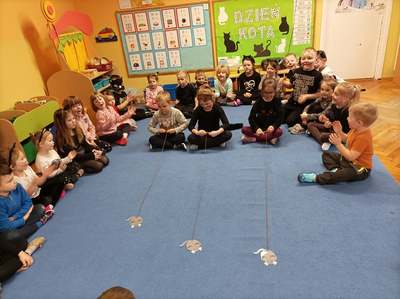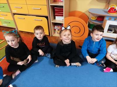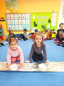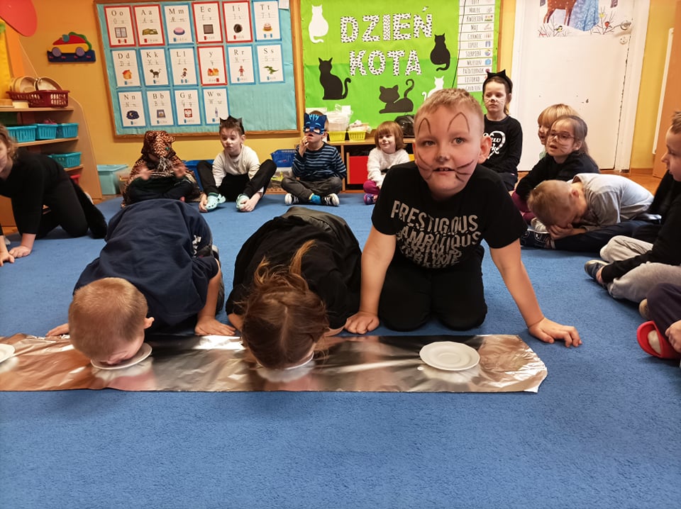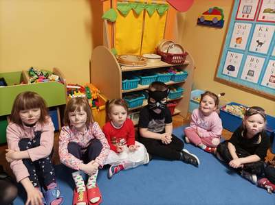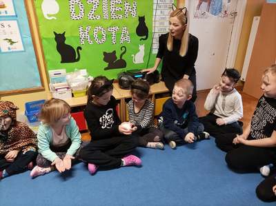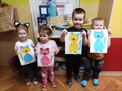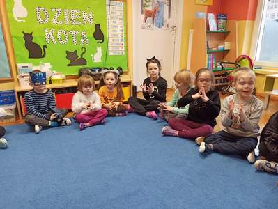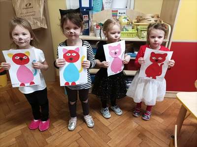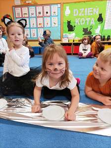 17.02 obchodziliśmy Dzień Kota. Wszystkie dzieci upodobniły się do czworonożnych przyjaciół, poprzez wymalowane na swoich twarzach piękne noski, wąsy i typowe dla kotków uszka. Z tej okazji dzieci zebrały się w sali starszaków na wspólne świętowanie. Były konkursy, gry i zabawy przy muzyce: "Mały kotek sobie śpi", zabawa paluszkowa "5 małych kotków", zabawa taneczna do piosenki "4 rude koty". Dzieci nawijały włóczke na patyczek aby jak najszybciej złapać myszkę, piły językiem mleczko z talerzyka oraz uczestniczyły w zabawie integracyjnej "podaj włóczkę". Zajęcia zwieńczone zostały wykonaniem pracy plastycznej "Kolorowy kotek".