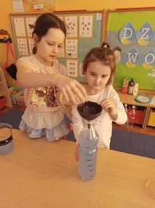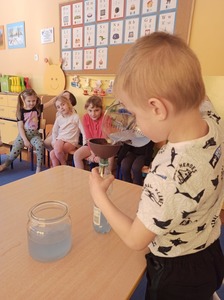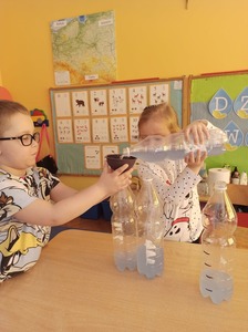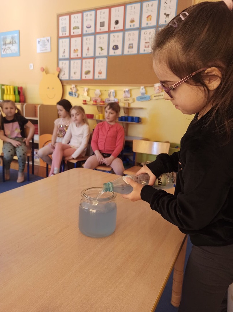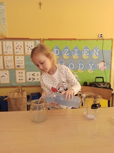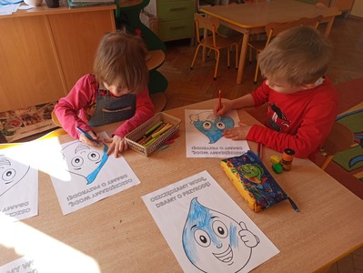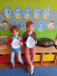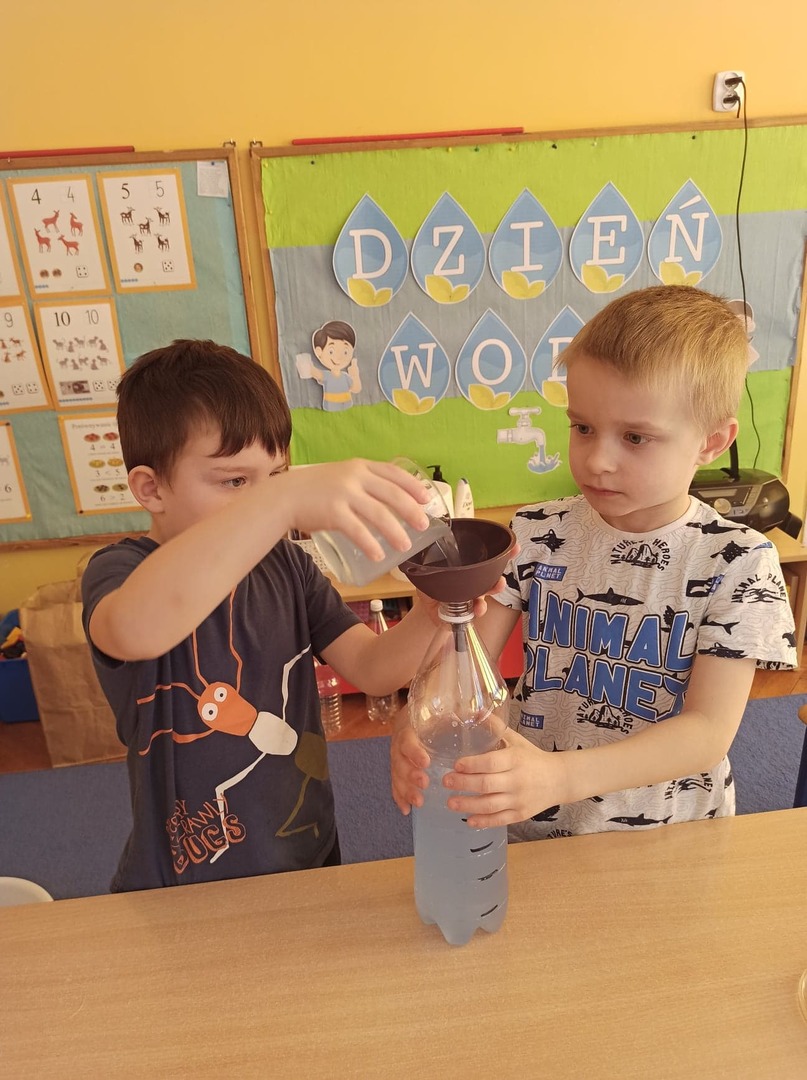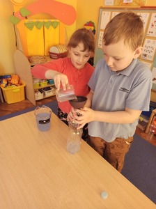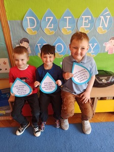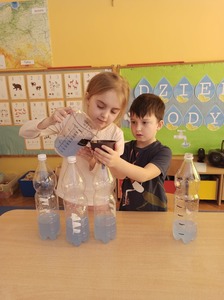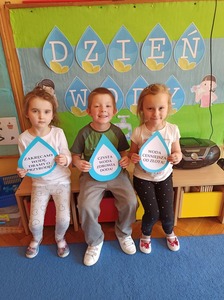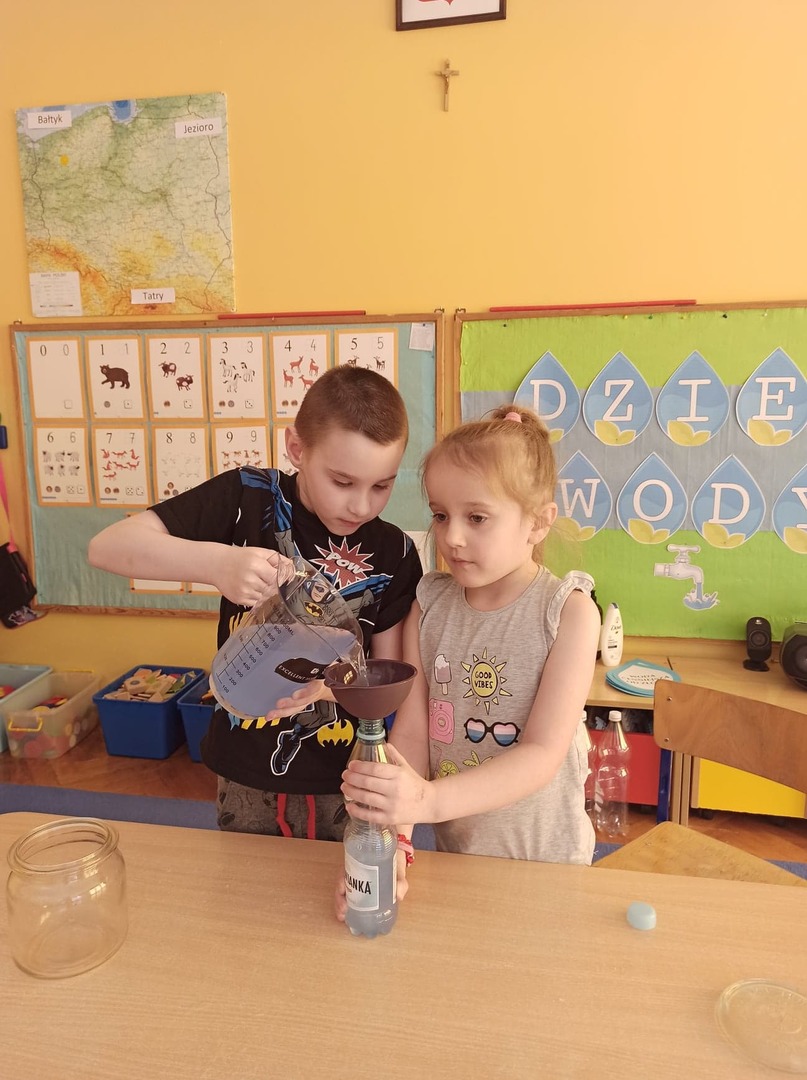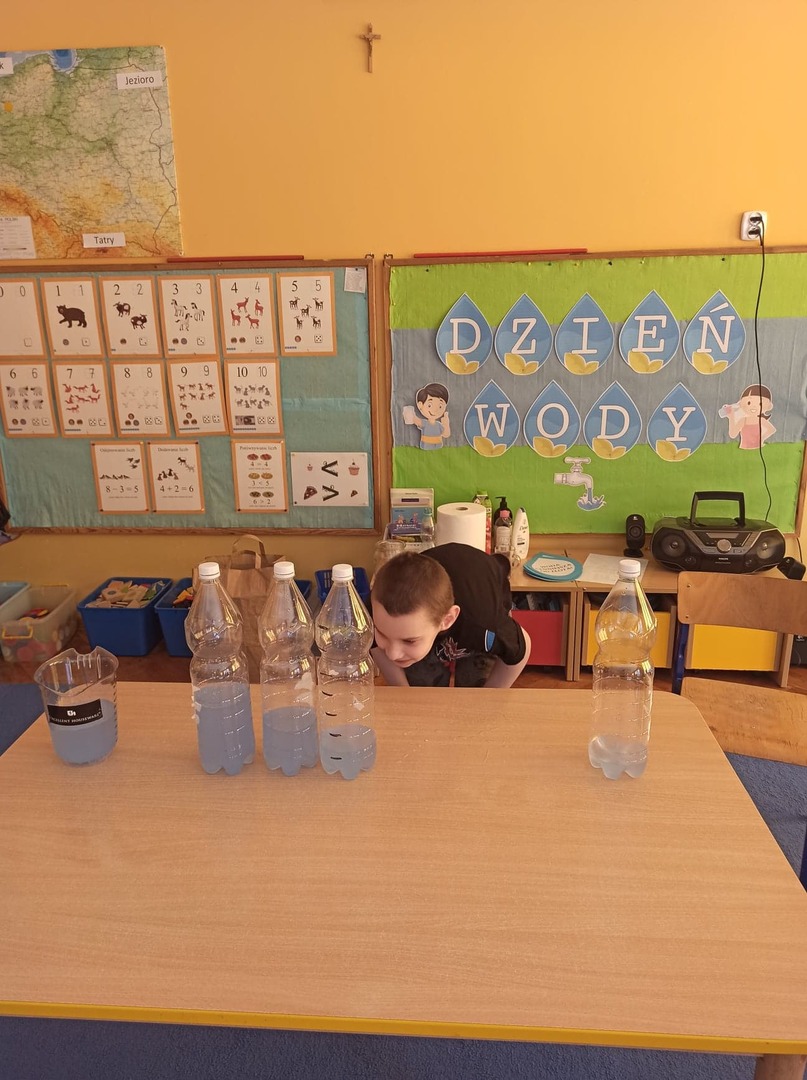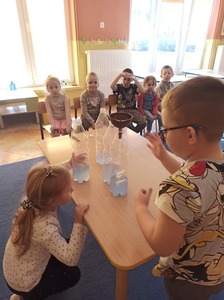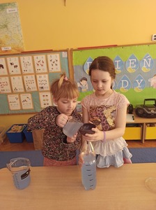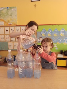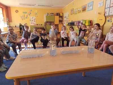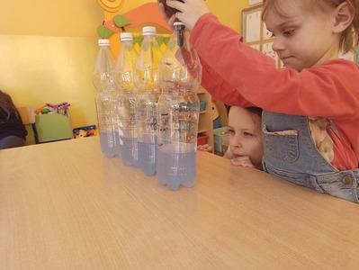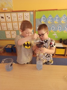 23 marca dzieci z grupy "Motylki" uczestniczyły w zajęciach o wodzie w ramach obchodów Światowego Dnia Wody. Starszaki aktywnie uczestniczyły w zabawach badawczych, których celem było kształtowanie pojęcia mierzenia objętości i stałości objętości. Dzieci wykonały szereg czynności, które miały odpowiedzieć na pytania: Ile kubków wody mieści się w butelce? Czy w butelkach jest tyle samo wody? Czy woda z butelki zmieści się do słoika? Przedszkolaki z dużym zaangażowaniem uczestniczyły w zajęciach - stawiały hipotezy i wyciągały wnioski po przeprowadzonych doświadczeniach. Podczas zajęć dzieci rozmawiały także o konieczności oszczędzania wody i utrwaliły w pamięci hasło "oszczędzamy wodę, dbamy o przyrodę!".