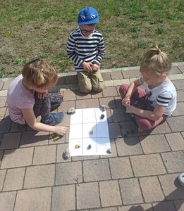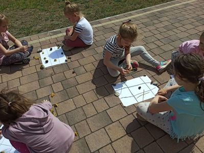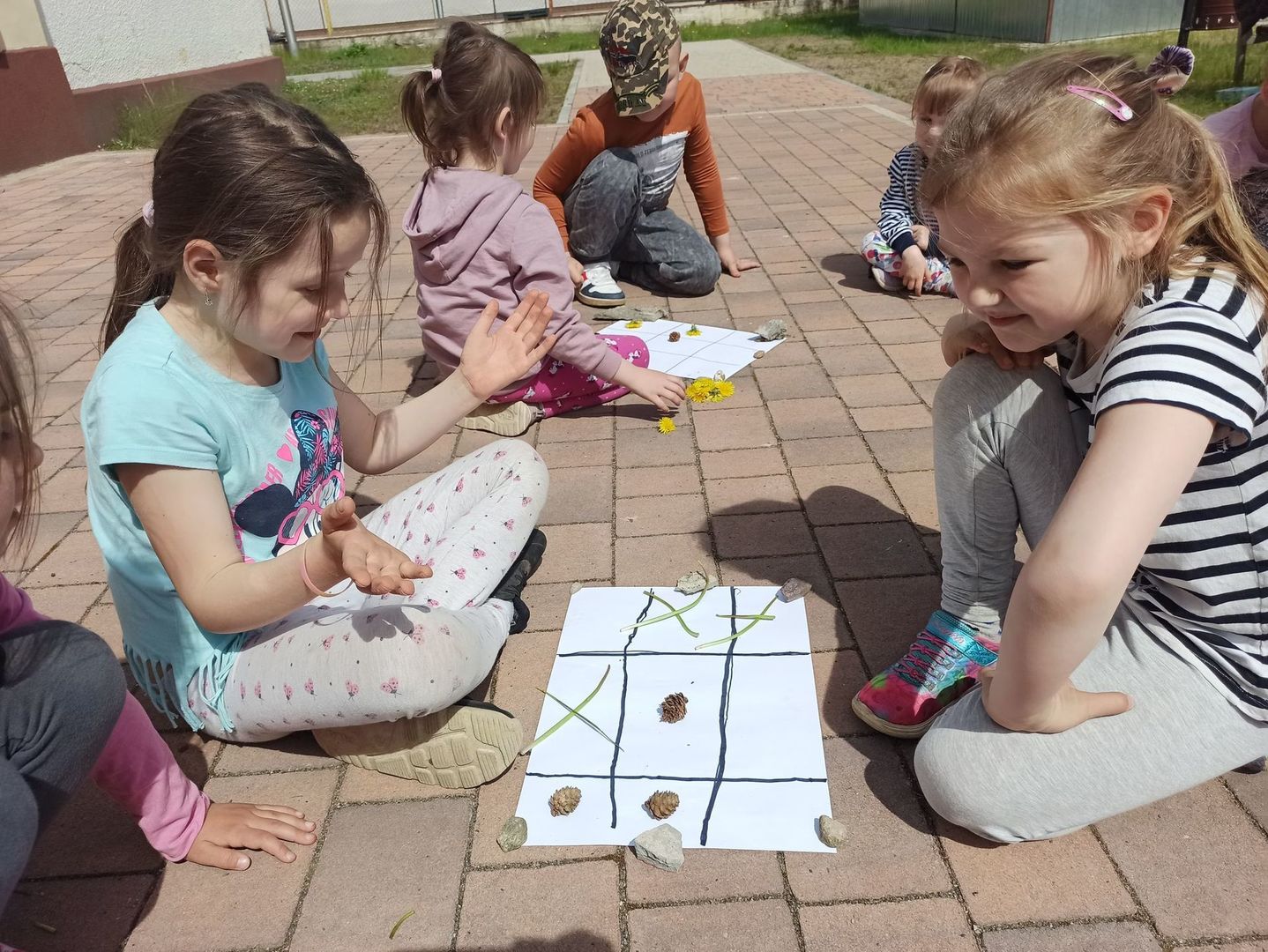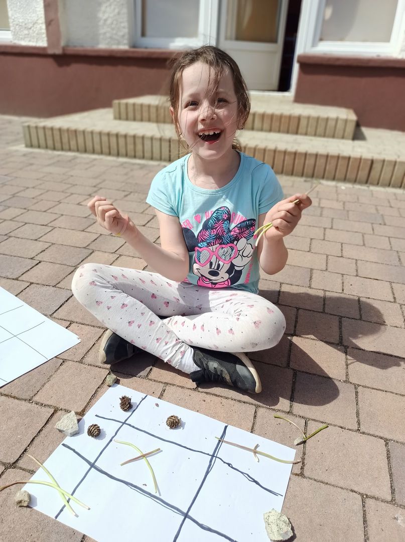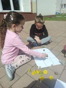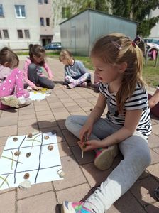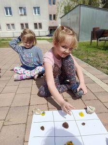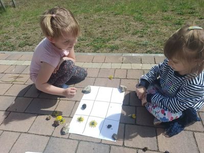 Wtorek 10.05 był pierwszym, naprawdę ciepłym dniem tej wiosny. Dzieci z grupy "Motylki" podczas pobytu w przedszkolnym ogrodzie zrealizowały kolejne zadanie z ogólnopolskiego projektu edukacyjnego "Z darami natury świat nie jest ponury". Przedszkolaki stworzyły grę w kółko i krzyżyk z dostępnych na podwórku materiałów przyrodniczych. "Motylki" wykorzystały kwiaty, szyszki, łodygi kwiatów i kamienie. Gra sprawiła dzieciom dużo radości. Przedszkolaki po raz kolejny przekonały się, że zabawki można stworzyć sobie samemu i sprawiają one wiele przyjemności.