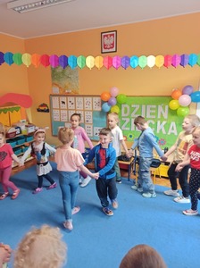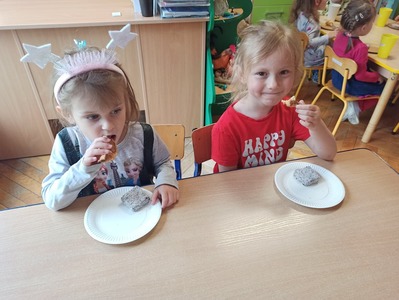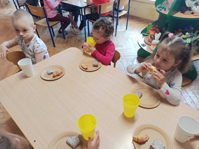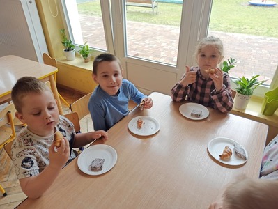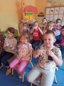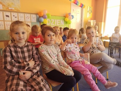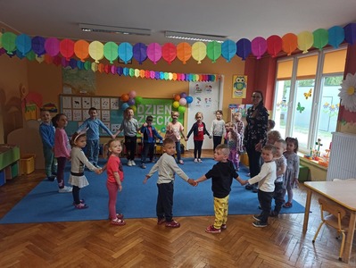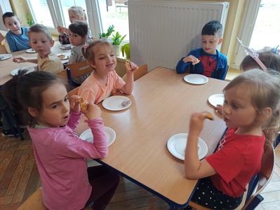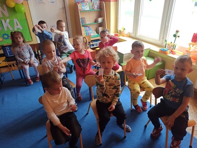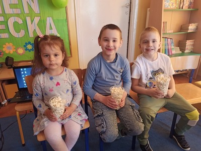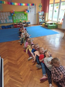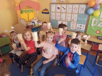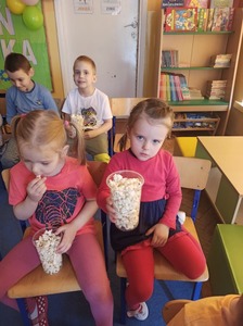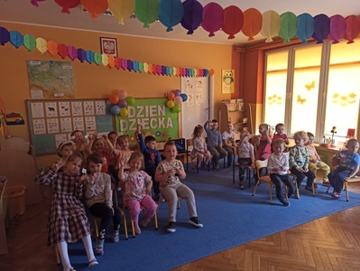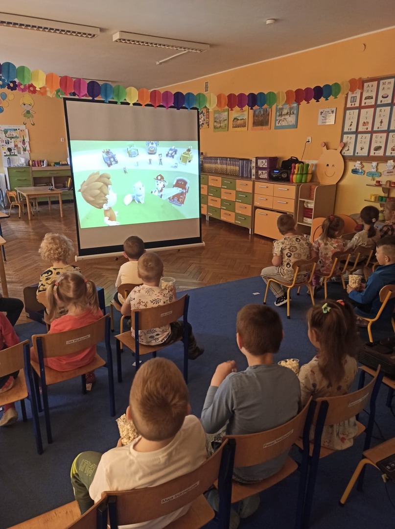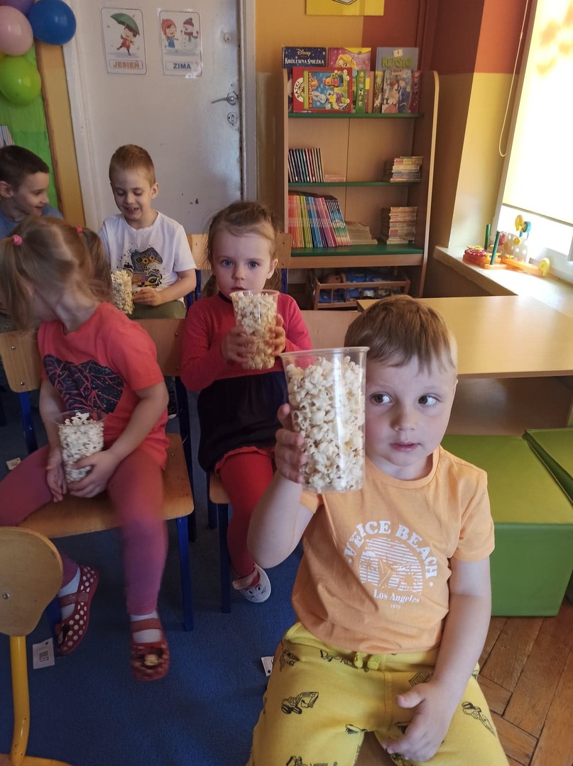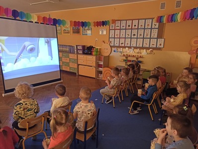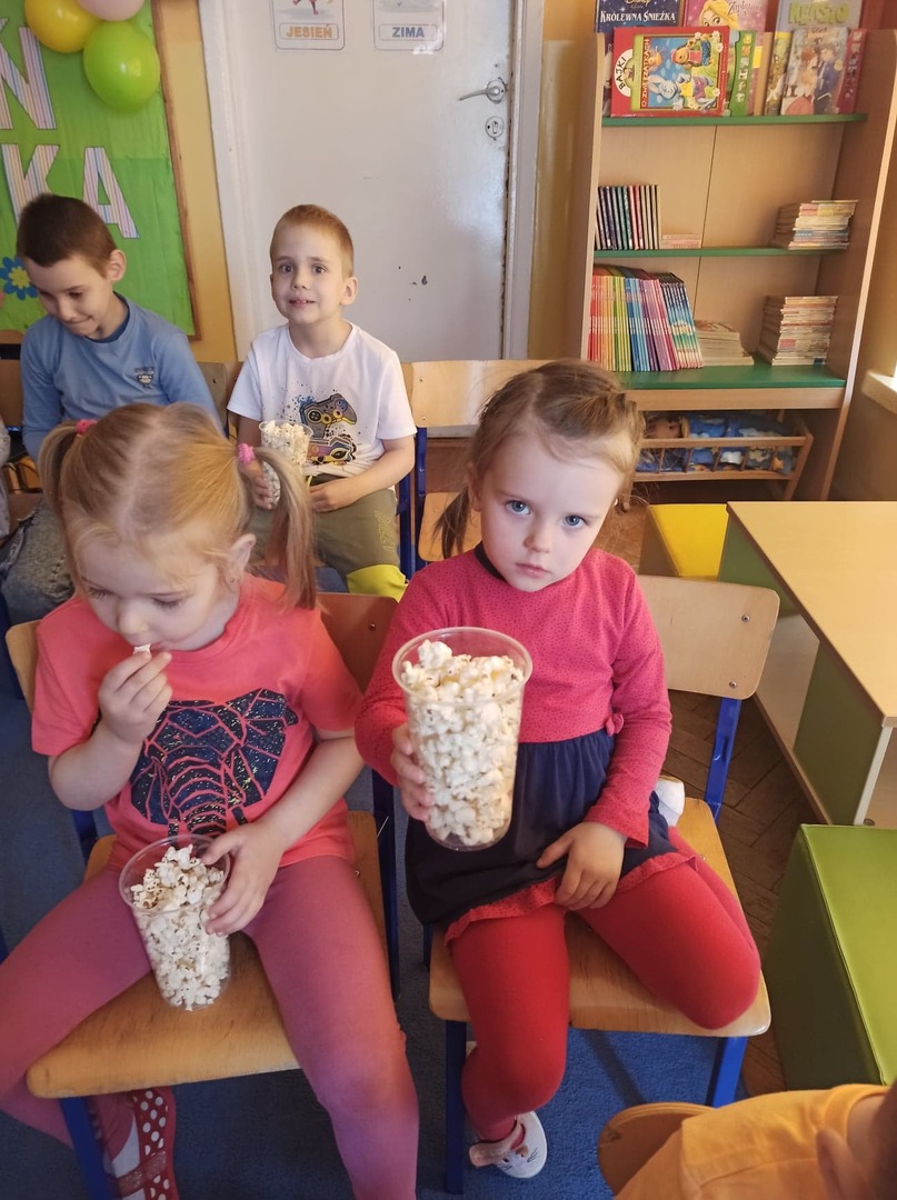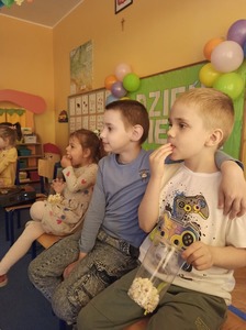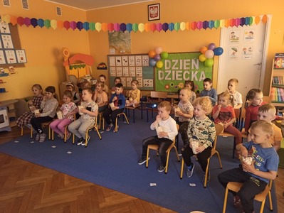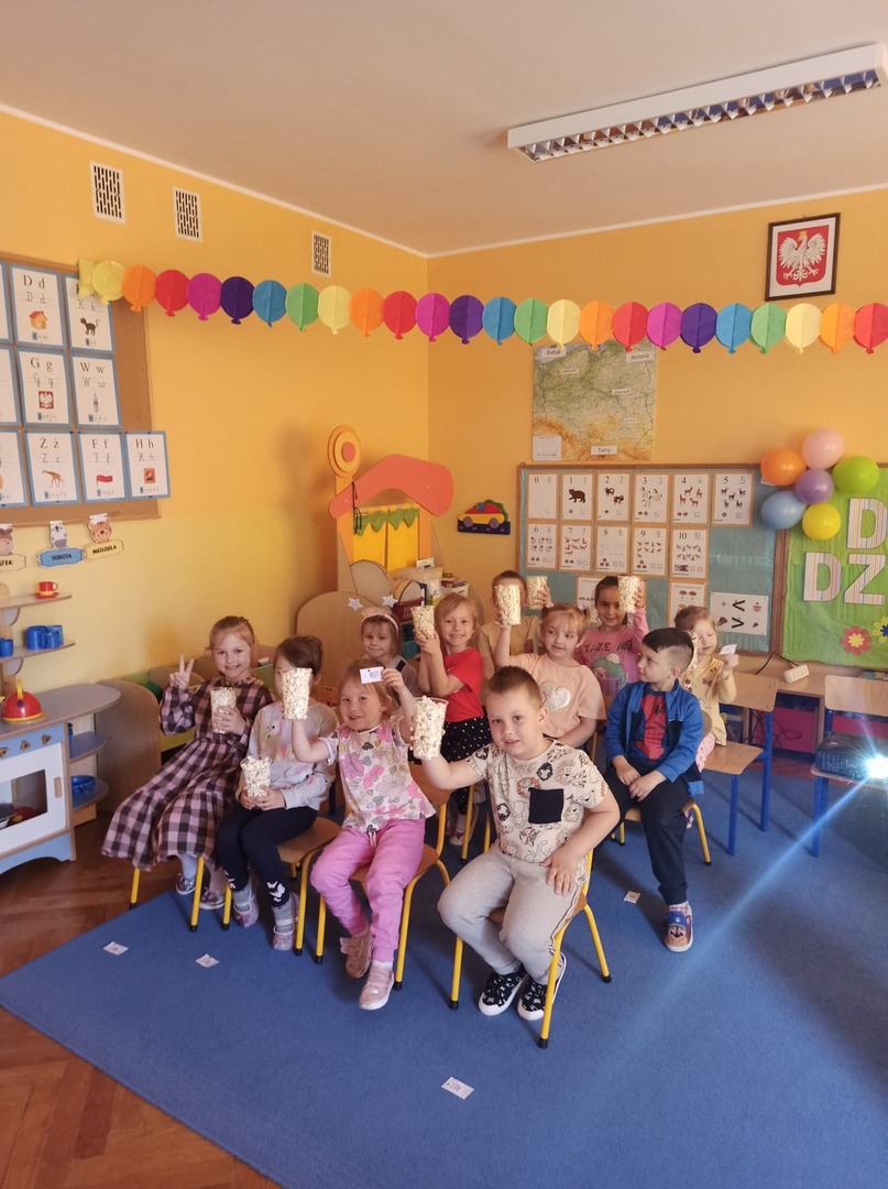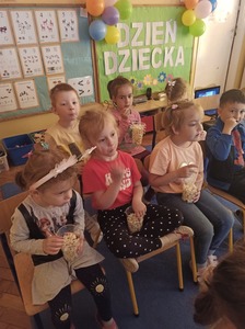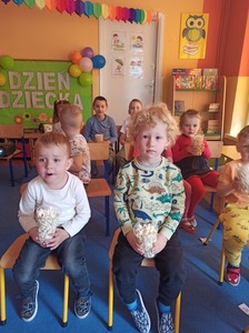 W środę 1 czerwca, dzieci z obu grup od samego rana wspólnie świętowały swoje święto - Dzień Dziecka. Przedszkolaki rozpoczęły dzień od ulubionych zabaw integracyjnych i ze śpiewem. Nie mogło zabraknąć oczywiście kultowych piosenek: "Głowa, ramiona, kolana, pięty", "Gąsienica Basi", "Rolnik sam w dolinie", "Boogie-woogie". Na ten dzień panie nauczycielki przygotowały dla dzieci coś bardzo ekscytującego... KINO! Przedszkolaki otrzymały bilety wstępu, chrupały popcorn i oglądały ulubione bajki. Po seansie filmowym na dzieci czekała jeszcze jedna przyjemność - słodki poczęstunek w formie wypieków (rogalików i kokosanek) przygotowanych przez mamę Emilki z grupy "Motylki". Ten dzień, pomimo, że deszczowy przyniósł dzieciom wiele radości.