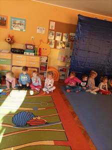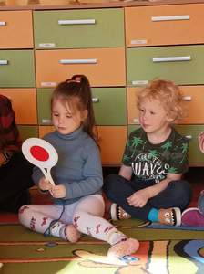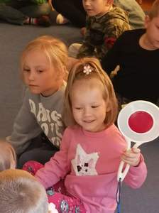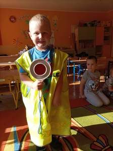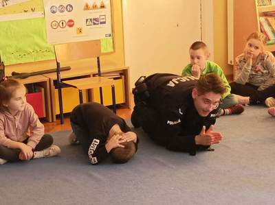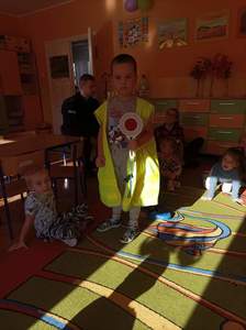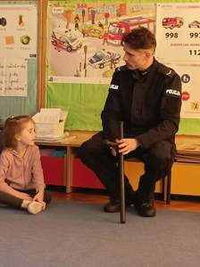 Panowie policjanci przypomnieli podstawowe zasady zachowania podczas przechodzenia przez jezdnię. Wytłumaczyli również w sposób praktyczny, jak należy się zachować w kontaktach z osobami obcymi czy w kontaktach ze zwierzętami. Przedszkolaki z dużym zainteresowaniem słuchały rad i wskazówek naszych gości, z zaciekawieniem oglądały krótkofalówkę, kajdanki, pałkę policyjną, lizak policyjny oraz kamizelkę odblaskową.