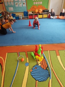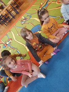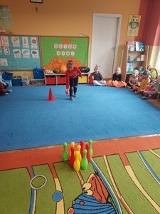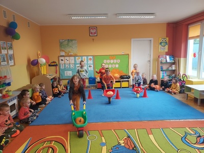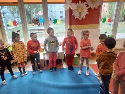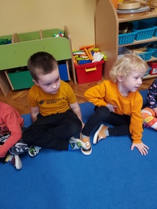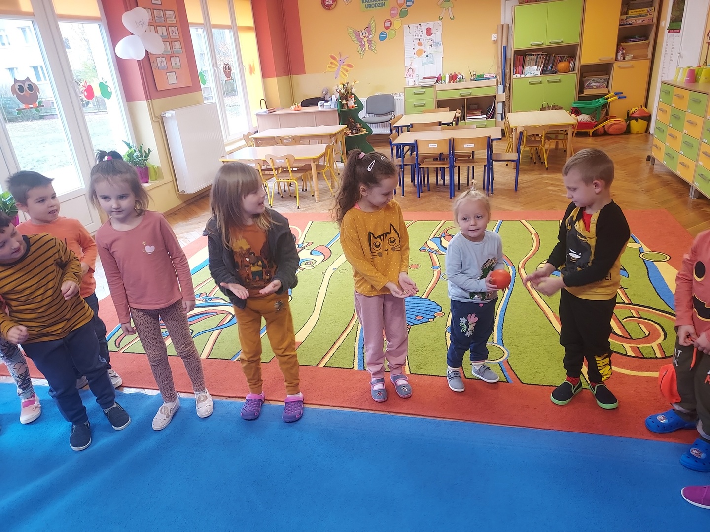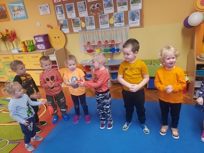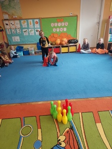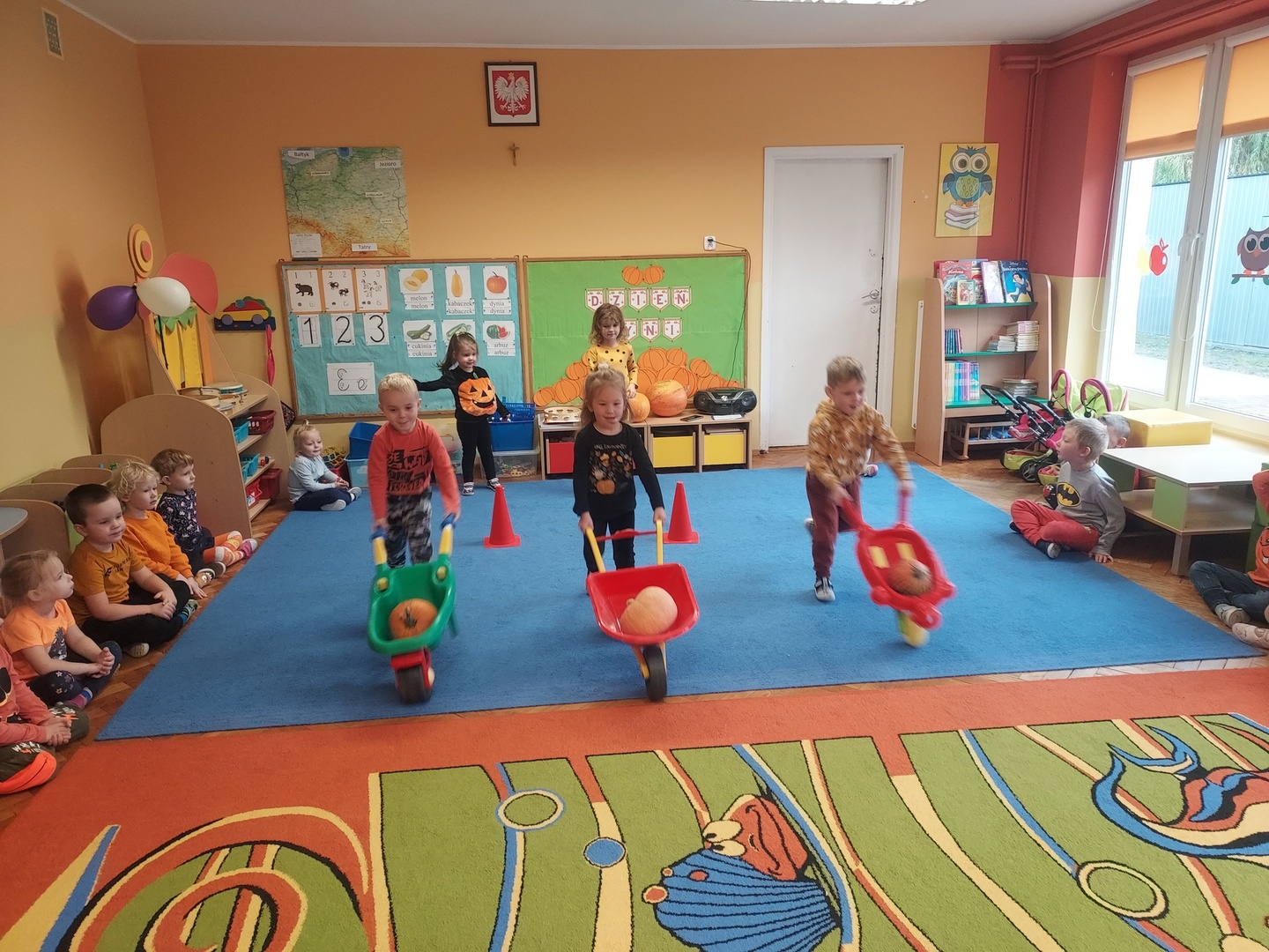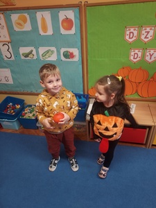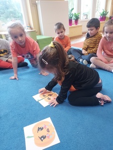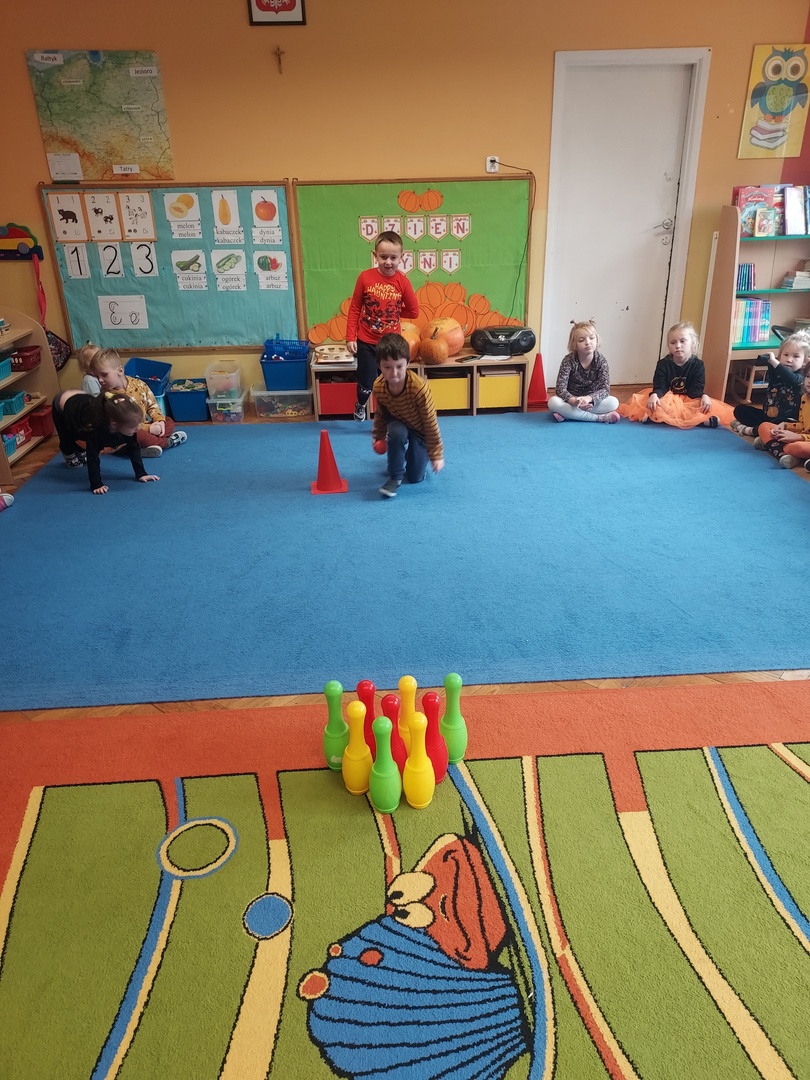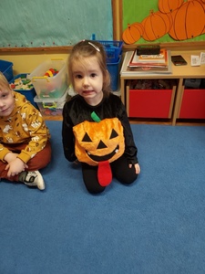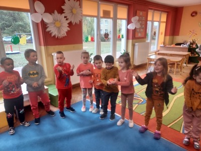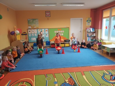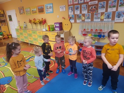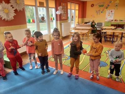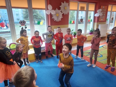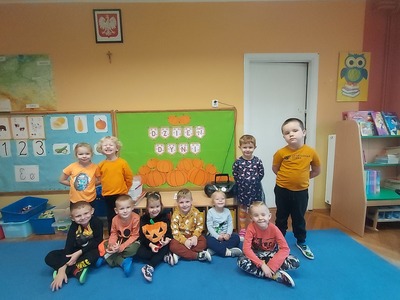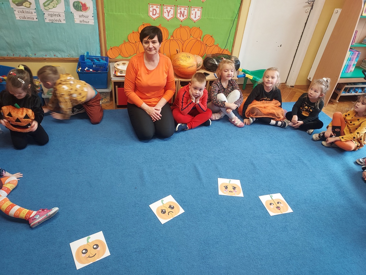 Tego dnia dzieci przyszły do przedszkola ubrane na pomarańczowo, przyniosły ze sobą dynie, które posłużyły do naszych dyniowych zabaw. Przedszkolaki poznały wartości odżywcze dyni, poznały inne warzywa i owoce należące do tej rodziny. Uczestniczyły w zabawach z udziałem dyń, np.: wędrująca dynia, wyścigi ogrodników, dyniowe kręgle. Przeliczały dynie, układały je wg wielkości. Układały dyniowe puzzle - nazywały emocje przedstawione na złożonych obrazkach oraz określały, w jakich sytuacjach odczuwają te emocje.