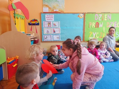 Jest taka piękna kraina, gdzie dzień się uśmiechem zaczyna. Kiedy staniemy, tak na przeciw siebie, Ty uśmiechnij się do mnie, a ja do Ciebie”. 21 listopada w naszym przedszkolu obchodziliśmy „Dzień Życzliwości”. W tym dniu dzieci zgłębiały wiedzę na temat znaczenia słowa „życzliwość”. Brały czynny udział w zabawach ruchowych np.: "Podaj serce" i powiedz coś miłego koledze lub koleżance, w zabawie w skojarzenia do pojęcia „życzliwość". Dzień Życzliwości w naszym przedszkolu był szczególny – pełen miłych słów, radości i niespodzianek. Wszyscy uroczyście przyrzekali być życzliwym każdego dnia. Dzieciom przypomniano również, że oprócz Dnia życzliwości, ważnym dniem w kalendarzu jest 20 listopad czyli Międzynarodowy Dzień Praw Dziecka. Wychowankowie przedszkola zostali zapoznani z podstawowymi informacjami o prawach dziecka: przedstawiono dzieciom prawa dziecka oraz szczegółowo je omówiono, przekazano informację o osobach i instytucjach dbających o prawa dziecka. Kilkulatkowie mieli również możliwość obejrzenia filmiku nawiązującego do praw jak i obowiązków dziecka. Jako podsumowanie dnia przedszkolaki wykonały pracę plastyczną pt."Koniczynka życzliwości".