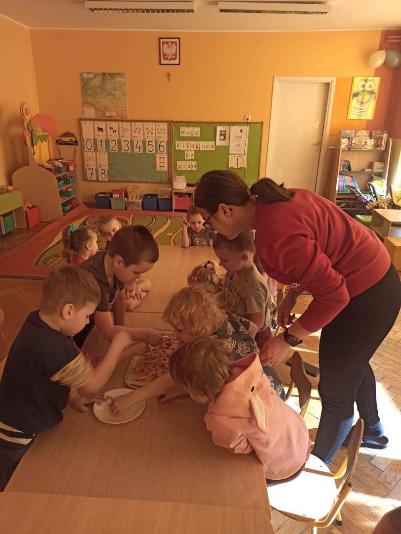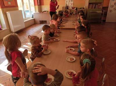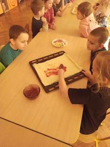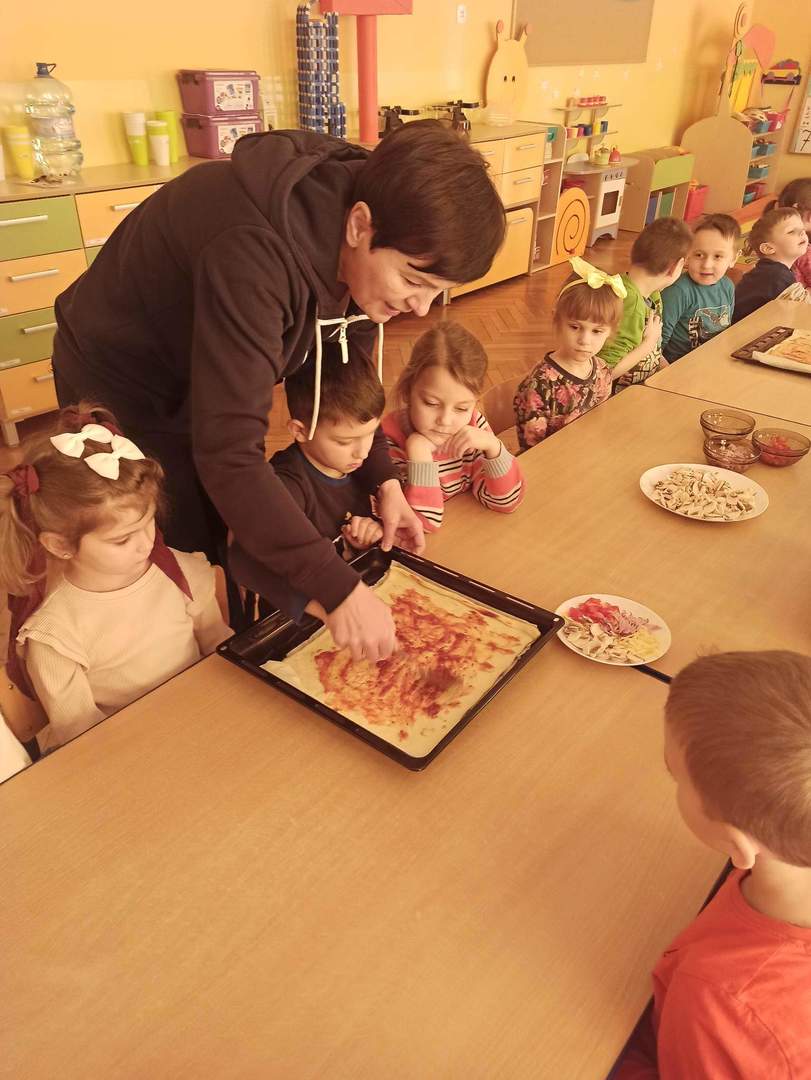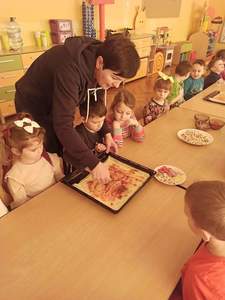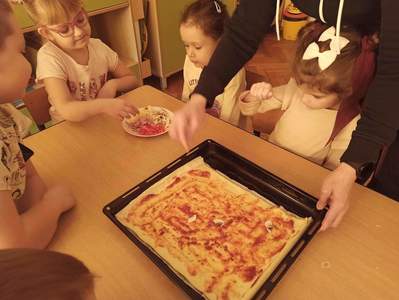 Następnie panie wraz z przedszkolakami zorganizowały warsztaty kulinarne. Dzieci z wielką starannością układały na pizzy swoje ulubione składniki np. pieczarki, paprykę, ser żółty i szynkę oraz powtarzały nazwy poznanych składników w języku polskim i angielskim. Korzystając z uprzejmości naszej Pani kucharki korzystaliśmy z przedszkolnej kuchni, by upiec wcześniej przygotowaną pizzę. Najlepsze jednak było smakowanie. Mniam…, dzieciom smakowało, domagały się dokładek. A w całym przedszkolu unosił się zapach pizzy. Później dbając o porządek wszystko pięknie posprzątaliśmy. Dzieci zatem przy okazji wykonywania pizzy nie tylko nauczyły się sztuki kulinarnej ale również dowiedziały się wielu ciekawostek o pizzy, dbały o stanowisko pracy z zachowaniem zasad higieny oraz nauczyły się pracy zespołowej i pomagania sobie wzajemnie. To był kolejny miły dzień!