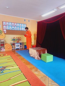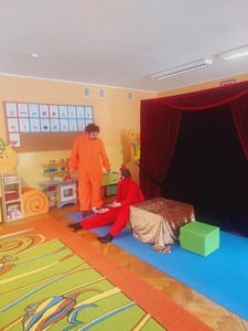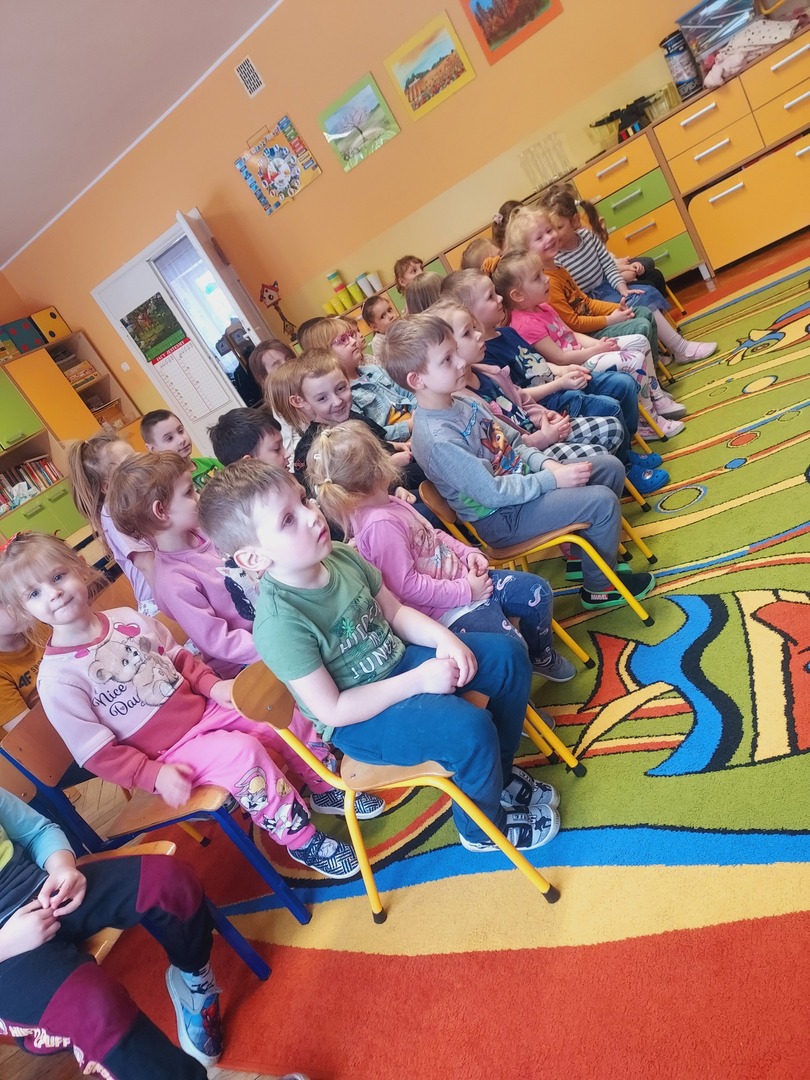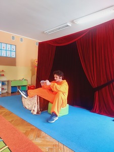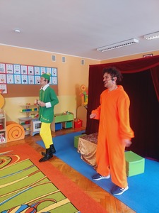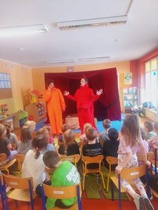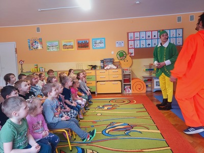 13 marca nasze przedszkole odwiedził Teatr Kurtyna z Krakowa, by zaprezentować najmniejszym widzom spektakl profilaktyczny pt.: "Tajemniczy skrzat". Bajka opowiadała o chłopcu - Piotrusiu, który był nadpobudliwy ruchowo oraz miałproblem z rozładowaniem swojej ogromnej energii ,a zapracowani rodzice nie zawsze mieli czas, by zabrać dziecko na plac zabaw. Nudząc się popołudniami uwielbiał grać w gry w taty telefonie, a wieczorami wykorzystując swój wolny czas bawił się gamepadem, który dostał na urodziny. Ponieważ wbrew prośbom rodziców robił to stosunkowo za długo to często bolały go oczy i głowa. Pewnego wieczoru podstępnie i wbrew woli rodziców, chcąc przejść kolejny etap ulubionej gry, przemycił do swojego pokoju gamepad. Kiedy pochłonięty pokonywaniem kolejnych przeszkód bawił się w najlepsze niespodziewanie odwiedził go tajemniczy gość. Był to Skrzat Franek, który zamiast przez swoją szafę trafić do baśniowego świata Narnii, przypadkiem znalazł się w szafie i pokoju Piotrusia.Skrzat Franek poprosił Piotra o pomoc w zaopiekowaniu się tajemniczym pudełkiem. Dla Skrzatów jest ono niezwykle ważne, a dodatkowo nikomu nie wolno go otworzyć. Powierzone zadanie spowodowało interesujący i zabawny splot zdarzeń, a chłopiec musiał się zmierzyć ze swoimi słabościami, a także z pokusami kolejnego nieproszonego gościa. Bajka „Tajemniczy Skrzat” zwraca uwagę na problemy współczesnych, przebodźcowanych dzieci których często jedyną rozrywką jest oglądanie filmików w telefonie lub granie na konsolach. Dzieci cierpiących na brak wspólnej zabawy z rówieśnikami i brak przebywania na świeżym powietrzu. To była niezwykle poruszająca opowieść. Dziękujemy.