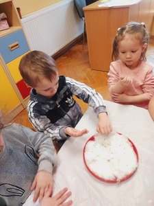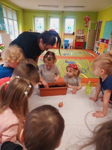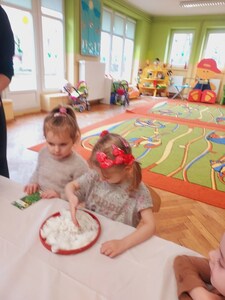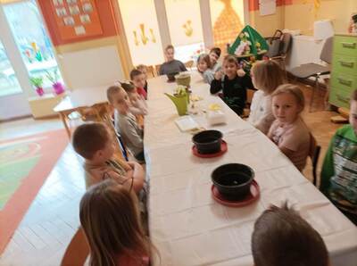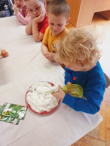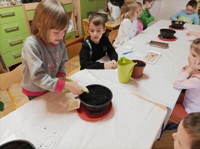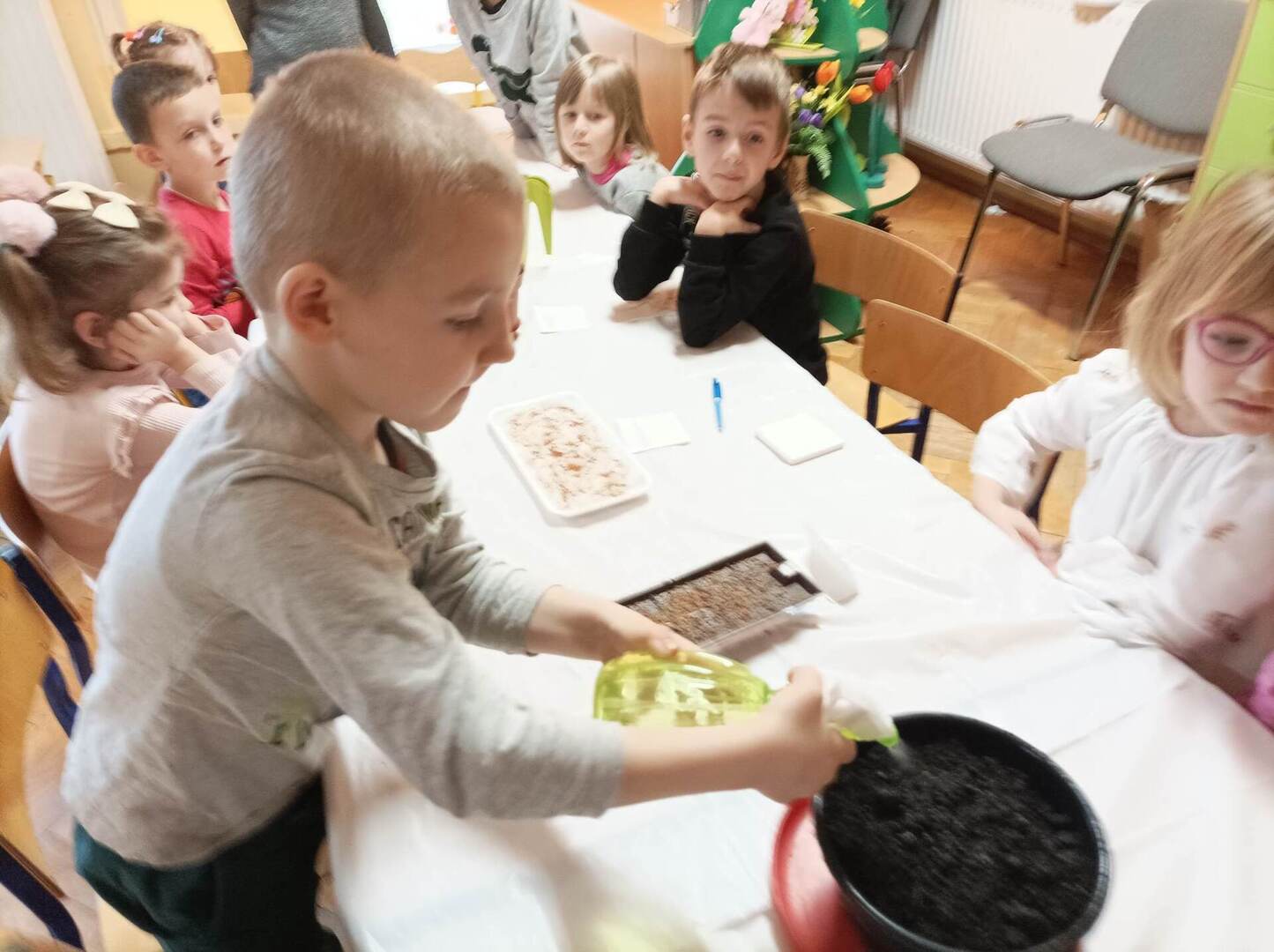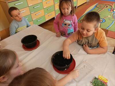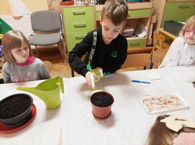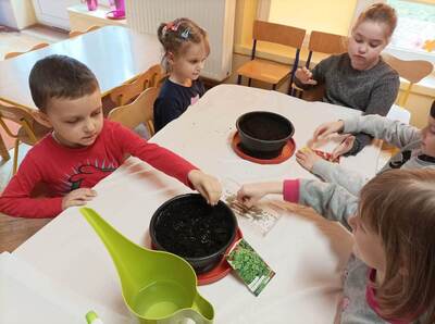 W czwartek 16 marca "Biedronki", a w piątek 17 marca "Motylki" założyły zielony ogródek w kąciku przyrody. Posadziły w doniczkach cebulę na szczypior, posiały owies, rzeżuchę oraz pietruszkę naciową.Oglądały nasiona, przyglądały się im, a nawet je wąchały, opisywały również ich wygląd. Dowiedziały się co jest potrzebne roślinom, aby mogły dobrze rosnąć. Teraz została już tylko obserwacja wzrostu roślin i systematyczne ich podlewanie.