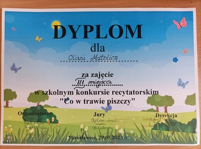 Grupę „Motylki” reprezentowała Oliwia Matolicz, która zajęła III miejsce. Oliwia zaprezentowała wiersz Wandy Chotomskiej pt. „Motyl”.