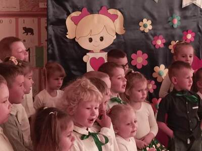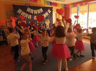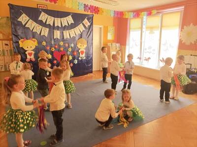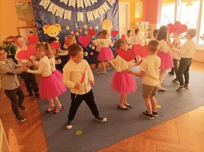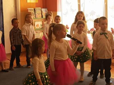 Naszych miłych gości witały dzieci, które wręczały rodzicom upominki - mamusiom wianuszki, a tatusiom różowe okulary. Wianuszki były symbolicznym życzeniem dla mam, aby zawsze były piękne i zadowolone z siebie. Różowe okulary dla tatusiów byłysymbolicznym życzeniem, aby zawsze widzieli świat na różowo, mieli duże poczucie humoru i fantastyczne pomysły na ciekawe zabawy ze swoimi pociechami. Tak udekorowani rodzice obejrzeli program artystyczny w wykonaniu „Biedronek” i „Motylków”. Wierszykami, piosenkami, tańcami i życzeniami z serca płynącymi dzieci podziękowały rodzicom za ich miłość, która zostaje jak światło na całe życie. Występom tym towarzyszyło wiele emocji okazywanych nie tylko przez dzieci, lecz także i przez rodziców. Uroczystość przebiegła w miłej i ciepłej atmosferze i na pewno na długo zapadnie w pamięci dzieci i rodziców.