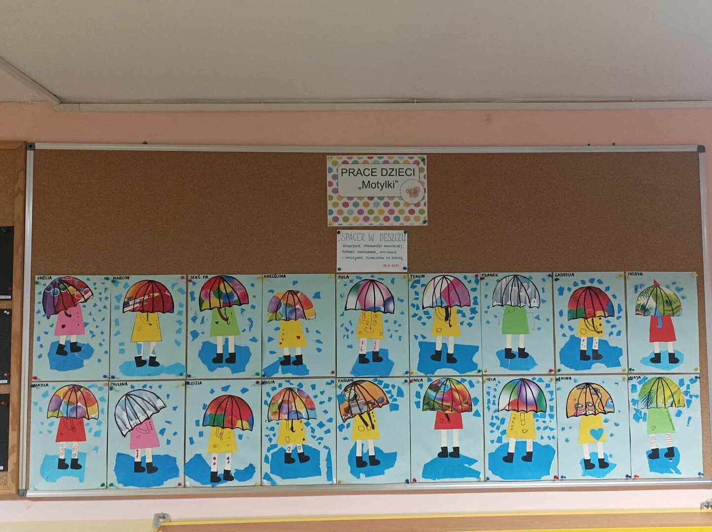 Na zakończenie zajęć wykonały wspólnie z rodzicami pracę plastyczną pt. „Spacer w deszczu”.