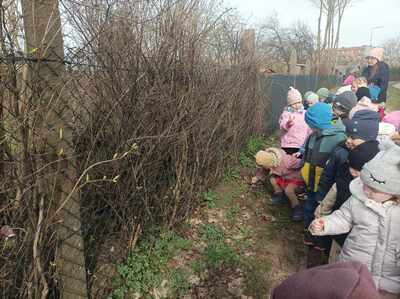 W piątek 15 marca "Biedronki" i "Motylki" wybrały się na spacer do ogródków działkowych w poszukiwaniu pierwszych oznak wiosny. Przedszkolaki miały okazję zwrócić uwagę na zmiany w przyrodzie. Obserwowały pierwsze wiosenne kwiaty, młode listki rozwijające z pąków.