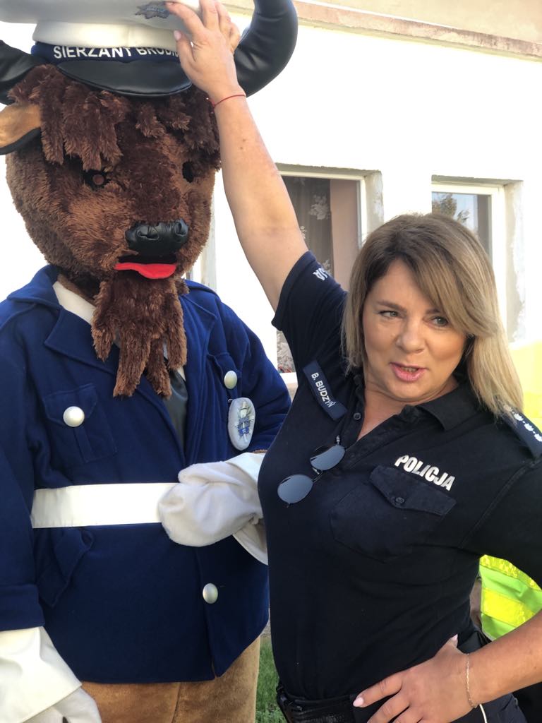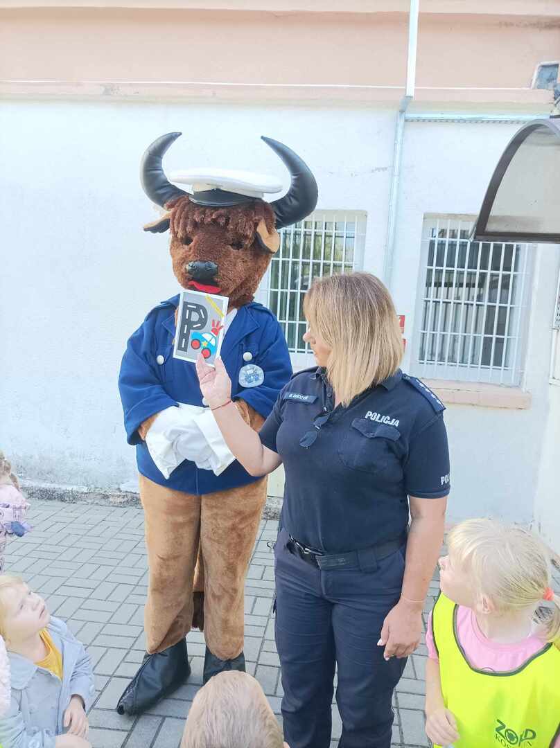 Policjanci przybyli do przedszkola w towarzystwie swojej sympatycznej maskotki – żubra Sierżanta Bródki, który od razu zdobył serca najmłodszych. Maskotka sprawiła dzieciom ogromną radość, wywołując uśmiechy na ich twarzach i dodając spotkaniu przyjaznej atmosfery.