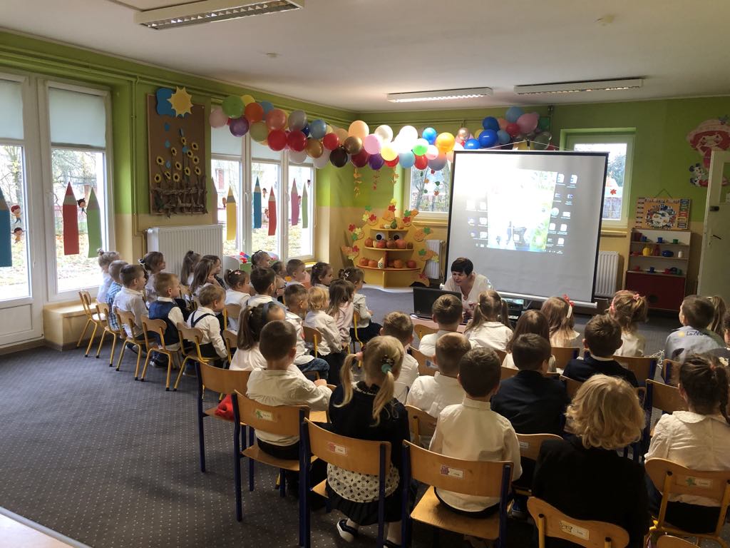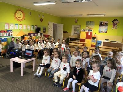 Po odśpiewaniu hymnu przedszkolaki obejrzały edukacyjny film pt. „Ala i 11 listopada”, który w przystępny sposób przybliżył im tematykę odzyskania niepodległości oraz znaczenie świąt narodowych. Dzieci z zaciekawieniem słuchały historii o Polsce i o symbolach narodowych, co było doskonałą okazją do utrwalenia wiedzy o polskiej fladze, godle oraz hymnie.